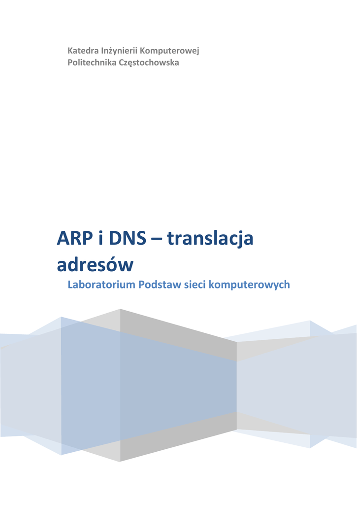 Katedra Inżynierii Komputerowej Politechnika Częstochowska ARP i DNS – translacja adresów Laboratorium Podstaw sieci komputerowych ARP i DNS – translacja adresów Cel ćwiczenia Celem dwiczenia jest zaznajomienie rolą jakie pełnią protokoły ARP i DSN. Informacje wstępne W sieciach komputerowych wykorzystujących stos protokołów TCP/IP używane są następujące poziomy adresowania urządzeo: nazwy mnemoniczne, adresy IP, adresy MAC, oraz adresowanie usług dostępnych na poszczególnych urządzeniach za pomocą numerów portów. Adresy MAC są przypisane poszczególnym interfejsom sieciowym. Są wykorzystywane do adresowania urządzeo w sieci lokalnej. W nagłówkach ramek warstwy łącza danych (np. Ethernet, Token Ring, FDDI, WiFi) występuje co najmniej adres adresata oraz nadawcy ramki. Adres taki składa się sześciu bajtów zapisywanych zwyczajowo w postaci sześciu dwucyfrowych liczb szesnastkowych, np. 00-12-56-12-fe-c3. Adresy IP, zasadniczo, również przypisuje się poszczególnym interfejsom sieciowym, chod możliwe jest również przypisanie wielu adresów do jednego interfejsu lub jednego adresu do grupy interfejsów (most). Wykorzystuje je warstwa sieciowa, która pozwala na komunikację zarówno w ramach sieci lokalnej, jak i pomiędzy sieciami. Adres IP składa się z 4 bajtów zapisywanych zwyczajowo w postaci czterech liczb, rozdzielonych kropka, np.: 217.45.22.17. W adresie IP występuje częśd określająca adres sieci oraz częśd określająca adres konkretnego urządzenia w danej sieci. Podział może byd określony elastycznie w postaci maski lub odnosząc się do klas adresów. Adresy mnemoniczne pozwalają na łatwe ich zapamiętanie i określają konkretne urządzenie w sieci. W sieci Internet stosuje się hierarchiczne nazewnictwo domenowe. Nazwa urządzenia składa się z części rozdzielonych kropkami, np. pc4.kik.pcz.czest.pl. Pierwszy element (w przykładzie pc4) to nazwa konkretnego urządzenia, który jest elementem domeny (w przykładzie kik). Domena kik jest z kolei częścią domeny nadrzędnej (w przykładzie pcz), która może byd elementem kolejnej nadrzędnej struktury (czest), itd. Wszystkie trzy wymienione określają konkretne urządzenie w sieci. Użytkownik najchętniej posługuje się adresami mnemonicznymi, lecz te nie są przydatne w odnalezieniu urządzenia w sieci. Konieczne jest ich przetłumaczenie na adresy IP. Służy do tego usługa DNS (Domain Name System) oferowana przez serwery DNS. W odpowiedzi na zapytanie zawierające nazwę mnemoniczną przekazuje przypisany jej adres IP. Hierarchiczna (domenowa) organizacja nazewnictwa pozwoliła na rozproszenie baz danych przechowujących nazwy i przyporządkowane im adresy IP. Informacje o poszczególnych domenach są przechowywane na specjalizowanych serwerach. Np. serwer odpowiadający za domenę pcz przechowuje informację o wszystkich jej poddomenach oraz zarejestrowanych w nich urządzeniach. Na podstawie adresu IP można określid konkretną podsied, w której znajduje się docelowe urządzenie. W sieci lokalnej konieczne jest wykorzystanie protokołu warstwy łącza danych oraz adresów MAC. Adres IP musi zostad zatem przetłumaczony na adres MAC odpowiedniego interfejsu. Zadanie to realizuje protokół ARP (Address Resolution Protocol). Urządzenie poszukujące adresu MAC rozgłasza zapytanie „Kto posiada dany adres IP?”, a posiadacz odpowiada używając swojego adresu MAC. Aby nie powielad zbędnych zapytao DNS i ARP, systemy operacyjne przechowują okresowo uzyskane informacje w pamięci. Do zarządzania nią służą polecenia ipconfig i arp. Oto składnia poleceo dla systemu Windows: ipconfig /? SPOSÓB UŻYCIA: ipconfig [/allcompartments] [/? | /all | Strona 2 ARP i DNS – translacja adresów /renew [karta] | /release [karta] | /renew6 [karta] | /release6 [karta] | /flushdns | /displaydns | /registerdns | /showclassid karta | /setclassid karta [identyfikator_klasy] ] gdzie karta Nazwa połączenia (dozwolone symbole wieloznaczne * i ?, zobacz przykłady) Opcje: /? /all /allcompartments /release /release6 /renew /renew6 /flushdns /registerdns /displaydns /showclassid /setclassid Wyświetla ten komunikat pomocy. Wyświetla pełne informacje o konfiguracji. Wyświetla informacje o wszystkich przedziałach. Zwalnia adres IPv4 podanej karty. Zwalnia adres IPv6 podanej karty. Odnawia adres IPv4 podanej karty. Odnawia adres IPv6 podanej karty. Przeczyszcza bufor programu rozpoznawania nazw DNS. Odświeża wszystkie dzierżawy DHCP i rejestruje ponownie nazwy DNS. Wyświetla zawartość buforu programu rozpoznawania nazw DNS. Wyświetla wszystkie identyfikatory klas DHCP dozwolone dla karty. Modyfikuje identyfikator klasy DHCP. Zachowanie domyślne to wyświetlanie tylko adresu IP, maski podsieci i bramy domyślnej dla każdej karty związanej z protokołem TCP/IP. Jeśli dla przełączników Release i Renew nie zostanie określona nazwa karty, zwolnieniu lub odnowieniu ulegną dzierżawy adresów IP dla wszystkich kart związanych z protokołem TCP/IP. Jeśli dla przełącznika Setclassid nie zostanie określony parametr identyfikator_klasy, to identyfikator_klasy zostanie usunięty. Przykłady: > ipconfig > ipconfig /all > ipconfig /renew > ipconfig /renew EL* ... ... ... ... Pokazuje informacje Pokazuje informacje szczegółowe Odnawia adresy IP wszystkich kart Odnawia adresy IP połączeń o nazwach zaczynających się od EL > ipconfig /release *lok* ... Zwalnia adresy IP wszystkich pasujących połączeń, np. "Połączenie lokalne 1" lub "Połączenie lokalne 2" > ipconfig /allcompartments ... Pokazuje informacje o wszystkich przedziałach > ipconfig /allcompartments /all ... Pokazuje informacje szczegółowe o wszystkich przedziałach arp /? Wyświetla i modyfikuje tabelę translacji adresów IP na adresy fizyczne, używane przez protokół rozróżniania adresów (ARP). ARP -s inet_addr eth_addr [if_addr] ARP -d inet_addr [if_addr] ARP -a [inet_addr] [-N