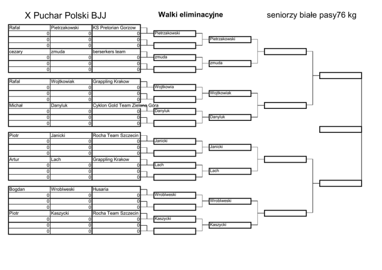 Walki eliminacyjne X Puchar Polski BJJ Rafal Pietrzakowski 0 0 0 cezary KS Pretorian Gorzow 0 0 0 zmuda 0 0 0 Rafal Wojtkowiak Michał 0 0 0 Janicki 0 0 0 Artur Lach Wojtkowia 0 0 0 Cyklon Gold Team Zielona Góra Danyluk 0 0 0 0 0 0 Rocha Team Szczecin 0 0 0 Grappling Krakow 0 0 0 0 0 0 Wojtkowiak Danyluk Janicki Janicki Lach Lach Husaria 0 0 0 Kaszycki 0 0 0 zmuda Grappling Krakow Wroblweski 0 0 0 Piotr zmuda 0 0 0 0 0 0 Bogdan 0 0 0 Pietrzakowski 0 0 0 Danyluk Piotr Pietrzakowski berserkers team 0 0 0 0 0 0 0 0 0 0 0 0 Rocha Team Szczecin 0 0 0 0 0 0 Wroblweski Wroblweski Kaszycki Kaszycki seniorzy białe pasy76 kg