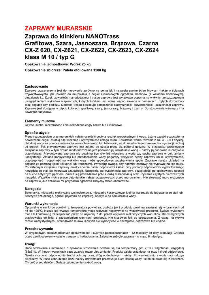ZAPRAWY MURARSKIE Zaprawa do klinkieru NANOTrass Grafitowa, Szara, Jasnoszara, Brązowa, Czarna CX-Z 620, CX-Z621, CX-Z622, CX-Z623, CX-Z624 klasa M 10 / typ G Opakowanie jednostkowe: Worek 25 kg Opakowanie zbiorcze: Paleta ofoliowana 1200 kg Zastosowanie Zaprawa przeznaczona jest do murowania zarówno na pełną jak i na pustą spoinę ścian licowych (także w ścianach trójwarstwowych), jak również do murowania z cegieł klinkierowych ogrodzeń, kominów (z wkładem kominowym), studzienek itp. Dzięki zawartości nanododatków i trassu zaprawa jest wyjątkowo odporna na wykwity, ze szczególnym uwzględnieniem wykwitów wapiennych, których źródłem jest wolne wapno zawarte w cementach użytych do budowy oraz cegłach czy podłożu. Dodatek trassu powoduje polepszenie elastyczności, przyczepności i szczelności zaprawy. Zaprawa jest dostępna w pięciu kolorach: grafitowy, szary, jasnoszary, brązowy i czarny. Do stosowania wewnątrz i na zewnątrz budynków. Elementy murowe Czyste, suche, niezmrożone i nieuszkodzone cegły licowe lub klinkierowe. Sposób użycia Przed rozpoczęciem prac murarskich należy oczyścić cegły z resztek produkcyjnych i kurzu. Luźne cząstki pozostałe na powierzchni cegieł osłabią siłę wiązania i wytrzymałość całego muru. Zawartość worka rozrobić z ok. 3 - 3,5 l czystej, chłodnej wody za pomocą mieszadła wolnoobrotowego lub betoniarki, aż do uzyskania jednakowej konsystencji, wolnej od grudek. Tak przygotowana zaprawa jest zdatna do użycia przez ok. półtorej godziny. W przypadku częściowego związania zaprawy w tym czasie niedopuszczalne jest ponowne jej rozrabianie wodą – należy ją ponownie intensywnie przemieszać. Przygotowana zaprawa nie powinna być również mieszana z wodą czy suchą zaprawą w celu zmiany konsystencji. Zmiana konsystencji lub przedozowanie wody pogorszy wszystkie cechy zaprawy (m.in. wytrzymałość, przyczepność i odporność na wykwity) oraz może spowodować przebarwienia spoin. Zaprawę należy układać na cegłach za pomocą kielni trójkątnej lub trapezowej, zwracając uwagę, aby nadmiar zaprawy nie wypływał na lico muru. Po wstępnym związaniu zaprawy należy spoinie nadać odpowiedni kształt przy pomocy odpowiednio wyprofilowanego narzędzia ze stali lub tworzywa sztucznego. Następnie, po wyschnięciu zaprawy, pozostałości po spoinowaniu usunąć na sucho sztywnym pędzlem. Zaleca się prowadzenie prac z dużą starannością oraz używanie czystych nierdzewnych narzędzi. Wszelkie mokre prace betoniarskie należy przeprowadzić przed murowaniem. Nie stosować muru ułożonego na zaprawie jako szalunku. W przypadku ogrodzeń zbrojony rdzeń obmurować. Narzędzia Betoniarka, mieszarka elektryczna wolnoobrotowa, mieszadło koszyczkowe, kielnia, narzędzia do fugowania ze stali lub tworzywa sztucznego, pędzel, pojemnik na zaprawę, naczynie do odmierzania wody. Warunki wykonania Optymalne warunki do obróbki, tj. temperatura powietrza, podłoża jak i produktu powinna zawierać się w granicach od +5 do +25°C. Niższa lub wyższa temperatura może wpływać negatywnie na właściwości produktu. Świeżo wykonany mur lub konstrukcję zabezpieczać przez co najmniej 7 dni przed wpływem niekorzystnych warunków atmosferycznych przykrywając go folią, z zapewnieniem wentylacji powietrza. Nie stosować folii do streczowania. Z uwagi na ryzyko różnic kolorystycznych i przebarwień murów licowych nie wykonywać w dni mgliste, deszczowe lub upalne. Przechowywanie W oryginalnych, nieuszkodzonych opakowaniach i suchych pomieszczeniach – 12 miesięcy od daty produkcji. Chronić przed zawilgoceniem w czasie transportu i składowania. Zalecane zużycie zaprawy - w ciągu 6 miesięcy. Uwagi Dane techniczne i informacje o sposobie stosowania podane są dla temperatury (20±2)°C i wilgotności względnej (65±5)%. W innych warunkach czas zużycia może ulec zmianie. Produkt działa drażniąco na oczy i drogi oddechowe. Należy stosować odpowiednie środki ochrony oczu, dróg oddechowych i skóry. Po wymieszaniu z wodą daje odczyn alkaliczny. W razie zabrudzenia oczu należy natychmiast przemyć je dużą ilością wody i skontaktować się z lekarzem. Chronić przed dziećmi. Świeże zabrudzenia czyścić wodą. Powyższe informacje są opisem produktu. Należy je traktować jako ogólne wskazówki w oparciu o nasze badania i doświadczenia praktyczne, które jednak nie uwzględniają wymogów konkretnego przypadku zastosowania. W związku z tym zalecamy przeprowadzenie prób. Parametry produktu mogą ulec drobnym zmianom w zakresie deklarowanej klasy nie wpływając na właściwości użytkowe i obróbkę. Z podanych informacji nie wynikają jakiekolwiek roszczenia odszkodowawcze. Producent nie odpowiada za szkody wynikłe z nieumiejętnego lub niezgodnego z przeznaczeniem użycia wyrobu. Zalecenia ogólne Prace murarskie prowadzić zgodnie z zasadami sztuki budowlanej, normami i przepisami BHP. Dane techniczne Skład: mieszanina cementu, wyselekcjonowanych kruszyw, tufu wulkanicznego (trassu), nanododatków oraz dodatków mineralnych i domieszek Gęstość nasypowa ok. 1,66 kg/dm3 Właściwa ilość wody od 3 do 3,5 dm3/25 kg ok. 0,13 dm3/kg Czas zużycia ok. 1,5 godz. Wytrzymałość na ściskanie ≥ 10 MPa Początkowa wytrzymałość na ścinanie* ≥ 0,15 MPa Wydajność ok. 18 dm3 z 25 kg ok. 0,72 dm3 z 1 kg Zużycie przy spoinie 10 mm w zależności od grubości muru, dla: ½ cegły pełnej (12 cm)** 1 cegły pełnej (25 cm)** ok. 35 kg/m² ok. 85 kg/m² Zawartość chlorków <0,02 %Cl Reakcja na ogień klasa A1 Absorpcja wody 2 0,5 ≤ 0,12 kg/(m ×min ) Współczynnik przepuszczalności pary wodnej, µ* 15/35 Trwałość mrozoodporna * wartość tabelaryczna ** murowanie na pełną spoinę i bez strat materiałowych Symbole i kolory: CX-Z620 grafitowa CX-Z621 szara CX-Z622 jasnoszara CX-Z623 brązowa CX-Z624 czarna Na wyrób wystawiono deklarację zgodności. Certyfi