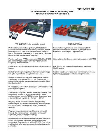 PORÓWNANIE FUNKCJI PRZYRZĄDÓW: MICROVIP3 Plus i VIP SYSTEM 3 VIP SYSTEM 3 jako analizator energii MICROVIP3 Plus Podświetlany wyświetlacz graficzny LCD (256x64) pozwala wyświetlać liczbowe wyniki pomiarów, kształt przebiegów oraz spektrum harmonicznych napięcia i prądu. Klawiatura składa się z 17 przycisków i pozwala łatwo i szybko konfigurować przyrząd. Podświetlany wyświetlacz alfanumeryczny LCD pozwala wizualizować liczbowe wyniki pomiarów. Klawiatura złożona jest z 3 przycisków. Pamięć statyczna RAM o pojemności 128kB lub 512kB jest oferowana jako opcjonalny zewnętrzny moduł nazywany „Memory Pack”. Wewnętrzna standardowa pamięć ma pojemność 1MB. Port RS232 ma maksymalną szybkość transmisji 9600 bodów. Port RS232 ma maksymalną szybkość transmisji 38400 bodów. Kształty przebiegów i spektrum harmonicznych mogą być tylko wyświetlane na wyświetlaczu LCD. Kształty przebiegów i spektrum harmonicznych mogą być tylko drukowane na wbudowanej drukarce. Istnieje możliwość podłączenia zewnętrznej drukarki szeregowej poprzez port RS232 lub zewnętrznej drukarki równoległej poprzez opcjonalny moduł „Black Box Centronics”. W połączeniu z modułem „Black Box LmA” możliwy jest pomiar prądu upływu. Zewnętrzny opcjonalny moduł „Black Box General Use” pozwala na pomiar innych typów wielkości przez podłączenie do wejścia AUX interfejsu dowolnego typu o standardowym wyjściu 0 – 1V lub 4 – 20mA. Przyrząd może podawać wartość mocy biernej koniecznej do wykonania kompensacji współczynnika mocy (cos ϕ) do zadanej (za pomocą klawiatury) wartości. Przyrząd zawiera osobne liczniki energii czynnej i biernej, dla maksymalnie 4 zakresów taryfowych (wybieranych za pomocą klawiatury). Możliwe jest wykonanie automatycznej serii pomiarów. Czasy początkowe i końcowe takiej serii ustawia użytkownik. Odmiennie niż w MICROVIP3 Plus, gdzie możliwe jest tylko ręczne uruchomienie i zatrzymanie pomiarów. TIME-NET / VIP3SYS3 ver. 01 / 2001-06-29 Możliwe jest drukowanie mikroprzerw sieciowego napięcia zasilającego, trwających od 2,5ms do 1s, oraz przerw dłuższych niż 1s. W przypadku zapamiętywania pomiarów w module „Memory Pack” mikroprzerwy również są zapamiętywane. Jest możliwy wydruk wartości pomiarowych zgromadzonych w module „Memory Pack” bezpośrednio na zewnętrznej drukarce. Walizka przyrządu jest mocna, wykonana z aluminium a nie z plastiku jak dla zestawu MICROVIP3 Plus. Przyrząd jest wyposażony w dwa przekaźniki załączane gdy wybrane parametry przekroczą ustalony minimalny lub maksymalny próg alarmu. Będzie również wykonany wydruk daty i godziny wejścia i wyjścia ze stanu alarmu wraz z największą (lub najmniejszą) wartością osiągniętą podczas jego trwania. VIP SYSTEM 3 jako analizator harmonicznych MICROVIP3 Plus Praca w trybie analizatora harmonicznych jest alternatywą dla funkcji analizatora energii i jest możliwa po wyposażeniu przyrządu w opcjonalny, zewnętrzny moduł „Black Box Harmonics”. Pomiar harmonicznych jest standardową funkcją przyrządu. Wielkości odwołujące się do harmonicznych i współczynników zniekształceń są obliczane co 10 sekund dla 1 fazy i co 20 sekund dla pomiarów trójfazowych i wszystkie one są liczone na podstawie tych samych próbek zapamiętanych przed obliczeniami. Wielkości odwołujące się do harmonicznych są obliczane jedna po drugiej (na podstawie różnych próbek) przez 24 sekundy. Wielkości odwołujące się do zniekształceń harmonicznych (THD) są zatem odświeżane i wyświetlane zgodnie z obliczeniami harmonicznych. Oprócz standardowych pomiarów przyrząd wykonuje klasyfikację statystyczną amplitud osiąganych przez harmoniczne prądu i napięcia - dla każdej z 5 wybranych harmonicznych pokazuje % czasu pomiarów przez który amplituda zawierała się w jednym z 7 (ustalanych przez użytkownika przedziałów) amplitudy. Aby odczytać wszystkie zmierzone wartości harmonicznych konieczne jest sporządzenie wydruku (czas wydruku: około 2 minut), gdyż wielkości te nie są wyświetlane na LCD ani zapamiętywane w pamięci pomiarów. Wyświetlacz LCD pokazuje przebiegi trójfazowych napięć i prądów oraz odnoszące się do nich spektrum harmonicznych (wykres słupkowy). Kształty przebiegów napięć i prądów mogą być drukowane na drukarce, nie są natomiast wyświetlane na wyświetlaczu LCD. Jeżeli przyrząd jest używany jako analizator harmonicznych, nie jest możliwa komunikacja z komputerem PC. transfer danych jest możliwy tylko przez użycie opcjonalnego modułu „Memory Pack”, który przechowuje wszystkie dane zebrane podczas automatycznej serii pomiarowej i pozwala na przeniesienie ich do PC poprzez Memory Pack Parallel Interface (MPPII). Ponieważ analiza harmonicznych jest wbudowana standardowo w przyrząd, komunikacja z PC jest zawsze możliwa. Możliwe jest przesłanie do PC wszystkich wyników pomiarów wartości skutecznych w formacie kompatybilnym z VIPVIEW, lub kształtu przebiegów (próbek) napięć i prądów w celu obróbki na zewnętrznym programie. 2 Oprogramowanie do współpracy z VIP SYSTEM3: Oprogramowanie do współpracy z MICROVIP3: VIP UTILIES 3.0: do trybu analizatora energii; MV3DU (MicroVip3 Downloading Utilities) służy do wizualizacji kształtu przebiegów, wartości skutecznych oraz do przesyłania danych zgromadzonych we wbudowanej pamięci przyrządu do komputera. Wersja 2.0 programu umożliwia także eksport danych w formacie tekstowym; HARMONICS UTILITIES: pod Win 9x, do trybu analizatora harmonicznych. MICROWIN to kompletny, rozbudowany program do odczytu i przetwarzania danych pomiarowych pod Windows 95/98/NT/2000. VIP SYSTEM3 jako analizator energii: 147 pomiarów ZARÓWNO na ekranie LCD JAK I na wbudowanej drukarce. Pomiary sumaryczne: Napięcie równoważne symetrycznego układu 3-fazowego; Prąd równoważny symetrycznego układu 3-fa