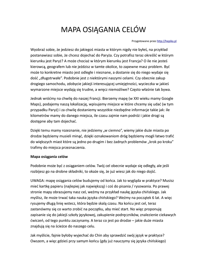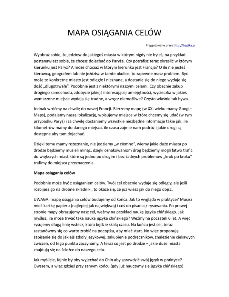 MAPA OSIĄGANIA CELÓW Przygotowane przez http://hepika.pl Wyobraź sobie, że jedziesz do jakiegoś miasta w którym nigdy nie byłeś, na przykład postanawiasz sobie, że chcesz dojechać do Paryża. Czy potrafisz teraz określić w którym kierunku jest Paryż? A może chociaż w którym kierunku jest Francja? O ile nie jesteś kierowcą, geografem lub nie jeździsz w tamte okolice, to zapewne masz problem. Być może to konkretne miasto jest odległe i nieznane, a dostanie się do niego wydaje się dość „długotrwałe”. Podobnie jest z niektórymi naszymi celami. Czy obecnie zakup drogiego samochodu, zdobycie jakiejś interesującej umiejętności, wycieczka w jakieś wymarzone miejsce wydają się trudne, a wręcz niemożliwe? Często właśnie tak bywa. Jednak wróćmy na chwilę do naszej Francji. Bierzemy mapę (w XXI wieku mamy Google Maps), podajemy naszą lokalizację, wpisujemy miejsce w które chcemy się udać (w tym przypadku Paryż) i za chwilę dostaniemy wszystkie niezbędne informacje takie jak: ile kilometrów mamy do danego miejsca, ile czasu zajmie nam podróż i jakie drogi są dostępne aby tam dojechać. Dzięki temu mamy rozeznanie, nie jedziemy „w ciemno”, wiemy jakie duże miasta po drodze będziemy musieli minąć, dzięki oznakowaniom dróg będziemy mogli łatwo trafić do większych miast które są jedno po drugim i bez żadnych problemów „krok po kroku” trafimy do miejsca przeznaczenia. Mapa osiągania celów Podobnie może być z osiąganiem celów. Twój cel obecnie wydaje się odległy, ale jeśli rozbijesz go na drobne składniki, to okaże się, że już wiesz jak do niego dojść. UWAGA: mapę osiągania celów budujemy od końca. Jak to wygląda w praktyce? Musisz mieć kartkę papieru (najlepiej jak największą) i coś do pisania / rysowania. Po prawej stronie mapy obrazujemy nasz cel, weźmy na przykład naukę języka chińskiego. Jak myślisz, ile może trwać taka nauka języka chińskiego? Weźmy na początek 6 lat. A więc rysujemy długą linię wstecz, która będzie skalą czasu. Na końcu jest cel, teraz zastanówmy się co warto zrobić na początku, aby mieć start. No więc proponuję zapisanie się do jakiejś szkoły językowej, zakupienie podręczników, znalezienie ciekawych ćwiczeń, od tego punktu zaczynamy. A teraz co jest po drodze – jakie duże miasta znajdują się na ścieżce do naszego celu. Jak myślicie, fajnie byłoby wyjechać do Chin aby sprawdzić swój język w praktyce? Owszem, a więc gdzieś przy samym końcu (gdy już nauczymy się języka chińskiego) rysujemy duży punkt z napisem „wyjazd do Chin”. Ale samo postanowienie nie wystarczy, trzeba się zastanowić czego taki wyjazd będzie wymagał. Zapewne środków finansowych, powiedzmy 15 000 zł na bilety, wyżywienie noclegi, przewodnika i inne kwestie związane z wyjazdem. Zastanówmy się jak je zdobyć. Jedną możliwością (drogą) może być oszczędzanie, odkładanie kilkuset złotych miesięcznie. Jeśli mówimy o 6 latach, to należy odkładać około 200 zł miesięcznie na w/w wyjazd. Kolejnymi kwestiami o jakich musimy pamiętać, to wiza czy sprawy organizacyjne i taką odnogę należy dołączyć do naszego wyjazdu na mapie. A może zamiast organizować wszystko samemu, skorzystamy z oferty pośrednika, który być może będzie droższy finansowo, ale zaoszczędzi nam sporo czasu i „zamieszania” - czemu by nie narysować takiej odnogi – jest to alternatywa dla naszej mapy. W tym momencie może się okazać, że jednak nie jesteś w stanie odkładać 200 zł na wycieczkę do Chin, ponieważ po opłaceniu rachunków, masz jedynie 100 zł na nieprzewidziane wydatki i po prostu nie da się tego wpłacić na Twoje marzenia. Co zatem zrobisz? Poddasz się? A może warto spróbować poszukać rozwiązania na mapie? Co jest do zrobienia aby zaoszczędzić 200 zł. Być może okaże się, że pewne wydatki które masz dotychczas, są zbędne – za wysoki abonament telewizyjny, niepotrzebny dodatkowy telefon, albo rozrzutny tryb życia. Po przeanalizowaniu tego wyjdzie, że możesz zaoszczędzić nie 200, a 300 zł lub więcej. (Pamiętaj, że cały czas pracujemy na przykładzie). Po narysowaniu takiej odnogi – możliwości trasy, okazuje się że zamiast oszczędzania, które jakoś Ci nie odpowiada, wolisz poszukać dodatkowych środków, a więc jest szansa na zmianę pracy lub dodatkowe zajęcie (praca dorywcza), dorysuj odnogę do punktu jakim jest 15 000 zł, które musisz zdobyć w niecałe 6 lat. Nie chcesz nowej pracy, a oszczędzanie Cię nie motywuje? Dorysuj odnogę z kredytem, który możesz rozbić na 10 a nawet więcej lat. Załóżmy że tych możliwości było kilka, wiesz już jak dojechać do wycieczki do Chin, ale po drodze jest jeszcze żmudna nauka. Często zabraknie Ci motywacji (Twój pojazd stanie na bezdrożu), zabraknie Ci czasu, pieniędzy itd. Jak temu zapobiegać. Otóż do każdej takiej „ślepej uliczki” warto mieć alternatywną drogę. Pamiętaj że na prawdziwej drodze też zdarzają się wypadki, korki, remonty dróg, ale zawsze znajdzie się objazd, laweta, pomoc drogowa. Tak samo musi być z Twoją mapą osiągania celów. Jeśli okaże się, że w Twoim mieście nie ma szkoły językowej, która uczyłaby chińskiego, zastanów się co można zrobić w takiej sytuacji. Jedna odnoga to szukanie w mieście obok, jednak to wiąże się z dodatkowym czasem, dojazdem i pewnym poświęceniem, ale zastanów się co można zrobić aby ułatwić sobie tę możliwość. Kolejną alternatywą może być też nauka przez internet, prawdopodobnie są szkoły które zajmują się takim kształceniem, a więc zaproponuj sobie także tę ścieżkę. Myśl dalej co jeszcze możesz robić, aby przybliżyć się do swojego celu. Może warto znaleźć znajomych z Chin, choćby za pomocą internetu. Można to zrobić na wielu portalach, które są przeznaczone do wspólnej nauki języków – taki