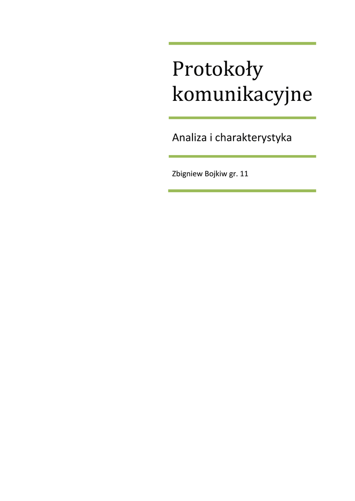 Protokoły komunikacyjne Analiza i charakterystyka Zbigniew Bojkiw gr. 11 Zawartość Wprowadzenie ........................................................................................................................................ 3 Charakterystyka wybranych protokołów komunikacyjnych ................................................................... 3 Protokół ARP........................................................................................................................................ 3 Warstwa TPC/IP ............................................................................................................................... 3 Zastosowanie ................................................................................................................................... 3 Protokół ICMP ..................................................................................................................................... 3 Warstwa TPC/IP ............................................................................................................................... 3 Zastosowanie ................................................................................................................................... 4 Protokół DNS ....................................................................................................................................... 4 Zastosowanie ................................................................................................................................... 4 Protokół FTP ........................................................................................................................................ 4 Warstwa TPC/IP ............................................................................................................................... 4 Zastosowanie ................................................................................................................................... 4 Odnajdywanie adresu MAC bramy sieciowej za pomocą protokołu ARP ............................................... 4 Log przechwyconych pakietów........................................................................................................ 4 Opis poszczególnych pozycji logu .................................................................................................... 4 Ping .......................................................................................................................................................... 5 Ping do stacji z tej samej podsieci ....................................................................................................... 5 Logi przechwyconych pakietów....................................................................................................... 5 Opis poszczególnych pozycji logu .................................................................................................... 5 Ping dla stacji z innej podsieci przy użyciu adresu domenowego ...................................................... 6 Logi przechwyconych pakietów....................................................................................................... 6 Opis poszczególnych pozycji logu .................................................................................................... 6 FTP ........................................................................................................................................................... 7 Logowanie do serwera FTP przy użyciu adresu domenowego............................................................ 7 Logi przechwyconych pakietów....................................................................................................... 7 Opis poszczególnych pozycji logu .................................................................................................... 8 Przesyłanie pliku na serwer ............................................................................................................... 12 Logi przechwyconych pakietów..................................................................................................... 12 Opis poszczególnych pozycji logu .................................................................................................. 13 Wnioski .................................................................................................................................................. 17 str. 2 Wprowadzenie Praca ta ma na celu charakterystykę i analizę działania wybranych protokołów komunikacyjnych. Aby osiągnąd cel autor pracy analizuje protokoły za pomocą analizatora sieciowego Wireshark umożliwiającego dokładną analizę przesyłanych danych w podsieci, do której jest podłączony komputer. W kolejnych rozdziałach pracy znajduje się charakterystyka wybranych protokołów sieciowych oraz przykłady zastosowania tych protokołów będące podstawą do analizy ich działania. Każdy z przykładów posiada własny log z programu Wireshark pokazujący ruch pakietów sieciowych w obrębie danej operacji. Wszystkie przykłady wykonane zostały w lokalnej sieci domowej składającej się z kilku komputerów połączonych do sieci Internet za pomocą routera posiadającego publiczny, zmienny adres IP Uwaga: Dane takie jak adresy fizyczne MAC, nazwy użytkowników, hasła oraz inne dane, których autor nie chce lub nie może ujawniad, zostały odpowiednio ocenzurowane. Charakterystyka wybranych protokołów komunikacyjnych W niniejszej pracy wykorzystano 4 protokoły internetowe, które są powszechnie wykorzystywane przy komunikacji pomiędzy urządzeniami w sieci i przedstawiono ich działanie na przykładzie kilku, często wykonywanych operacji. Wykorzystane protokoły to: 1. 2. 3. 4. ARP (ang. Address Resolution Protocol). ICMP (ang. Internet Control Message Protocol). DNS (ang. Domain Name System) FTP (ang. File Transfer Protocol) Protokół ARP Warstwa TPC/IP ARP je