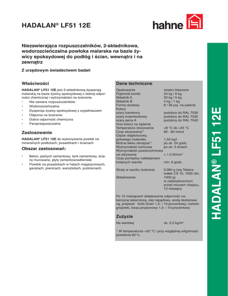 HADALAN® LF51 12E Niezawierająca rozpuszczalników, 2-składnikowa, wodorozcieńczalna powłoka malarska na bazie żywicy epoksydowej do podłóg i ścian, wewnątrz i na zewnątrz Właściwości Dane techniczne HADALAN® LF51 12E jest 2-składnikową dyspersją malarską na bazie żywicy epoksydowej o dobrej odporności chemicznej i wytrzymałości na ścieranie. • Nie zawiera rozpuszczalników • Wodorozcieńczalna • Dyspersja żywicy epoksydowej z wypełniaczem • Odporna na ścieranie • Dobra odporność chemiczna • Paroprzepuszczalna Opakowanie wiadro blaszane Pojemnik kombi 24 kg / 6 kg Składnik A 20 kg / 5 kg Składnik B 4 kg / 1 kg Forma dostawy 8 / 56 poj. na palecie Kolory szary kamienny podobny do RAL 7030 szary krzemionkowy podobny do RAL 7032 szary jasny A podobny do RAL 7042 Inne kolory na żądanie Temperatura stosowania +8 °C do +35 °C Czas stosowania1) 60 - 80 minut Ciężar objętościowy, gotowego materiału 1,55 kg/l Można lekko obciążać1) po ok. 24 godz. Wytrzymałość końcowa po ok. 5 dniach Wytrzymałość powierzchniowa na odrywanie > 1,5 N/mm2 Czas pomiędzy nakładaniem kolejnych warstw min. 6 godz. Zastosowanie HADALAN® LF51 12E do wykonywania powłok na mineralnych podłożach, posadzkach i ścianach. Obszar zastosowań: • • Beton, jastrych cementowy, tynk cementowy, ściany murowane, płyty cementowowłókniste Powłoki na posadzkach w halach magazynowych, garażach, piwnicach, warsztatach, podcieniach. Straty w wyniku ścierania Składowanie 0,084 g (wg Tabera: wałek CS 10, 1000 obr., 1000 g) w zabezpieczonym przed mrozem miejscu, 12 miesięcy Po 12 miesiącach składowania odporność na: benzynę lakierniczą, olej napędowy, wodę destylowaną, preparat Kofa Grain 1,5- i 10-procentowy, roztwór gnojówki, kwas propionowy 1,5- i 10-procentowy Zużycie Na warstwę ok. 0,3 kg/m2 W temperaturze +20 °C i przy względnej wilgotności powietrza 60 %. 1) HADALAN® LF51 12E Z urzędowym świadectwem badań HADALAN® LF51 12E Przygotowanie podłoża Ważne wskazówki Podłoże musi być czyste, mocne i nośne. Podłoża przejściowo lekko wilgotne nie mają negatywnego wpływu na przyczepność. Wytrzymałość podłoża na odrywanie musi wynosić co najmniej 1,5 N/mm2. Podłoża, na których powierzchni zastosowano środki pomocnicze do wygładzania (np. wosk), należy odpowiednio przygotować (frezowanie, piaskowanie). Próba polegająca na zwilżeniu podłoża wodą daje pierwszą orientację na temat jego nasiąkliwości. Podłoża bardzo chłonne i osypujące się należy przed nałożeniem powłoki zagruntować materiałem HADALAN® V31 13E. Powłokę z materiału HADALAN® LF51 12E można nakładać po upływie ok. 2 godzin od zagruntowania. • Wykonanie • • • • • 1. Składnik A i składnik B intensywnie wymieszać w odpowiednim pojemniku za pomocą wolnoobrotowej wiertarki z mieszadłem. 2. Następnie przelać mieszankę do czystego naczynia i krótko ją przemieszać. 3. Nakładać materiał za pomocą wałka lub pędzla. Dla uzyskania równomiernych powierzchni materiał nakłada się za pomocą odpowiedniego wałka z krótkim włosiem przeznaczonego do żywic epoksydowych. Materiał jest rozprowadzany na krzyż. Przerwy podczas pracy mogą prowadzić do powstawania śladów pomiędzy kolejnymi partiami materiału. 4. Dla uzyskania równomiernego oddania kolorów z reguły wymagane jest nałożenie 2 powłok malarskich. 5. Sprzęt i narzędzia robocze czyścić wodą natychmiast po ich użyciu. Dla uzyskania wymaganej konsystencji do malowania żywicę można rozcieńczyć dodając maks. 10 % wody. Produkty systemowe hahne HADALAN® V31 13E • • • • Należy przestrzegać temperatury stosowania wynoszącej od +8 °C do +35 °C. Przy stosowaniu powłoki na zewnątrz należy się liczyć z utratą połysku. Stosowanie materiału po przekroczeniu zalecanego czasu od chwili jego wymieszania prowadzi do wadliwych wyników w zakresie wytrzymałości warstwy i wrażenia optycznego. W przypadku temperatur poniżej +8 °C należy wstrzymać stosowanie materiału z uwagi na długi czas utwardzania. Powierzchnie silnie zaolejone, w przypadku których należy się liczyć z wilgocią wstępującą lub przenikającą z boku, nie nadają się do powlekania. Zadbać o wystarczającą wentylację podczas schnięcia. Produkt zawiera wodę, która musi odparować z cienkiej powłoki. Na powierzchniach tworzących jedną całość optyczną można stosować materiały tylko o tym samym numerze partii. Temperatura podłoża musi być wyższa o co najmniej 3 °C od temperatury punktu rosy. Zachowywać równomierne ilości nakładanego materiału, nieregularne ilości materiału prowadzą do różnic w połysku. Dla utrzymania odpowiedniej jakości powierzchni powłoki zaleca się stosowanie środków pielęgnacyjnych i regularne czyszczenie posadzek (patrz Instrukcja pielęgnacji powłok z żywicy epoksydowej HADALAN®). Składniki Dyspersja na bazie żywicy epoksydowej, wypełniacze funkcjonalne, pigmenty Bezpieczeństwo pracy / zalecenia Dokładniejsze informacje na temat bezpieczeństwa, składowania i obchodzenia się z produktem podane są w aktualnych kartach charakterystyki preparatu niebezpiecznego. Dokładne wskazówki zawarte są w instrukcji roboczej “Żywice epoksydowe w gospodarce budowlanej“, wydanej przez Grupę Roboczą branżowych organizacji przedsiębiorstw budowlanych, budownictwa podziemnego, Stowarzyszenie przemysłowe producentów kleju stow. zarej., Stowarzyszenie producentów chemii budowlanej i środków ochrony drewna stow. zarej. z siedzibą we Frankfurcie. Usuwanie odpadów Dla wszystkich systemów obowiązują aktualne przepisy krajowe. HADALAN® LF51 12E Producent Heinrich Hahne GmbH & Co KG Heinrich-Hahne-Weg 11 D-45711 Datteln Dystrybutor VISBUD Projekt Sp. z o.o. ul. M. Bacciarellego 8E /I 51-649 Wrocław Tel. (+48) 71 344 04 34 Fax (+48) 71 345 17 72 e-mail: [email protected] Opisane wyżej w