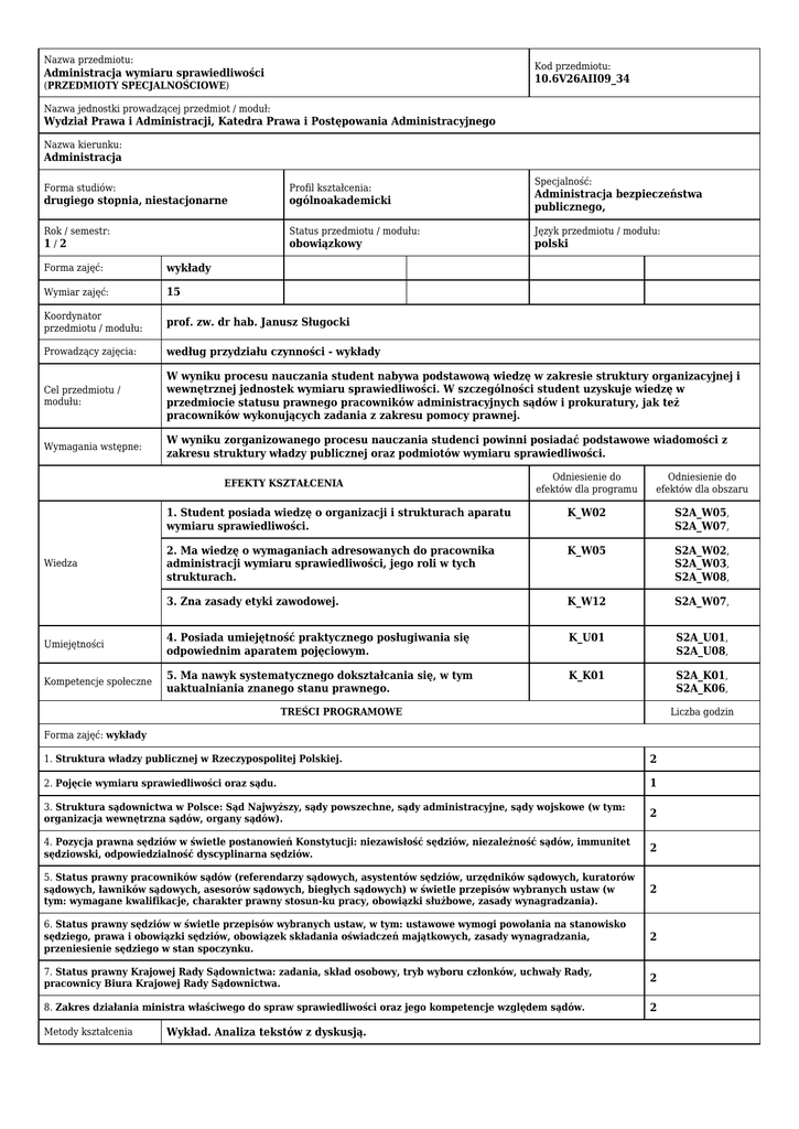 Nazwa przedmiotu: Kod przedmiotu: Administracja wymiaru sprawiedliwości 10.6V26AII09_34 (PRZEDMIOTY SPECJALNOŚCIOWE) Nazwa jednostki prowadzącej przedmiot / moduł: Wydział Prawa i Administracji, Katedra Prawa i Postępowania Administracyjnego Nazwa kierunku: Administracja Specjalność: Forma studiów: Profil kształcenia: drugiego stopnia, niestacjonarne ogólnoakademicki Administracja bezpieczeństwa publicznego, Rok / semestr: 1/2 Status przedmiotu / modułu: Język przedmiotu / modułu: obowiązkowy polski Forma zajęć: wykłady Wymiar zajęć: 15 Koordynator przedmiotu / modułu: prof. zw. dr hab. Janusz Sługocki Prowadzący zajęcia: według przydziału czynności - wykłady Cel przedmiotu / modułu: W wyniku procesu nauczania student nabywa podstawową wiedzę w zakresie struktury organizacyjnej i wewnętrznej jednostek wymiaru sprawiedliwości. W szczególności student uzyskuje wiedzę w przedmiocie statusu prawnego pracowników administracyjnych sądów i prokuratury, jak też pracowników wykonujących zadania z zakresu pomocy prawnej. Wymagania wstępne: W wyniku zorganizowanego procesu nauczania studenci powinni posiadać podstawowe wiadomości z zakresu struktury władzy publicznej oraz podmiotów wymiaru sprawiedliwości. Odniesienie do efektów dla programu Odniesienie do efektów dla obszaru 1. Student posiada wiedzę o organizacji i strukturach aparatu wymiaru sprawiedliwości. K_W02 S2A_W05, S2A_W07, 2. Ma wiedzę o wymaganiach adresowanych do pracownika administracji wymiaru sprawiedliwości, jego roli w tych strukturach. K_W05 S2A_W02, S2A_W03, S2A_W08, 3. Zna zasady etyki zawodowej. K_W12 S2A_W07, Umiejętności 4. Posiada umiejętność praktycznego posługiwania się odpowiednim aparatem pojęciowym. K_U01 S2A_U01, S2A_U08, Kompetencje społeczne 5. Ma nawyk systematycznego dokształcania się, w tym uaktualniania znanego stanu prawnego. K_K01 S2A_K01, S2A_K06, EFEKTY KSZTAŁCENIA Wiedza TREŚCI PROGRAMOWE Liczba godzin Forma zajęć: wykłady 1. Struktura władzy publicznej w Rzeczypospolitej Polskiej. 2 2. Pojęcie wymiaru sprawiedliwości oraz sądu. 1 3. Struktura sądownictwa w Polsce: Sąd Najwyższy, sądy powszechne, sądy administracyjne, sądy wojskowe (w tym: organizacja wewnętrzna sądów, organy sądów). 2 4. Pozycja prawna sędziów w świetle postanowień Konstytucji: niezawisłość sędziów, niezależność sądów, immunitet sędziowski, odpowiedzialność dyscyplinarna sędziów. 2 5. Status prawny pracowników sądów (referendarzy sądowych, asystentów sędziów, urzędników sądowych, kuratorów sądowych, ławników sądowych, asesorów sądowych, biegłych sądowych) w świetle przepisów wybranych ustaw (w tym: wymagane kwalifikacje, charakter prawny stosun-ku pracy, obowiązki służbowe, zasady wynagradzania). 2 6. Status prawny sędziów w świetle przepisów wybranych ustaw, w tym: ustawowe wymogi powołania na stanowisko sędziego, prawa i obowiązki sędziów, obowiązek składania oświadczeń majątkowych, zasady wynagradzania, przeniesienie sędziego w stan spoczynku. 2 7. Status prawny Krajowej Rady Sądownictwa: zadania, skład osobowy, tryb wyboru członków, uchwały Rady, pracownicy Biura Krajowej Rady Sądownictwa. 2 8. Zakres działania ministra właściwego do spraw sprawiedliwości oraz jego kompetencje względem sądów. 2 Metody kształcenia Wykład. Analiza tekstów z dyskusją. Metody weryfikacji efektów kształcenia Forma i warunki zaliczenia Nr efektu kształcenia z sylabusa * praca pisemna/esej/recenzja 1,2,3,4,5, Zaliczenie z oceną. Praca pisemna zaliczeniowa. Warunki zaliczenia: każde pytanie oceniane jest oddzielnie, za każde pytanie można otrzymać od ¼ pkt do 1 pkt. Stosownie do liczby pytań oraz uzyskanej na podstawie udzielonych odpowiedzi sumy punktów warunki otrzymania poszczególnych ocen końcowych przedstawiają się następująco: - ocena dostateczna – od 50% maksymalnej liczby punktów, - ocena dostateczna plus – od 65% maksymalnej liczby punktów, - ocena dobra – od 75% maksymalnej liczby punktów, - ocena dobra plus – od 85% maksymalnej liczby punktów, ocena bardzo dobra – od 90% maksymalnej liczby punktów. Literatura podstawowa Ereciński T. (2009): Prawo o ustroju sądów powszechnych. LexisNexis Masternak- Kubiak M., Kuczyński T. (2009): Prawo o ustroju sądów administracyjnych. Komentarz. Lex a Wolters Kluwer business Literatura uzupełniająca Piasecki K. (2005): Organizacja wymiaru sprawiedliwości w Polsce. Zakamycze Siemaszko A. i in. (2006): Wymiar sprawiedliwości w Europie. Polska na tle wybranych krajów. Instytut Wymiaru Sprawiedliwości Warszawa NAKŁAD PRACY STUDENTA: Liczba godzin Zajęcia dydaktyczne 15 Udział w konsultacjach 10 Zdawanie egzaminu lub/i zaliczenia 2 Przygotowanie się do zajęć 10 Studiowanie literatury 20 Przygotowanie się do egzaminu lub/i zaliczenia 18 ŁĄCZNY nakład pracy studenta w godz. 75 Liczba punktów ECTS 3