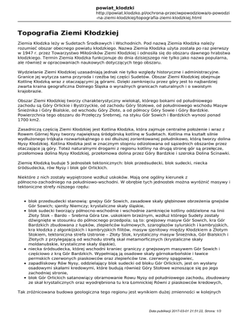 powiat_klodzki http://powiat.klodzko.pl/ochrona-przeciwpowodziowa/o-powodzi -na-ziemi-klodzkiej/topografia-ziemi-klodzkiej.html Topografia Ziemi Kłodzkiej Ziemia Kłodzka leży w Sudetach Środkowych i Wschodnich. Pod nazwą Ziemia Kłodzka należy rozumieć obszar obecnego powiatu kłodzkiego. Nazwa Ziemia Kłodzka użyta została po raz pierwszy w 1947 r. przez Towarzystwo Miłośników Ziemi Kłodzkiej i odnosiła się do obszaru dawnego hrabstwa kłodzkiego. Termin Ziemia Kłodzka funkcjonuje do dnia dzisiejszego nie tylko jako nazwa popularna, ale również w opracowaniach naukowych dotyczących tego obszaru. Wydzielanie Ziemi Kłodzkiej uzasadniają jednak nie tylko względy historyczne i administracyjne. Granice jej wytycza sama przyroda i rzeźba tej części Sudetów. Obszar Ziemi Kłodzkiej obejmuje Kotlinę Kłodzką wraz z otaczającymi ją górami. Dzięki zamknięciu przez góry jest to najbardziej zwarta kraina geograficzna Dolnego Śląska o wyraźnych granicach naturalnych i o swoistym krajobrazie. Obszar Ziemi Kłodzkiej tworzy charakterystyczny wielokąt, którego bokami od południowego zachodu są Góry Orlickie i Bystrzyckie, od zachodu Góry Stołowe, od południowego wschodu Masyw Śnieżnika i Góry Bialskie, od wschodu Góry Złote, a od północy Góry Sowie i Góry Bardzkie. Powierzchnia tego obszaru do Przełęczy Srebrnej, na styku Gór Sowich i Bardzkich wynosi ponad 1700 km2. Zasadniczą częścią Ziemi Kłodzkiej jest Kotlina Kłodzka, która zajmuje centralne położenie i wraz z Rowem Górnej Nysy tworzy największą śródgórską kotlinę w Sudetach. Kotlina ma kształt silnie wydłużonego trójkąta rozwartokątnego o osi dłuższej zorientowanej południkowo, którą tworzy dolina Nysy Kłodzkiej. Kotlina Kłodzka jest w znacznym stopniu odizolowana od sąsiednich obszarów przez otaczające ją góry. Toteż naturalnymi drogami z regionu kotliny na drugą stronę gór są przełęcze, przełomowa dolina Nysy Kłodzkiej, przełomowa dolina przez Góry Bardzkie i szeroka Dolina Ścinawki. Ziemię Kłodzką buduje 5 jednostek tektonicznych: blok przedsudecki, blok sudecki, niecka śródsudecka, rów Nysy i blok gór Orlickich. Niektóre z nich zostały wypiętrzone wzdłuż uskoków. Mają one ogólny kierunek z północno-zachodniego na południowo-wschodni. W obrębie tych jednostek można wyróżnić masywy i tektoniczne strefy niższego rzędu: blok przedsudecki stanowią: gnejsy Gór Sowich, zasadowe skały głębinowe obrzeżenia gnejsów Gór Sowich; sjenity Niemczy; krystaliczne skały śląskie, blok sudecki tworzący północno-wschodnie i wschodnie zamknięcie kotliny oddzielone na linii Złoty Stok – Bardo – Srebrna Góra tzw. uskokiem brzeżnym, wzdłuż którego Sudety zostały dźwignięte w stosunku do północnego przedpola; są to: gnejsowy masyw Gór Sowich, kra Gór Bardzkich zbudowana z łupków, zlepieńców kulmowych, szarogłazów sylurskich i kambryjskich, kra kłodzka z algonkijskich i kambryjskich filitów, masyw sjenitowy między Kłodzkiem a Złotym Stokiem, tektoniczna strefa Ustronie – Złoty Stok, krystaliczny masyw Śnieżnika, Gór Bialskich i Złotych z przylegającą od wschodu strefą skał metamorficznych (krystaliczne skały moldanubskie, krystaliczne skały śląskie), niecka śródsudecka, której wschodni kraniec graniczy z gnejsowym masywem Gór Sowich i częściowo z krą Gór Bardzkich. Wypełniają ją osadowe skały górnokarbońskie i ławice permskich czerwonych piaskowców oraz zlepieńców tzw. czerwony spągowiec, zapadliskowy Rów Nysy, oddzielający blok sudecki od bloku Gór Orlickich, jest on wysłany osadowymi skałami kredowymi, które budują również Góry Stołowe wznoszące się po jego zachodniej stronie, blok Gór Orlickich satanowiący obramowanie Rowu Nysy od południowego zachodu, zbudowany ze skał krystalicznych oraz wyodrębniona tu kra Łomnickiej Równi z piaskowców kredowych, Tak zróżnicowana budowa geologiczna tego regionu jest wynikiem dużej zmienności w kolejnych Data publikacji 2017-03-01 21:51:22, Strona: 1/3 powiat_klodzki http://powiat.klodzko.pl/ochrona-przeciwpowodziowa/o-powodzi -na-ziemi-klodzkiej/topografia-ziemi-klodzkiej.html epokach dziejów Ziemi. Występowały tu na przemian zalewy morskie i okresy lądowe, zastoje i ruchy skorupy ziemskiej, podczas których wypiętrzały się łańcuchy górskie, a następnie ulegały degradacji stając się ponownie dnem morza. Ostateczne formowanie się dzisiejszej rzeźby rozpoczęło się w erze kenozoicznej w okresie trzeciorzędu, podczas którego wzmogły się ruchy górotwórcze, związane z orogenezą alpejską. Nastąpiło wtedy wgięcie niecki śródsudeckiej i powstanie tzw. paleogeńskiej powierzchni zrównania. W oligocenie wypiętrzające się góry spowodowały potrzaskanie paleogeńskiej powierzchni zrównania licznymi uskokami, nastąpiło dźwignięcie bloku sudeckiego i Gór Orlickich z Bystrzyckimi, natomiast Kotlina Kłodzka i Rów Nysy pozostały na tym samym poziomie z wyjątkiem północno-zachodniej części, w której zapoczątkowane zostało wypiętrzenia dzisiejszych Gór Stołowych. Wynikiem tego są różne wysokości płaskich wierzchowin górskich tworzących Ziemię Kłodzką. Góry Stołowe znajdują się na wysokości 890 – 920 m npm., Góry Sowie, Bystrzyckie, Orlickie i Złote – 800 – 1000 m npm., Góry Bardzkie około 750 m npm., Góry Bialskie – 900 – 1000 m npm. oraz Masyw Śnieżnika na wysokości 1100 – 1200 m npm. Również Kotlina Kłodzka, znajdująca się na poziomie 350 – 450 m npm. jest pozostałością prastarego równinnego krajobrazu. Piętrzenia, jakie miały miejsce w erze kenozoicznej można podzielić na trzy fazy bardzo powolnych ruchów piętrzących, oddzielonych długimi okresami zastoju. W okresie poprzedzającym orogenezę alpejską obszar stanowi paleogeńska powierzchnia zrównania z wystającymi kopulastymi pagórami twardzielowymi. W o