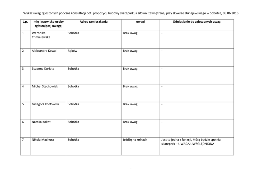 Wykaz uwag zgłoszonych podczas konsultacji dot. propozycji budowy skateparku i siłowni zewnętrznej przy skwerze Dunajewskiego w Sobótce, 08.06.2016 L.p. Imię i nazwisko osoby zgłaszającej uwagę Adres zamieszkania uwagi 1 Weronika Chmielewska Sobótka Brak uwag - 2 Aleksandra Kowal Ręków Brak uwag - 3 Zuzanna Kuriata Sobótka Brak uwag - 4 Michał Stachowiak Sobótka Brak uwag - 5 Grzegorz Kozłowski Sobótka Brak uwag - 6 Natalia Kokot Sobótka Brak uwag - 7 Nikola Machura Sobótka Jeżdżę na rolkach Jest to jedna z funkcji, którą będzie spełniał skatepark – UWAGA UWZGLĘDNIONA 1 Odniesienie do zgłoszonych uwag Wykaz uwag zgłoszonych podczas konsultacji dot. propozycji budowy skateparku i siłowni zewnętrznej przy skwerze Dunajewskiego w Sobótce, 08.06.2016 L.p. Imię i nazwisko osoby zgłaszającej uwagę Adres zamieszkania uwagi 8 Jagoda Drozd Sobótka Jeżdżenie na rolkach Jest to jedna z funkcji, którą będzie spełniał skatepark – UWAGA UWZGLĘDNIONA 9 Dominika Gałysa Kryształowice Jazda na desce Jest to jedna z funkcji, którą będzie spełniał skatepark – UWAGA UWZGLĘDNIONA 10 Bartosz Mirtyński Strzegomiany deskorolka Jest to jedna z funkcji, która będzie spełniał skatepark – UWAGA UWZGLĘDNIONA 11 Wojciech Wawrzyniak Sobótka Jazda na desce Jest to jedna z funkcji, która będzie spełniał skatepark – UWAGA UWZGLĘDNIONA 12 Arkadiusz Romański Kunów Wysoki half-pipe Uwaga przekazana projektantowi 13 Jagoda Tkaczyk Sulistrowice Jazda na desce, rolkach Jest to jedna z funkcji, która będzie spełniał skatepark – UWAGA UWZGLĘDNIONA 14 Mateusz Stachowiak Sulistrowice Jazda na desce, rolkach Jest to jedna z funkcji, która będzie spełniał skatepark – UWAGA UWZGLĘDNIONA 2 Odniesienie do zgłoszonych uwag Wykaz uwag zgłoszonych podczas konsultacji dot. propozycji budowy skateparku i siłowni zewnętrznej przy skwerze Dunajewskiego w Sobótce, 08.06.2016 L.p. Imię i nazwisko osoby zgłaszającej uwagę Adres zamieszkania uwagi 15 Agnieszka Konewska Mirosławice Rolki, deskorolka Jest to jedna z funkcji, która będzie spełniał skatepark – UWAGA UWZGLĘDNIONA 16 Justyna Gliszczyńska Sobótka Jazda na rolkach Jest to jedna z funkcji, która będzie spełniał skatepark – UWAGA UWZGLĘDNIONA 17 Artur Rusek Sobótka Rolki, deska Jest to jedna z funkcji, która będzie spełniał skatepark – UWAGA UWZGLĘDNIONA 18 Agata Grygiel Świątniki Sugeruję pomalowanie skateparku na kolorowo, różne graffiti Uwaga przekazana projektantowi; wykorzystanie wizerunku Ślężysława na skateparku 19 Łukasz Chama Sobótka Uwaga przekazana projektantowi; wielkość skateparku uzależniona będzie od wysokości posiadanych środków finansowych 20 Julia Buda Gniechowice Jestem skajterem i chciałbym duży park z wieloma ciekawymi grindami, bajerkami i rampami Jazda na wrotkach oraz desce 21 Agnieszka Olszowy Stary Zamek Inny teren Koncepcja rewitalizacji Sobótki, której elementem jest zagospodarowanie skweru im. Dunajewskiego przy ul. Strzelców w Sobótce, była konsultowana od listopada 2015r. do stycznia 2016r. Ze względu na czynniki społeczne, dużą gęstość zaludnienia 3 Odniesienie do zgłoszonych uwag Osoba spoza LGD Wykaz uwag zgłoszonych podczas konsultacji dot. propozycji budowy skateparku i siłowni zewnętrznej przy skwerze Dunajewskiego w Sobótce, 08.06.2016 L.p. Imię i nazwisko osoby zgłaszającej uwagę Adres zamieszkania uwagi Odniesienie do zgłoszonych uwag 22 Wiktor Szywała Sobótka Brak uwag terenów przyległych, bliskość placówek oświatowych, odpowiednie spadki terenu oraz wstępną pozytywną opinię Wojewódzkiego Konserwatora Zabytków, wskazana lokalizacja została zaakceptowana – UWAGA NIEUWZGLĘDNIONA - 23 Filip Bogdański Sobótka Brak uwag - 24 Kacper Dwoiczko Sobótka Brak uwag - 25 Mateusz lech Rogów Sobócki Zrobiłbym funboxa, hopki, rampę i coś do grinda. Skatepark będzie zawierał proponowane rozwiązania – UWAGA UWZGLĘDNIONA 26 Michał Olszowy Stary Zamek hopki, rampa, murki Skatepark będzie zawierał proponowane rozwiązania – UWAGA UWZGLĘDNIONA 27 Przemek Kojs Sobótka Coś na rower i oświetlenie parku Skatepark będzie zawierał proponowane rozwiązania. Oświetlenie będzie kolejnym etapem zagospodarowania skweru – UWAGA UWZGLĘDNIONA 4 Wykaz uwag zgłoszonych podczas konsultacji dot. propozycji budowy skateparku i siłowni zewnętrznej przy skwerze Dunajewskiego w Sobótce, 08.06.2016 L.p. Imię i nazwisko osoby zgłaszającej uwagę Adres zamieszkania uwagi 28 Mateusz Króle Mirosławice W Sobótce przydałby się basen kryty Przedstawiona propozycja nie jest przedmiotem konsultacji społecznych – UWAGA NIEUWZGLĘDNIONA 29 Wiktor Dyrcz Sobótka Lokalizacja koło Orlenu 30 Hubert Seredyński Sobótka Brak uwag Koncepcja rewitalizacji Sobótki, której elementem jest zagospodarowanie skweru im. Dunajewskiego przy ul. Strzelców w Sobótce, była konsultowana od listopada 2015r. do stycznia 2016r. Ze względu na czynniki społeczne, dużą gęstość zaludnienia terenów przyległych, bliskość placówek oświatowych, odpowiednie spadki terenu oraz wstępną pozytywną opinię Wojewódzkiego Konserwatora Zabytków, wskazana lokalizacja została zaakceptowana – UWAGA NIEUWZGLĘDNIONA - 31 Piotr Kopeć Biała Lokalizacja Biała Miejscowość leży poza terytorium gminy Sobótka – gmina nie może podejmować decyzji w tej sprawie – UWAGA NIEUWZGLĘDNIONA 32 Zuzanna Sobótka ------------------ ---------------- 5 Odniesienie do zgłoszonych uwag Wykaz uwag zgłoszonych podczas konsultacji dot. propozycji budowy skateparku i siłowni zewnętrznej przy skwerze Dunajewskiego w Sobótce, 08.06.2016 L.p. Imię i nazwisko osoby zgłaszającej uwagę Adres zamieszkania uwagi 33 Emanuela Grabarczyk Rogów Sobócki Lokalizacja obok Orlenu 34 Artur Muszyński Olbrachtowice Brak uwag 35 Marta Sadkiewicz Sobótka Brak uwag - 36 Aleksandra Zub Rogów Sobócki Brak uwag - 37 Ha