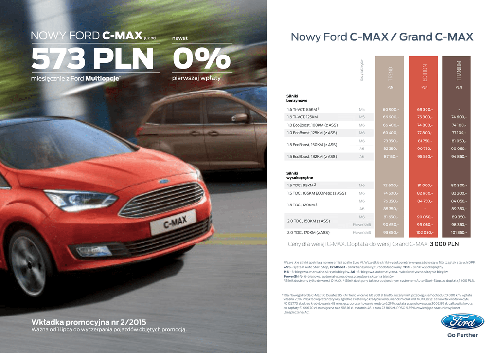 TREND EDITION TITANIUM Skrzynia biegów 573 PLN Nowy Ford C-MAX / Grand C-MAX PLN PLN PLN M5 60 900,- 69 300,- - Silniki benzynowe 1.6 Ti-VCT, 85KM 1 1.6 Ti-VCT, 125KM M5 66 900,- 75 300,- 74 600,- 1.0 EcoBoost, 100KM (z ASS) M6 66 400,- 74 800,- 74 100,- 1.0 EcoBoost, 125KM (z ASS) M6 69 400,- 77 800,- 77 100,- 1.5 EcoBoost, 150KM (z ASS) 1.5 EcoBoost, 182KM (z ASS) M6 73 350,- 81 750,- 81 050,- A6 82 350,- 90 750,- 90 050,- A6 87 150,- 95 550,- 94 850,- M6 72 600,- 81 000,- 80 300,- Silniki wysokoprężne 1.5 TDCi, 95KM 2 1.5 TDCi, 105KM ECOnetic (z ASS) 1.5 TDCi, 120KM 2 2.0 TDCi, 150KM (z ASS) 2.0 TDCi, 170KM (z ASS) M6 74 500,- 82 900,- 82 200,- M6 76 350,- 84 750,- 84 050,- A6 85 350,- - 89 350,- M6 81 650,- 90 050,- 89 350- PowerShift 90 650,- 99 050,- 98 350,- PowerShift 93 650,- 102 050,- 101 350,- Ceny dla wersji C-MAX. Dopłata do wersji Grand C-MAX: 3 000 PLN Wszystkie silniki spełniają normę emisji spalin Euro VI. Wszystkie silniki wysokoprężne wyposażone są w filtr cząstek stałych DPF. ASS - system Auto Start Stop, EcoBoost - silnik benzynowy, turbodoładowany, TDCi - silnik wysokoprężny M6 - 6-biegowa, manualna skrzynia biegów, A6 - 6-biegowa, automatyczna, hydrokinetyczna skrzynia biegów, PowerShift - 6-biegowa, automatyczna, dwusprzęgłowa skrzynia biegów 1 Silnik dostępny tylko do wersji C-MAX. 2 Silnik dostępny także z opcjonalnym systemem Auto-Start-Stop, za dopłatą 1 000 PLN. * Dla Nowego Forda C-Max 1.6 Duratec 85 KM Trend w cenie 60 900 zł brutto, roczny limit przebiegu samochodu 20 000 km, wpłata własna 25%. Przykład reprezentatywny zgodnie z ustawą o kredycie konsumenckim dla Ford MultiOpcje: całkowita kwota kredytu 40 057,70 zł, okres kredytowania 48 miesięcy, oprocentowanie kredytu 6,29%, opłata przygotowawcza 2002,89 zł, całkowita kwota do zapłaty 51 666,70 zł, miesięczna rata 518,16 zł, ostatnia 48-a rata 23 805 zł, RRSO 9,85% zawierająca szacunkowy koszt ubezpieczenia AC. Wkładka promocyjna nr 2/2015 Ważna od 1 lipca do wyczerpania pojazdów objętych promocją. Nowy Ford C-MAX / Grand C-MAX Wyposażenie standardowe bez kompromisów. C-MAX / Grand C-MAX Trend Nadwozie •16” stalowe obręcze kół z kołpakami o wzorze 14 ramienym •Elektroniczny układ stabilizacji toru jazdy (ESC) •Inteligentny system bezpieczeństwa (IPS) •Układ ułatwiający ruszanie na wzniesieniach (HSA) •Górna przednia krata wlotu powietrza z chromowanym obramowaniem •Elektrycznie podgrzewane i sterowane lusterka boczne w kolorze nadwozia ze zintegrowanymi kierunkowskazami •Klamki drzwi lakierowane w kolorze nadwozia •Tylne drzwi przesuwane (Tylko Grand C-MAX) •Ford Easy Fuel - system bezkorkowego wlewu paliwa Wnętrze •Klimatyzacja •Radioodtwarzacz CD/MP3 z Ford Sync i AppLink zawiera: kolorowy wyświetlacz 4.2”, zestaw głośnomówiący z Bluetooth® i rozbudowaną funkcją sterowania głosem (bez języka polskiego) oraz funkcją wzywania pomocy, 6 głośników, zdalne sterowanie na kierownicy, gniazda: AUX-IN i USB/iPod® (ICFAC) Elektrycznie sterowane szyby przednich drzwi • •6 poduszek powietrznych •Kierownica oraz dźwignia zmiany biegów wykończone skórą •Kierownica z regulacją odległości i kąta pochylenia •Fotel kierowcy z ręczną regulacją w 4. kierunkach i regulacją podparcia odcinka lędźwiowego •Punkty mocowania fotelika dziecięcego ISOFIX •Dodatkowe gniazdko 12V w bagażniku •Ford MyKey® C-MAX / Grand C-MAX Edition Dodatkowe elementy wyposażenia w porównaniu do wersji Trend Nadwozie •16” obręcze kół ze stopów lekkich, •Tempomat z regulowanym ogranicznikiem •Przednie światła przeciwmgielne •Lusterka boczne składane elektrycznie •Elektrycznie sterowane szyby wzór 5x2-ramienny (D2XBT) Wnętrze •System nawigacji satelitarnej z Ford SYNC 2 zawiera: kolorowy wyświetlacz dotykowy 8”, TMC, zestaw głośnomówiący z Bluetooth®, 6 głośników, gniazda: 2xUSB, SD, AUX-IN, zdalne sterowanie na kierownicy, mapy Europy z widokiem 3D (ICFAL) prędkości (ASLD) przednich i tylnych drzwi •Konsola centralna rozbudowana z podłokietnikiem •Czujniki parkowania z tyłu •Rolety przeciwsłoneczne zintegrowane w tylnych drzwiach C-MAX / Grand C-MAX Titanium Dodatkowe elementy wyposażenia w porównaniu do wersji Trend Nadwozie •16” obręcze kół ze stopów lekkich, wzór 10-ramienny (nie dotyczy wersji ECOnetic)(D2XDC) •Przednie światła przeciwmgielne z chromowanym wykończeniem •Górna krata wlotu powietrza w kolorze czarnym, z listwami z chromowanym wykończeniem oraz chromowanym obramowaniem Wnętrze •Klimatyzacja dwustrefowa z automatyczną regulacją temeratury (DEATC) •Radioodtwarzacz CD/MP3 z Ford SYNC 2 zawiera: kolorowy wyświetlacz dotykowy 8”, zestaw głośnomówiący z Bluetooth®, 6 głośników, gniazda: 2xUSB, SD, AUX-IN, zdalne sterowanie na kierownicy (ICFAF) Przycisk rozrusznika Ford Power •Listwa wzdłuż dolnej linii szyb bocznych w kolorze • •Konsola centralna Premium z przesuwanym •Reflektory automatyczne •Światła do jazdy dzienej w technologii LED •Wycieraczki przedniej szyby sterowane •Fotel pasażera z ręczną regulacją podparcia odcinka polerowanego aluminium automatycznie z czujnikiem deszczu podłokietnikiem •Fotel pasażera z przodu z ręczną regulacją położenia w 4. kierunkach lędźwiowego •Samoczynnie ściemniające się lusterko wsteczne •Lampki sufitowe LED ze ściemniaczem i opóźnionym wyłączaniem •Nakładki na progi z przodu z tworzywa sztucznego z logo ‚Ford’
