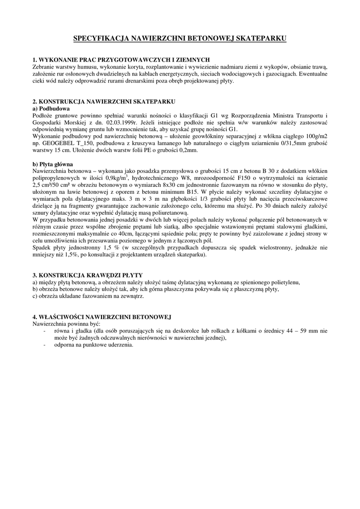 SPECYFIKACJA NAWIERZCHNI BETONOWEJ SKATEPARKU 1. WYKONANIE PRAC PRZYGOTOWAWCZYCH I ZIEMNYCH Zebranie warstwy humusu, wykonanie koryta, rozplantowanie i wywiezienie nadmiaru ziemi z wykopów, obsianie trawą, założenie rur osłonowych dwudzielnych na kablach energetycznych, sieciach wodociągowych i gazociągach. Ewentualne cieki wód należy odprowadzić rurami drenarskimi poza obręb projektowanej płyty. 2. KONSTRUKCJA NAWIERZCHNI SKATEPARKU a) Podbudowa Podłoże gruntowe powinno spełniać warunki nośności o klasyfikacji G1 wg Rozporządzenia Ministra Transportu i Gospodarki Morskiej z dn. 02.03.1999r. Jeżeli istniejące podłoże nie spełnia w/w warunków należy zastosować odpowiednią wymianę gruntu lub wzmocnienie tak, aby uzyskać grupę nośności G1. Wykonanie podbudowy pod nawierzchnię betonową – ułożenie geowłókniny separacyjnej z włókna ciągłego 100g/m2 np. GEOGEBEL T_150, podbudowa z kruszywa łamanego lub naturalnego o ciągłym uziarnieniu 0/31,5mm grubość warstwy 15 cm. Ułożenie dwóch warstw folii PE o grubości 0,2mm. b) Płyta główna Nawierzchnia betonowa – wykonana jako posadzka przemysłowa o grubości 15 cm z betonu B 30 z dodatkiem włókien polipropylenowych w ilości 0,9kg/m3, hydrotechnicznego W8, mrozoodporność F150 o wytrzymałości na ścieranie 2,5 cm³/50 cm² w obrzeżu betonowym o wymiarach 8x30 cm jednostronnie fazowanym na równo w stosunku do płyty, ułożonym na ławie betonowej z oporem z betonu minimum B15. W płycie należy wykonać szczeliny dylatacyjne o wymiarach pola dylatacyjnego maks. 3 m × 3 m na głębokości 1/3 grubości płyty lub nacięcia przeciwskurczowe dzielące ją na fragmenty gwarantujące zachowanie założonego celu, któremu ma służyć. Po 30 dniach należy założyć sznury dylatacyjne oraz wypełnić dylatację masą poliuretanową. W przypadku betonowania jednej posadzki w dwóch lub więcej polach należy wykonać połączenie pól betonowanych w różnym czasie przez wspólne zbrojenie prętami lub siatką, albo specjalnie wstawionymi prętami stalowymi gładkimi, rozmieszczonymi maksymalnie co 40cm, łączącymi sąsiednie pola; pręty te powinny być zaizolowane z jednej strony w celu umożliwienia ich przesuwania poziomego w jednym z łączonych pól. Spadek płyty jednostronny 1,5 % (w szczególnych przypadkach dopuszcza się spadek wielostronny, jednakże nie mniejszy niż 1,5%, po konsultacji z projektantem urządzeń skateparku). 3. KONSTRUKCJA KRAWĘDZI PŁYTY a) między płytą betonową, a obrzeżem należy ułożyć taśmę dylatacyjną wykonaną ze spienionego polietylenu, b) obrzeża betonowe należy ułożyć tak, aby ich górna płaszczyzna pokrywała się z płaszczyzną płyty, c) obrzeża układane fazowaniem na zewnątrz. 4. WŁAŚCIWOŚCI NAWIERZCHNI BETONOWEJ Nawierzchnia powinna być: - równa i gładka (dla osób poruszających się na deskorolce lub rolkach z kółkami o średnicy 44 – 59 mm nie może być żadnych odczuwalnych nierówności w nawierzchni jezdnej), - odporna na punktowe uderzenia.