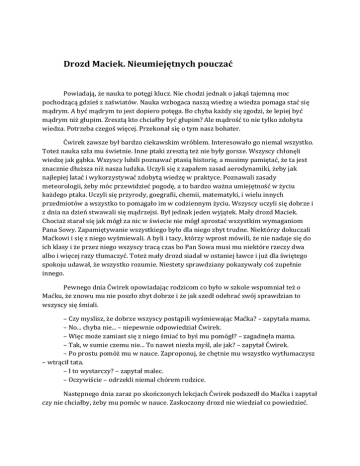 Drozd Maciek. Nieumiejętnych pouczać Powiadają, że nauka to potęgi klucz. Nie chodzi jednak o jakąś tajemną moc pochodzącą gdzieś z zaświatów. Nauka wzbogaca naszą wiedzę a wiedza pomaga stać się mądrym. A być mądrym to jest dopiero potęga. Bo chyba każdy się zgodzi, że lepiej być mądrym niż głupim. Zresztą kto chciałby być głupim? Ale mądrość to nie tylko zdobyta wiedza. Potrzeba czegoś więcej. Przekonał się o tym nasz bohater. Ćwirek zawsze był bardzo ciekawskim wróblem. Interesowało go niemal wszystko. Toteż nauka szła mu świetnie. Inne ptaki zresztą też nie były gorsze. Wszyscy chłonęli wiedzę jak gąbka. Wszyscy lubili poznawać ptasią historię, a musimy pamiętać, że ta jest znacznie dłuższa niż nasza ludzka. Uczyli się z zapałem zasad aerodynamiki, żeby jak najlepiej latać i wykorzystywać zdobytą wiedzę w praktyce. Poznawali zasady meteorologii, żeby móc przewidzieć pogodę, a to bardzo ważna umiejętność w życiu każdego ptaka. Uczyli się przyrody, goegrafii, chemii, matematyki, i wielu innych przedmiotów a wszystko to pomagało im w codziennym życiu. Wszyscy uczyli się dobrze i z dnia na dzień stwawali się mądrzejsi. Był jednak jeden wyjątek. Mały drozd Maciek. Chociaż starał się jak mógł za nic w świecie nie mógł sprostać wszystkim wymaganiom Pana Sowy. Zapamiętywanie wszystkiego było dla niego zbyt trudne. Niektórzy dokuczali Maćkowi i się z niego wyśmiewali. A byli i tacy, którzy wprost mówili, że nie nadaje się do ich klasy i że przez niego wszyscy tracą czas bo Pan Sowa musi mu niektóre rzeczy dwa albo i więcej razy tłumaczyć. Toteż mały drozd siadał w ostaniej ławce i już dla świętego spokoju udawał, że wszystko rozumie. Niestety sprawdziany pokazywały coś zupełnie innego. Pewnego dnia Ćwirek opowiadając rodzicom co było w szkole wspomniał też o Maćku, że znowu mu nie poszło zbyt dobrze i że jak szedł odebrać swój sprawdzian to wszyscy się śmiali. – Czy myslisz, że dobrze wszyscy postąpili wyśmiewając Maćka? – zapytała mama. – No... chyba nie... – niepewnie odpowiedział Ćwirek. – Więc może zamiast się z niego śmiać to byś mu pomógł? – zagadnęła mama. – Tak, w sumie czemu nie... To nawet niezła myśl, ale jak? – zapytał Ćwirek. – Po prostu pomóż mu w nauce. Zaproponuj, że chętnie mu wszystko wytłumaczysz – wtrącił tata. – I to wystarczy? – zapytał malec. – Oczywiście – odrzekli niemal chórem rodzice. Następnego dnia zaraz po skończonych lekcjach Ćwirek podszedł do Maćka i zapytał czy nie chciałby, żeby mu pomóc w nauce. Zaskoczony drozd nie wiedział co powiedzieć. Nikt nigdy mu czegoś takiego nie proponował a sam bał się kogokolwiek o to poprosić, choć wiedział, że było by to dobre dla niego i że tego potrzebuje. Po chwili zawahania Maciek z rozradowaną miną zgodził się na propozycję Ćwirka. Od tego czasu niemal każdego dnia Ćwirek wraz z Maćkiem po skończonych lekcjach zostawali w szkole, żeby jeszcze raz wszystko powtórzyć. Ćwirek starał się wytłumaczyć Maćkowi jak najlepiej wszystko co było na lekcji. Z czasem Ćwirek zauważył, że nie tylko Maciek coraz lepiej się uczy ale i jemu samemu znacznie lepiej wszystko zrozumieć. Obaj na tym korzystali. I tak przyszedł czas na kolejny sprawdzian. Wszyscy się do niego pilnie przygotowywali. Zasiadłszy na swoich miejscach zaczęli pisać. Na sali panowała cisza i słychać było tylko odgłosy piszących piór. Niektórym szło to szybciej i sprawniej a niektórym nieco wolniej. Nikogo jednak nie zaskoczyło to, że Maciek oddał sprawdzian jako jeden z pierwszych. Już nieraz tak bylo. Większośc pomyślała sobie, że pewno znowu oddał prawie pustą kartkę. Większość tak wąłśnie pomyślała, ale nie wróbelek, który wiedział, że tym razem Maciek nie oddał prawie pustej kartki. Nadszedł czas oddawania sprawdzianów. Wszyscy dobrze wiedzieli, że Pan Sowa zawsze zaczynna oddawanie sprawdzianów od tych najsłabszych do najlepszych. I kiedy rozpoczął oddawanie to wcale nie Maciek poszedł jako pierwszy po swój sprawdzian, jak to było do tej pory. Nie poszedł też jako drugi, ani trzeci, ani czwarty... Niektórzy zaczęli już myśleć, że pewno Pan Sowa gdzieś zgubił sprawdzian małego drozda. Ale nie, ku wielkiemu zaskoczeniu Maciek odebrał swój sprawdzian jako jeden z ostatnich. Wszyscy dziwili się temu co się stało i niedowierzali, że mały drozd nagle zaczął się dobrze uczyć i że tak dobrze napisał wcale niełatwy test. A najszerzej otwarte dzioby mieli ci, co się najgłośniej z niego do tej pory śmiali. Wszyscy zastanawiali się jak to się stało. Wszyscy, ale nie Pan Sowa, który dobrze wiedział dzięki komu Maciek tym razem tak dobrze napisał sprawdzian i w ogóle zaczął się dobrze uczyć i wszystko rozumieć. Po skończonej lekcji Pan Sowa poprosił Ćwirka, żeby został na chwilę. Gdy wsszyscy wyszli z klasy Pan Sowa podszedł do małego wróbla i powiedział: – Nauczyłeś się właśnie czegoś bardzo ważnego. Nauczyłeś się, że sama wiedza nie wystarczy, żeby być mądrym. Bo mądrym jest ten kto potrafi zdobytą wiedzą się dzielić i przekazywać ją innym. – I nie dość, że sam lepiej wszystko pojąłem to w dodatku zyskałem nowego przyjaciela – dodał Ćwirek. – Tak, masz rację. Wiedza, może prowadzić do pychy i zarozumialstwa co zabija dobre relacje z innymi, ale może też, jeśli się nią dzielimy, budować te relacje i je umacniać. – Święta prawda, Panie Sowa – ćwierknął wróbelek. – Święta prawda... A wie Pan ile to radości i satysfakcji daje... dodał wróbelek i odleciał – Oj wiem... po tylu latach uczenia, wiem... – powiedział do samego siebie Pan Sowa.