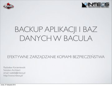 BACKUP APLIKACJI I BAZ DANYCH W BACULA EFEKTYWNE ZARZĄDZANIE KOPIAMI BEZPIECZEŃSTWA Radosław Korzeniewski Solution Architect email: [email protected] http://www.inteos.pl/ środa, 27 listopada 2013 AGENDA •Elastyczne backupy aplikacji •Mechanizmy wbudowane •Backup baz danych •MySQL , PostgreSQL , Oracle, SQL Server •Backup aplikacji i środowisk •ActiveDirectory/Systemstate •Backup maszyn wirtualnych •VMware Infrastructure •Pytania i odpowiedzi ... 2 środa, 27 listopada 2013 ELASTYCZNE BACKUPY APLIKACJI 3 środa, 27 listopada 2013 ELASTYCZNE BACKUPY APLIKACJI •Backup plików dostępnych na filesystemie •filesystemy lokalne (ntfs, ufs, ext4, etc...) •filesystemy sieciowe (cifs, nfs, etc...) •Mechanizmy wbudowane •standardowy backup plików aplikacji lub bazy danych •wykorzystanie wbudowanych pluginów (bpipe) •Zapewnienie spójności danych •wyścig pomiędzy zapisem przez aplikację a odczytem przez backup •bufory danych w pamięci aplikacji •snapshot, offline, wyładowanie danych, itp. 4 środa, 27 listopada 2013 ELASTYCZNE BACKUPY APLIKACJI •Uruchamianie skryptów •Uprawnienia •Linux/Unix - root:root •Windows - SYSTEM •Client Run •Client Run •RunScript Before Job After Job Job { Name = JobBackupApp01 Type = Backup ClientRunBeforeJob = /bin/start-bck.sh ClientRunAfterJob = /bin/finish-bck.sh Client = client Fileset = FileSetDefaultSet Storage = "backup-sd" Messages = "Standard" Pool = "PoolDefault" Priority = 10 } •Runs On Client, Runs When •Fail Job On Error •Runs On Success, Runs On Failure •Command, Console 5 środa, 27 listopada 2013 ELASTYCZNE BACKUPY APLIKACJI •Przykłady skryptów - backup MySQL za pomocą mysqldump •mysqldump.sh (ClientRunBeforeJob) #!/bin/sh # (c) Inteos Sp. z o.o. MYUSER=root MYPASS=ssp MYDUMP=/usr/bin/mysqldump MYDUMPFILE=/var/tmp/mysql.sql MYLOGFILE=/var/log/mysql.sql.log if [ "x$MYUSER" != "x" ] then MYUSEROPT="--user=$MYUSER" fi if [ "x$MYPASS" != "x" ] then MYPASSOPT="--password=$MYPASS" fi $MYDUMP $MYUSEROPT $MYPASSOPT --all-databases -v > $MYDUMPFILE 2>$MYLOGFILE 6 środa, 27 listopada 2013 ELASTYCZNE BACKUPY APLIKACJI •Przykłady skryptów - backup MySQL za pomocą mysqldump •mysqldumprm.sh (ClientRunAfterJob) #!/bin/sh # (c) Inteos Sp. z o.o. MYDUMPFILE=/var/tmp/mysql.sql rm -f $MYDUMPFILE 7 środa, 27 listopada 2013 ELASTYCZNE BACKUPY APLIKACJI •RunScript •bardziej zaawansowana metoda sterowania przebiegiem backupu •wiele definicji RunScript z różnymi parametrami •możliwość wykonania skryptu “sprzątającego” także dla nieudanego backupu Job { (...) RunScript { Runs On Client = Yes Runs When = Before Fail Job On Error = Yes Command = /usr/bin/mysqldump.sh } RunScript { Runs On Client = Yes Runs When = After Fail Job On Error = No Runs On Success = yes Runs On Failure = yes Command = /usr/bin/mysqldumprm.sh } } 8 środa, 27 listopada 2013 ELASTYCZNE BACKUPY APLIKACJI •Przekierowanie danych ze skryptu bezpośrednio do Bacula •backup danych nie dostępnych w postaci plików na filesystemie •backup danych z pominięciem etapu wyładowania danych na filesystem •oszczędność czasu - jeden przebieg wyładowania danych i backupu •oszczędność miejsca - brak wymogu dodatkowego miejsca na wyładowane dane •Plugin: bpipe-fd Plugin=bpipe:<nazwa_pliku>:<reader_script>:<writer_script> 9 środa, 27 listopada 2013 ELASTYCZNE BACKUPY APLIKACJI •Plugin: bpipe-fd Plugin=bpipe:<nazwa_pliku>:<reader_script>:<writer_script> •<nazwa_pliku> - wirtualna nazwa pliku pod którą będzie widoczny nasz backup w bazie katalogowej •<reader_script> - ścieżka i nazwa skryptu wykonującego wyładowanie danych do backupu •<writer_script> - ścieżka i nazwa skryptu wykonującego załadowanie danych backupowych podczas odtwarzania 10 środa, 27 listopada 2013 ELASTYCZNE BACKUPY APLIKACJI •Przykład konfiguracji Filesetu do backupu IBM DB2 •zamiast parametru File podajemy parametr Plugin z odpowiednimi parametrami # # FileSet definition for Applications # # (c) Inteos Sp. z o.o. # FileSet { Name = "FileSetDB2OnlineSet01" Include { Options { signature = MD5 noatime = yes } Plugin = "bpipe:/DB2/backup.stream:/bin/db2backup.sh:/bin/db2restore.sh" } } 11 środa, 27 listopada 2013 ELASTYCZNE BACKUPY APLIKACJI •Przykłady skryptów - backup IBM DB2 za pomocą narzędzi db2 •bpipe-fd - db2backup.sh #!/bin/sh # (c) Inteos sp. z o.o. DB2USER=db2prd DB2DB=PRD DBPIPE=/tmp/db2pipe if [ ! -p $DBPIPE ] then ! mkfifo $DBPIPE fi chown $DB2USER $DBPIPE su - $DB2USER -c "/db2/$DB2USER/sqllib/bin/db2 backup db $DB2DB online to $DBPIPE" \ 2> /tmp/db2b2.log > /tmp/db2b1.log & cat $DBPIPE 12 środa, 27 listopada 2013 ELASTYCZNE BACKUPY APLIKACJI •Przykłady skryptów - backup IBM DB2 za pomocą narzędzi db2 •bpipe-fd - db2restore.sh #!/bin/sh # (c) Inteos sp. z o.o. DB2USER=db2dev DB2DB=DEV DB2DBREST=DEVRES DBPIPE=/tmp/db2pipe if [ ! -p $DBPIPE ] then ! mkfifo $DBPIPE fi chown $DB2USER $DBPIPE su - $DB2USER -c "/db2/$DB2USER/sqllib/bin/db2 restore db $DB2DB from $DBPIPE into $DB2DBREST"\ 2> /tmp/db2r2.log > /tmp/db2r1.log cat > $DBPIPE 13 środa, 27 listopada 2013 BACKUP BAZ DANYCH 14 środa, 27 listopada 2013 BACKUP BAZ DANYCH 15 środa, 27 listopada 2013 BACKUP BAZ DANYCH •MySQL •wyładowanie danych za pomocą: mysqldump •przykład skryptów na poprzednich slajdach •możemy także skorzystać z pomocy bpipe-fd •odtwarzanie bazy danych •odtwarzamy plik z eksportem danych (plik.sql) •uruchamiamy pustą instancję (serwer bazodanowy) •wykonujemy: # mysql < plik.sql •czekamy aż wszystko się ponownie załaduje 16 środa, 27 listopada 2013 BACKUP BAZ DANYCH •MySQL •backup binarny plików bazodanowych •zamrożenie bazy danych: FLUSH TABLES WITH READ LOCK •wykonanie za pomocą skryptu w ClientRunBeforeJob •operacje na bazie są wstrzymywane do czasu zakończenia backupu •warto powiązać z mechanizmem filesystem snapshot •odblokowanie bazy danych po back