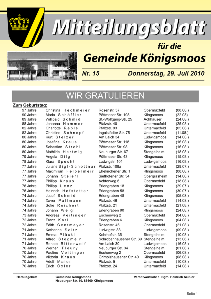 für die Gemeinde Königsmoos Nr. Nr. 15 15 Donnerstag, Donnerstag, 29. 29. Juli Juli 2010 2010 WIR WIR GRATULIEREN GRATULIEREN Zum Geburtstag: Zum97Geburtstag: Jahre Christina H e c k m e i e r 97Jahre Jahre 90 90 Jahre 89 Jahre 89 Jahre 88 Jahre 88Jahre Jahre 82 82 Jahre 82 Jahre 82 Jahre 80 Jahre 80Jahre Jahre 80 80 Jahre 80 Jahre 80Jahre Jahre 80 80 Jahre 79 Jahre 79Jahre Jahre 78 78 Jahre 77 Jahre 77Jahre Jahre 77 77 Jahre 77 Jahre 77 Jahre 77 Jahre 77Jahre Jahre 76 76 Jahre 76 Jahre 76Jahre Jahre 74 74 Jahre 74 Jahre 74Jahre Jahre 74 74 Jahre 74 Jahre 74 Jahre 73 Jahre 73Jahre Jahre 72 72 Jahre 72 Jahre 72Jahre Jahre 71 71 Jahre 71 Jahre 71Jahre Jahre 71 71 Jahre 71 Jahre 71Jahre Jahre 70 70 Jahre 70 Jahre 70 Jahre 70 Jahre 70 Jahre 70 Jahre 70Jahre Jahre 70 70 Jahre Christina Maria ScH h äe fcf kl emr e i e r Maria S c Willibald S hc äh fmf li ed r Willibald H S ac m hm Johanna m iedr Johanna R He ab ml m Charlotte e er Charlotte R e b l Christine S c h n ee p f Christine Kurt S t e lSzcehr n e p f Kurt S t eK lrzaeur s Josefine Josefine Sebastian KSr tar uo sb l SebastianH S o bi gl Mathilde a rt rt w Mathilde H a r t Angela D i l g w i g AngelaS pDei lcgh t Klara Klara S Juliane Sp i gel c- h S tc h o t t n a r Juliane S i gFl e - Sl bc eh romt teni ar r Maximilian Maximilian F Johann S t e i ee lrbl e r m e i r Johann KSr taeui se r l Philipp Philipp LK er an uz s Philipp Philipp Heinrich LHeonf zs t e t t e r Heinrich Josef S cH ho mfi sdt e t t e r Josef S c h Xaver P a l l m m iadn n Xaver RPeai cl lhmear nt n Sofie Sofie RW e ieci hg el r t Johann Johann W Andreas V ee ii tgi ln g e r Andreas Franz K aVr e l itinger Franz K a r Edith C e n tl m a y e r Edith C e S n tem Katharina i t az y e r Katharina S e Emma P l ö c ki lt z Emma SPt leögcmk el i r Alfred Alfred Renate SBt iet g t emr ew ior l f Renate B i t Werner F l etuerryw o l f Werner VFel iet ui nr yg e r Pauline Pauline KVreai ut isn g e r Viktoria ViktoriaM aKi rear u s Adolf Adolf Ö Mxal ieer r Erich Erich Ö x l e r Rosenstr. 57 Obermaxfeld Rosenstr. 57 Obermaxfeld Pöttmeser Str. 198 Klingsmoos Pöttmeser Str. 198 Klingsmoos St.-Wolfgang-Str. 25 Achhäuser St.-Wolfgang-Str. 25 Achhäuser Pfalzstr. 40 Untermaxfeld Pfalzstr. 40 Untermaxfeld Pfalzstr. 93 Untermaxfeld Pfalzstr. 93 Untermaxfeld Ingolstädter Str. 75 Untermaxfeld Ingolstädter Untermaxfeld Am Laich 34 Str. 75 Ludwigsmoos Am Laich 34 Ludwigsmoos Pöttmeser Str. 118 Klingsmoos Pöttmeser Str. 118 Klingsmoos Pöttmeser Str. 98 Klingsmoos Pöttmeser Str. Str. 67 98 Klingsmoos Neuburger Stengelheim Neuburger Str. 67 Stengelheim Pöttmeser Str. 43 Klingsmoos Pöttmeser101 Str. 43 Klingsmoos Ludwigstr. Ludwigsmoos Ludwigstr. 101 Ludwigsmoos Pfalzstr. 108a Untermaxfeld Pfalzstr. 108a Untermaxfeld Ehekirchener Str. 1 Klingsmoos Ehekirchener Str. 1 Klingsmoos Siefhofener Str. 34 Obergrasheim Siefhofener Str. 34 Obergrasheim Achterweg 6 Obermaxfeld Achterweg 618 Obermaxfeld Erlengraben Klingsmoos Erlengraben 18 Klingsmoos Erlengraben 58 Klingsmoos Erlengraben48 58 Klingsmoos Erlengraben Klingsmoos Erlengraben 48 Klingsmoos Pfalzstr. 46 Untermaxfeld Pfalzstr. 46 Untermaxfeld Pfalzstr. 21 Untermaxfeld Pfalzstr. 21 Untermaxfeld Erlengraben 90 Klingsmoos Erlengraben 90 Klingsmoos Eschenweg 2 Obermaxfeld Eschenweg 2 Obermaxfeld Erlengraben 6 Klingsmoos Erlengraben 6 Klingsmoos Rosenstr. 45 Obermaxfeld Rosenstr. 45 Obermaxfeld Ludwigstr. 83 Ludwigsmoos Ludwigstr. 83 Ludwigsmoos Kehrhofstr. 35 Stengelheim Kehrhofstr. 35 Stengelheim Schrobenhausener Str. 39 Stengelheim Schrobenhausener Str. 39 Stengelheim Am Laich 30 Ludwigsmoos Am Laich 30 Ludwigsmoos Neuburger Str. 34 Stengelheim Neuburger Str. 34 Stengelheim Eschenweg 2 Obermaxfeld Eschenweg 2 Obermaxfeld Grimolzhausener Str. 40 Klingsmoos Grimolzhausener Str. 40 Untermaxfeld Klingsmoos Pfalzstr. 5 Pfalzstr.24 5 Untermaxfeld Pfalzstr. Untermaxfeld Pfalzstr. 24 Untermaxfeld (08.08.) (08.08.) (22.08) (22.08) (24.08.) (24.08.) (25.08.) (25.08.) (05.08.) (05.08.) (11.08.) (11.08.) (14.08.) (14.08.) (16.08.) (16.08.) (16.08.) (16.08.) (18.08.) (18.08.) (15.08.) (15.08.) (16.08.) (16.08.) (29.07.) (29.07.) (08.08.) (08.08.) (14.08.) (14.08.) (18.08.) (18.08.) (29.07.) (29.07.) (30.07.) (30.07.) (05.08.) (05.08.) (14.08.) (14.08.) (21.08.) (21.08.) (24.08.) (24.08.) (04.08.) (04.08.) (04.08.) (04.08.) (21.08.) (21.08.) (09.08.) (09.08.) (10.08.) (10.08.) (13.08.) (13.08.) (16.08.) (16.08.) (01.08.) (01.08.) (06.08.) (06.08.) (08.08.) (08.08.) (10.08.) (10.08.) (14.08.) (14.08.) _________________________________________________________________________________________________________ _________________________________________________________________________________________________________ Herausgeber: Gemeinde Königsmoos Verantwortlich: 1. Bgm. Heinrich Seißler Herausgeber: Gemeinde Str. Königsmoos Verantwortlich: 1. Bgm. Heinrich Seißler Neuburger 10, 86669 Königsmoos Neuburger Str. 10, 86669 Königsmoos Seite 1 Seite 1 Schwarzes Brett Gemeinde Königsmoos, Neuburger Str. 10, 86669 Königsmoos Homepage Adresse E-mail Adresse Parteiverkehr: Kontakttelefone: http://www.koenigsmoos.de [email protected] Montag mit Donnerstag Freitag von 08.00 - 12.00 Uhr von 08.00 - 12.30 Uhr Tel. 08433 / 94 09 0 Donnerstag zusätzlich Kindergarten von 13.00 - 18.30 Uhr Fax 08433 / 94 09 22 08433 / 18 59 Schule Stengelheim Schule Klingsmoos 08433 / 494 08433 / 588 Polizei Feuerwehr in absoluten Notfällen (Rettungsleitstelle) 110 ärztl. Bereitschaftsdienst 01805 / 19 12 12 Polizei Neuburg 08431 / 67 11 0 Störung Abwasseranlage: 112 112 während der Dienstzeit außerhalb der Dienstzeit Freitag Samstag/Sonntag/Feiertag von 12 - 19 Uhr von 8 - 19 Uhr 08433 / 94 09 16 Stromversorger E-ON Bayern: Störungsmeldung (rund um die Uhr) Grundversorgung / Allgemeiner Tarif Kabelpläne Vermittlung Kundencenter Fax Kundencenter 0160 / 45 20 793 08252 / 47 31 0180 / 2 19 20 91 0180 / 2 19 20 21 08441 / 75 02 31 08441 / 75 00 08441 / 75 02 22 Kirch
