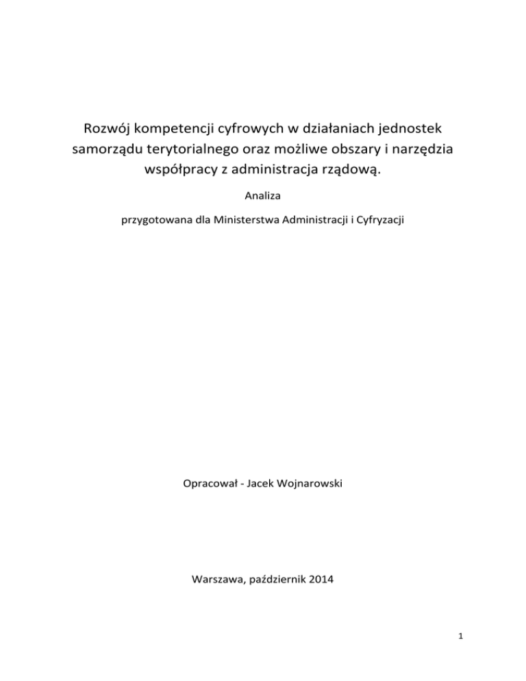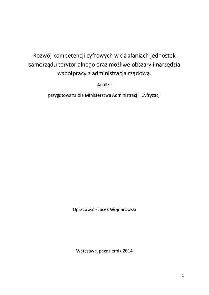 Rozwój kompetencji cyfrowych w działaniach jednostek samorządu terytorialnego oraz możliwe obszary i narzędzia współpracy z administracja rządową. Analiza przygotowana dla Ministerstwa Administracji i Cyfryzacji Opracował - Jacek Wojnarowski Warszawa, październik 2014 1 Spis treści str. Wstęp 3 Strategie rozwoju województw i RPO 4 Memorandum o współpracy na rzecz podnoszenia 13 umiejętności cyfrowych Sieć regionalnych Liderów Cyfryzacji 21 Regionalne i Lokalne Agendy Cyfrowe 21 Regionalne przeglądy/konkursy inicjatyw w zakresie 21 podnoszenia umiejętności cyfrowych Wspólne kampanie świadomościowe 21 informacyjno-edukacyjne 2 Wstęp Poszukiwanie efektywnych metod zmniejszenia ciągle licznej grupy obywateli naszego kraju niekorzystających z internetu oraz podwyższenia przez nich już posiadanych umiejętności skłania do poszukiwania sprawdzonych modeli i partnerów do współpracy w tym wielkim wyzwaniu. Kluczowym partnerem w tym zadaniu jest administracja samorządowa wszystkich szczebli i podległe im jednostki. Zwłaszcza w sytuacji, gdy około 40% środków z nowego budżetu UE będzie wydawane poprzez Regionalne Programy Operacyjne(RPO). W kończącym się budżecie (do końca 2015) w samym tylko w działaniu 8.3 POIG zakontraktowano astronomiczną kwotę 1 151 455 570 zł1 na projekty realizowane przez samorządy. Jest ono wyraźnie sprofilowane na ograniczania wykluczenia cyfrowego będącego pochodna wykluczenia społecznego, marginalizacji czy też po prostu ubóstwa. Jednak wypłaty na rzecz beneficjentów według stanu na 5 października 2014 roku stanowiły zaledwie 43,38% całkowitej kwoty alokacji2. Pomimo braku dostępnych ewaluacji działania 8.3 tylko na podstawie tych wskaźników, a także licznych modyfikacji uszczegółowienia, można przypuszczać, że pomyślna realizacja tego działania jest zagrożona. W toku prac przygotowawczych nowych programów operacyjnych nie udało się zharmonizować w wystarczającym stopniu działań podejmowanych z poziomu krajowego z działaniami w RPO. Podobna sytuacja, pomimo prób podejmowanych przez MAiC i MRR miała miejsce w latach 20132014 przy opracowywaniu i zatwierdzaniu strategii rozwoju województw, które były podstawą do formułowania RPO. Z tego względu celowe jest rozważenie niekonwencjonalnych, miękkich działań, które mogą skutecznie wpłynąć na podniesienie świadomości regionalnych i lokalnych decydentów odnośnie wagi umiejętności cyfrowych dla modernizacji kraju. 1 Społeczeństwo informacyjne w liczbach 2014, MAiC https://mac.gov.pl/file/spoleczenstwoinformacyjnewliczbach2014srodeklekkipdf 2 Portal Funduszy Europejskich - http://www.poig.gov.pl/AnalizyRaportyPodsumowania/Strony/default.aspx 3 Strategie rozwoju województw i RPO Analiza strategii rozwoju województw na lata 2015-2022 prowadzona w latach 2012 i 2013 wykazała, że w dwa spośród nich śląskie i pomorskie w znacznym stopniu uwzględniły w swoich planach tematykę społeczeństwa informacyjnego. W większości pozostałych przypadków „społeczeństwo informacyjne” było rozumiane jako tworzenie infrastruktury sieciowej, tworzenie nowych usług z zakresu e-administracji, wspieranie procesów zarządzania i administrowania – słowem sprzyjanie podaży usług. Perspektywa użytkownika (obywatela) i jego korzyści była nieobecna, a kwestia umiejętności cyfrowych (de facto warunkujących popyt) była także nieobecna. Strategia województwa śląskiego przewidywała katalog zadań dla wyspecjalizowanej jednostki jaką jest Śląskie Centrum Społeczeństwa Informacyjnego3. Uwzględniała przy tym szkolenia dla użytkowników, choć w niezbyt szerokim zakresie. Natomiast strategia województwa pomorskiego stawiała kwestie umiejętności cyfrowych na równi ze wzrostem czytelnictwa (jedyne województwo w Polsce), a uwzględnianie wymiaru cyfrowego traktowała jako zasadę horyzontalną do stosowania we wszystkich działaniach. Odwołania do wymiary cyfrowego są w syntetyczny sposób przedstawione na kilku slajdach poniżej. Strategia Rozwoju Województwa Pomorskiego 2020 Załącznik nr 1 do Uchwały nr 458/XXII/12 Sejmiku Województwa Pomorskiego z dnia 24 września 2012 roku w sprawie przyjęcia Strategii Rozwoju Województwa Pomorskiego 2020 3 www.e-slask.pl 4 5 W strategii tej warto zwrócić uwagę na slajd 2 i na dostrzeżony trend nr. 3, który dobitnie identyfikuje bieżące wyzwanie cyfrowe oraz na slajd 3 i zasadę 10 nadającą horyzontalny charakter kwestiom cyfrowym. Na dalszych slajdach są przywołane te priorytetowe zadania i ich efekty, które można z powodzeniem osiągnąć wykorzystując narzędzia cyfrowe w bibliotekach publicznych. 6 Strategia województwa śląskiego jest zobrazowana na kilku slajdach. Zwraca uwagę wskazanie kilku konkretnych przedsięwzięć dotyczących powszechnego podnoszenia umiejętności cyfrowych, edukacji nauczycieli czy tez rozwoju SEKAP-u będącego prekursorem E-PUAP-u. 7 Na powyższym slajdzie zwraca uwagę wybór info-kiosków dokonany w 2009 roku, który obecnie z perspektywy 5 lat stał się zupełnie anachroniczny wobec ekspansji urządzeń mobilnych, zwłaszcza smartfonów. Kolejny slajd pochodzący z raportu przygotowywanego dr Rafała Żelaznego z Uniwersytetu Ekonomicznego w Katowicach na sesję podsumowująca realizację Strategii w województwie śląskim. Wnioski zasadniczo powtarzalne dla całego kraju. Modyfikacja strategii rozwoju województw w celu silniejszego zaakcentowania problemu umiejętności cyfrowych jest praktycznie możliwa podczas ich śródokresowego przeglądu. Wymagałaby to bardzo ścisłej współpracy z regionami zainicjowanej przez MAiC najprawdopodobniej w ramach istniejących organizacji samorządowych. Partnerem dla tego działania mogłoby zostać Szerokie Porozumienie na rzecz umiejętności cyfrowych. Natomiast istnieją możliwości kształtowania RPO choćby odwołując się do dobrych przykładów z końc