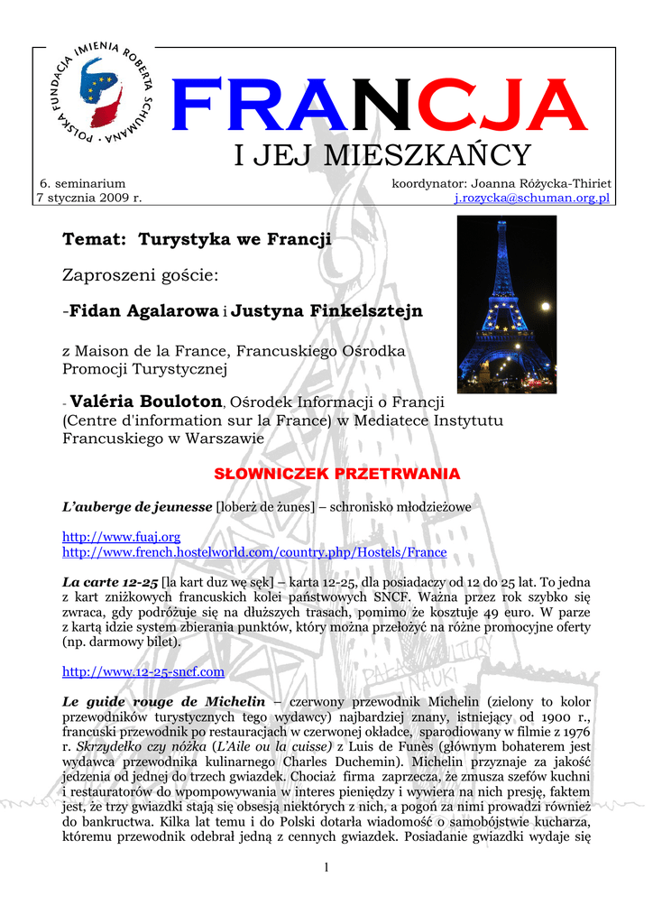 FRANCJA I JEJ MIESZKAŃCY 6. seminarium 7 stycznia 2009 r. koordynator: Joanna Różycka-Thiriet [email protected] Temat: Turystyka we Francji Zaproszeni goście: -Fidan Agalarowa i Justyna Finkelsztejn z Maison de la France, Francuskiego Ośrodka Promocji Turystycznej - Valéria Bouloton, Ośrodek Informacji o Francji (Centre d'information sur la France) w Mediatece Instytutu Francuskiego w Warszawie SŁOWNICZEK PRZETRWANIA L’auberge de jeunesse [loberż de żunes] – schronisko młodzieżowe http://www.fuaj.org http://www.french.hostelworld.com/country.php/Hostels/France La carte 12-25 [la kart duz wę sęk] – karta 12-25, dla posiadaczy od 12 do 25 lat. To jedna z kart zniżkowych francuskich kolei państwowych SNCF. Ważna przez rok szybko się zwraca, gdy podróżuje się na dłuższych trasach, pomimo że kosztuje 49 euro. W parze z kartą idzie system zbierania punktów, który można przełożyć na różne promocyjne oferty (np. darmowy bilet). http://www.12-25-sncf.com Le guide rouge de Michelin – czerwony przewodnik Michelin (zielony to kolor przewodników turystycznych tego wydawcy) najbardziej znany, istniejący od 1900 r., francuski przewodnik po restauracjach w czerwonej okładce, sparodiowany w filmie z 1976 r. Skrzydełko czy nóżka (L’Aile ou la cuisse) z Luis de Funès (głównym bohaterem jest wydawca przewodnika kulinarnego Charles Duchemin). Michelin przyznaje za jakość jedzenia od jednej do trzech gwiazdek. Chociaż firma zaprzecza, że zmusza szefów kuchni i restauratorów do wpompowywania w interes pieniędzy i wywiera na nich presję, faktem jest, że trzy gwiazdki stają się obsesją niektórych z nich, a pogoń za nimi prowadzi również do bankructwa. Kilka lat temu i do Polski dotarła wiadomość o samobójstwie kucharza, któremu przewodnik odebrał jedną z cennych gwiazdek. Posiadanie gwiazdki wydaje się 1 szczególnie ważne nie w dużych, ale w mniejszych miejscowościach, gdzie klienci rzadziej się trafiają. DOBRZE POWIEDZIANE – FRAZA DNIA Partir, c'est mourir un peu (Wyjechać, to trochę umrzeć) - E. Haraucourt Partir, c'est crever un pneu ! (Wyjechać, to złapać gumę) - Coluche JAK TO SIĘ JE, CZYLI O FRANCUSKICH ZWYCZAJACH Journées du patrimoine – Dni Dziedzictwa. W 1984 roku po raz pierwszy odbył się w trzecią niedzielę września Dzień Otwartych Drzwi w Zabytkach Historycznych. Ponieważ ideę podchwyciły inne kraje w 1991 roku Rada Europy oficjalnie ustanowiła Europejskie Dni Dziedzictwa. Od 1992 roku francuska impreza zmienia więc nazwę na Dni Dziedzictwa i trwa cały trzeci weekend września. Atrakcyjność tego wydarzenia polega na tym, że zwiedzić można nie tylko obiekty tradycyjnie otwarte, ale też te, które są zwykle niedostępne np. właściciele oprowadzają po prywatnych domach mieszczących się w zabytkowych budynkach. Ponieważ wizyty cieszą się wielkim powodzeniem często po wejściówki należy się wcześniej zgłaszać. Więcej: http://www.journeesdupatrimoine.culture.fr La Carte aux trésors - Mapa Skarbów nadawana na kanale publicznej telewizji France 3 jest zmodernizowaną wersją słynnego telewizyjnego programu z lat 80-tych La Chasse aux trésors (fani emisji do dziś wspominają ten program i uczestniczącego w nich reportera Philippe'a de Dieuleveult, który zginął w 1985 roku). Chociaż dwoje uczestników zabawy ma do swojej dyspozycji helikoptery z pilotem, muszą być oni przygotowani na bieg, podróżowanie każdym możliwym środkiem lokomocji, pukanie do domów i zaczepianie obcych osób. Wszystko po to, by znaleźć tytułowe skarby. Oprócz dobrych ludzi do rozwiązania prowadzą ich zagadki i pokrętne wskazówki polegające na grze słów, odnoszące się do historii kultury i geografii regionu, w którym kręcony jest dany program. Zaletą emisji jest to, że przybliża interesujące miejsca i obiekty w najbliższym sąsiedztwie. Więcej: http://carteauxtresors.france3.fr/index-fr.php INTERNET – CO W TRAWIE PISZCZY www.voyages-sncf.com - strona Société nationale des chemins de fer France (Narodowe Towarzystwo Kolei Francji), odpowiednika PKP. Na stronie możliwość podejrzenia rozkładu pociągów, zakupienia biletów - szczególnie tańszych nie podlegających zwrotowi i wymianie tzw. biletów Prems (sprytni Francuzi handlują jednak nimi na innych portalach np. (www.trocdesprems.com). Oprócz tego informacje o lotach, hotelach, wynajmie samochodów. Również w wersji angielskiej. Seminaria odbywają się pod patronatem Ambasadora Francji w Polsce 2