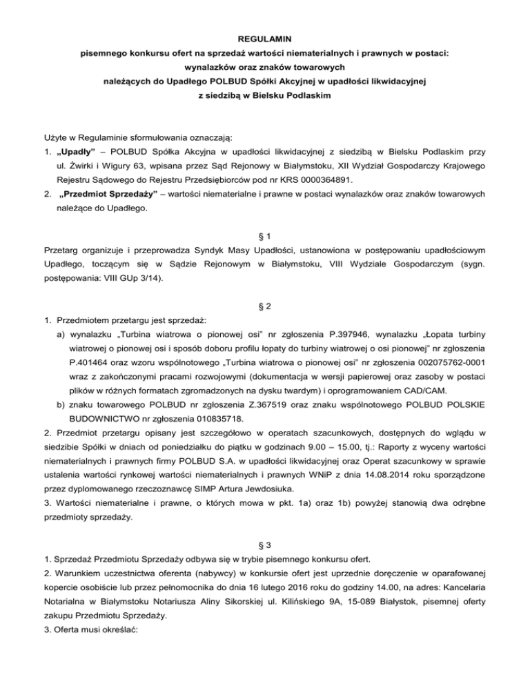 REGULAMIN pisemnego konkursu ofert na sprzedaż wartości niematerialnych i prawnych w postaci: wynalazków oraz znaków towarowych należących do Upadłego POLBUD Spółki Akcyjnej w upadłości likwidacyjnej z siedzibą w Bielsku Podlaskim Użyte w Regulaminie sformułowania oznaczają: 1. „Upadły” – POLBUD Spółka Akcyjna w upadłości likwidacyjnej z siedzibą w Bielsku Podlaskim przy ul. Żwirki i Wigury 63, wpisana przez Sąd Rejonowy w Białymstoku, XII Wydział Gospodarczy Krajowego Rejestru Sądowego do Rejestru Przedsiębiorców pod nr KRS 0000364891. 2. „Przedmiot Sprzedaży” – wartości niematerialne i prawne w postaci wynalazków oraz znaków towarowych należące do Upadłego. §1 Przetarg organizuje i przeprowadza Syndyk Masy Upadłości, ustanowiona w postępowaniu upadłościowym Upadłego, toczącym się w Sądzie Rejonowym w Białymstoku, VIII Wydziale Gospodarczym (sygn. postępowania: VIII GUp 3/14). §2 1. Przedmiotem przetargu jest sprzedaż: a) wynalazku „Turbina wiatrowa o pionowej osi” nr zgłoszenia P.397946, wynalazku „Łopata turbiny wiatrowej o pionowej osi i sposób doboru profilu łopaty do turbiny wiatrowej o osi pionowej” nr zgłoszenia P.401464 oraz wzoru wspólnotowego „Turbina wiatrowa o pionowej osi” nr zgłoszenia 002075762-0001 wraz z zakończonymi pracami rozwojowymi (dokumentacja w wersji papierowej oraz zasoby w postaci plików w różnych formatach zgromadzonych na dysku twardym) i oprogramowaniem CAD/CAM. b) znaku towarowego POLBUD nr zgłoszenia Z.367519 oraz znaku wspólnotowego POLBUD POLSKIE BUDOWNICTWO nr zgłoszenia 010835718. 2. Przedmiot przetargu opisany jest szczegółowo w operatach szacunkowych, dostępnych do wglądu w siedzibie Spółki w dniach od poniedziałku do piątku w godzinach 9.00 – 15.00, tj.: Raporty z wyceny wartości niematerialnych i prawnych firmy POLBUD S.A. w upadłości likwidacyjnej oraz Operat szacunkowy w sprawie ustalenia wartości rynkowej wartości niematerialnych i prawnych WNiP z dnia 14.08.2014 roku sporządzone przez dyplomowanego rzeczoznawcę SIMP Artura Jewdosiuka. 3. Wartości niematerialne i prawne, o których mowa w pkt. 1a) oraz 1b) powyżej stanowią dwa odrębne przedmioty sprzedaży. §3 1. Sprzedaż Przedmiotu Sprzedaży odbywa się w trybie pisemnego konkursu ofert. 2. Warunkiem uczestnictwa oferenta (nabywcy) w konkursie ofert jest uprzednie doręczenie w oparafowanej kopercie osobiście lub przez pełnomocnika do dnia 16 lutego 2016 roku do godziny 14.00, na adres: Kancelaria Notarialna w Białymstoku Notariusza Aliny Sikorskiej ul. Kilińskiego 9A, 15-089 Białystok, pisemnej oferty zakupu Przedmiotu Sprzedaży. 3. Oferta musi określać: a. imię i nazwisko lub nazwę (firmę) oferenta, b. oferowaną cenę zakupu netto, tj. cenę nie obejmującą jakichkolwiek świadczeń publicznoprawnych (w szczególności należnego podatku od towarów i usług) lub opłat manipulacyjnych związanych ze sprzedażą. 4. Nabywca, którego oferta została uznana za najkorzystniejszą i wybrana, obowiązany jest uiścić całość ceny brutto za Przedmiot Sprzedaży w terminie wyznaczonym pisemnie przez Syndyka, najpóźniej na jeden dzień przed zawarciem umowy sprzedaży. W przypadku, gdy Nabywca opóźnia się z zapłatą ceny, Syndyk może odstąpić od umowy sprzedaży bez wyznaczania terminu dodatkowego. 5. Oferty określające zasady zapłaty lub zawarcia umowy odmiennie, niż stanowi o tym niniejszy Regulamin (w szczególności przewidujące odroczenie zapłaty ceny, płatność ratalną) uważane będą za nieważne i nie będą brane pod uwagę przy rozstrzyganiu konkursów. §4 Cena wywoławcza Przedmiotu Sprzedaży wynosi złotych: 1. 376.624,00 zł netto dla wartości niematerialnych i prawnych wskazanych w § 2 pkt.1a) niniejszego regulaminu 2. 13.975,00 zł netto dla znaków towarowych wskazanych w § 2 pkt.1b) niniejszego regulaminu. §5 1. Ryzyko związane z nabyciem Przedmiotu Sprzedaży przechodzi na nabywcę z chwilą zawarcia umowy sprzedaży. 2. Nabywca zobowiązany jest do pokrycia we własnym zakresie wszelkich kosztów związanych z zawarciem umowy sprzedaży, w tym podatków i innych należności publicznoprawnych. §6 1. Rozstrzygnięcia konkursu dokona syndyk najpóźniej do dnia 17 lutego 2016 roku. 2. Rozstrzygając konkurs Syndyk bierze pod uwagę wszystkie złożone oferty za wyjątkiem ofert wycofanych na piśmie przed rozstrzygnięciem konkursu. 3. Jedynym kryterium decydującym o wyborze oferty jest kryterium ceny. Syndyk obowiązana jest wybrać ofertę przewidującą najwyższą cenę spośród wszystkich ofert branych pod uwagę przy rozstrzyganiu konkursu. 4. Rozstrzygnięcie konkursu dokumentowane jest protokołem sporządzanym przez notariusza, który określa co najmniej: a. przedmiot sprzedaży, b. oferty brane pod uwagę przy rozstrzygnięciu konkursu poprzez wskazanie oferentów oraz proponowanych przez nich cen, c. oferty nie brane pod uwagę przy rozstrzygnięciu konkursu oraz powód zdyskwalifikowania oferty, d. ofertę wybraną jako najkorzystniejszą. 5. O rozstrzygnięciu konkursu Syndyk zawiadamia pisemnie lub drogą mailową wszystkich oferentów w terminie maksymalnie siedmiu dni od rozstrzygnięcia konkursu. Oferenta, którego ofertę wybrano Syndyk wzywa do uiszczenia ceny na wskazany rachunek bankowy w wyznaczonym terminie oraz do zawarcia umowy sprzedaży. 6. Rozstrzygnięcie konkursu i wybór oferty najkorzystniejszej stanowi podstawę do zawarcia z Syndykiem przez oferenta, który złożył wybraną ofertę umowy sprzedaży Przedmiotu Sprzedaży za cenę wskazaną w ofercie oraz na warunkach określonych w niniejszym Regulaminie. 7. Postanowienia ust. 6 stosuje się odpowiednio do sytuacji opisanych w § 7. §7 1. W przypadku, gdy co najmniej dwie oferty proponują identyczne, najkorzystniejsze ceny, Syndyk może według własnego uznania: a. wezwać oferentów, którzy złożyli równorzędne oferty do złożenia do