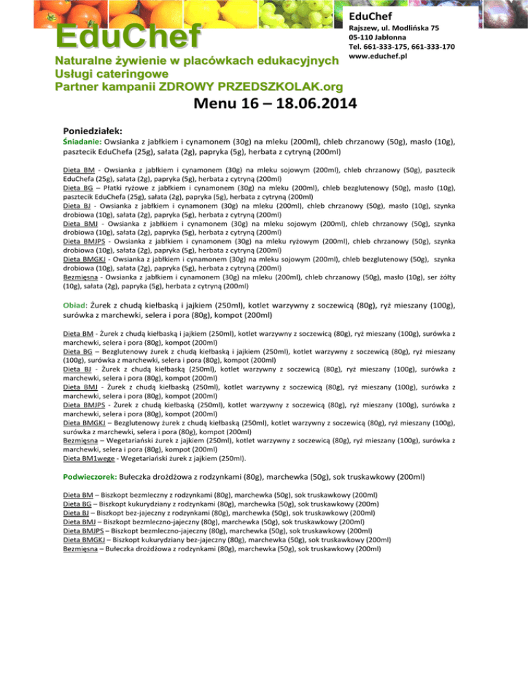 EduChef EduChef Naturalne żywienie w placówkach edukacyjnych Usługi cateringowe Partner kampanii ZDROWY PRZEDSZKOLAK.org Rajszew, ul. Modlińska 75 05-110 Jabłonna Tel. 661-333-175, 661-333-170 www.educhef.pl Menu 16 – 18.06.2014 Poniedziałek: Śniadanie: Owsianka z jabłkiem i cynamonem (30g) na mleku (200ml), chleb chrzanowy (50g), masło (10g), pasztecik EduChefa (25g), sałata (2g), papryka (5g), herbata z cytryną (200ml) Dieta BM - Owsianka z jabłkiem i cynamonem (30g) na mleku sojowym (200ml), chleb chrzanowy (50g), pasztecik EduChefa (25g), sałata (2g), papryka (5g), herbata z cytryną (200ml) Dieta BG – Płatki ryżowe z jabłkiem i cynamonem (30g) na mleku (200ml), chleb bezglutenowy (50g), masło (10g), pasztecik EduChefa (25g), sałata (2g), papryka (5g), herbata z cytryną (200ml) Dieta BJ - Owsianka z jabłkiem i cynamonem (30g) na mleku (200ml), chleb chrzanowy (50g), masło (10g), szynka drobiowa (10g), sałata (2g), papryka (5g), herbata z cytryną (200ml) Dieta BMJ - Owsianka z jabłkiem i cynamonem (30g) na mleku sojowym (200ml), chleb chrzanowy (50g), szynka drobiowa (10g), sałata (2g), papryka (5g), herbata z cytryną (200ml) Dieta BMJPS - Owsianka z jabłkiem i cynamonem (30g) na mleku ryżowym (200ml), chleb chrzanowy (50g), szynka drobiowa (10g), sałata (2g), papryka (5g), herbata z cytryną (200ml) Dieta BMGKJ - Owsianka z jabłkiem i cynamonem (30g) na mleku sojowym (200ml), chleb bezglutenowy (50g), szynka drobiowa (10g), sałata (2g), papryka (5g), herbata z cytryną (200ml) Bezmięsna - Owsianka z jabłkiem i cynamonem (30g) na mleku (200ml), chleb chrzanowy (50g), masło (10g), ser żółty (10g), sałata (2g), papryka (5g), herbata z cytryną (200ml) Obiad: Żurek z chudą kiełbaską i jajkiem (250ml), kotlet warzywny z soczewicą (80g), ryż mieszany (100g), surówka z marchewki, selera i pora (80g), kompot (200ml) Dieta BM - Żurek z chudą kiełbaską i jajkiem (250ml), kotlet warzywny z soczewicą (80g), ryż mieszany (100g), surówka z marchewki, selera i pora (80g), kompot (200ml) Dieta BG – Bezglutenowy żurek z chudą kiełbaską i jajkiem (250ml), kotlet warzywny z soczewicą (80g), ryż mieszany (100g), surówka z marchewki, selera i pora (80g), kompot (200ml) Dieta BJ - Żurek z chudą kiełbaską (250ml), kotlet warzywny z soczewicą (80g), ryż mieszany (100g), surówka z marchewki, selera i pora (80g), kompot (200ml) Dieta BMJ - Żurek z chudą kiełbaską (250ml), kotlet warzywny z soczewicą (80g), ryż mieszany (100g), surówka z marchewki, selera i pora (80g), kompot (200ml) Dieta BMJPS - Żurek z chudą kiełbaską (250ml), kotlet warzywny z soczewicą (80g), ryż mieszany (100g), surówka z marchewki, selera i pora (80g), kompot (200ml) Dieta BMGKJ – Bezglutenowy żurek z chudą kiełbaską (250ml), kotlet warzywny z soczewicą (80g), ryż mieszany (100g), surówka z marchewki, selera i pora (80g), kompot (200ml) Bezmięsna – Wegetariański żurek z jajkiem (250ml), kotlet warzywny z soczewicą (80g), ryż mieszany (100g), surówka z marchewki, selera i pora (80g), kompot (200ml) Dieta BM1wege - Wegetariański żurek z jajkiem (250ml). Podwieczorek: Bułeczka drożdżowa z rodzynkami (80g), marchewka (50g), sok truskawkowy (200ml) Dieta BM – Biszkopt bezmleczny z rodzynkami (80g), marchewka (50g), sok truskawkowy (200ml) Dieta BG – Biszkopt kukurydziany z rodzynkami (80g), marchewka (50g), sok truskawkowy (200m) Dieta BJ – Biszkopt bez-jajeczny z rodzynkami (80g), marchewka (50g), sok truskawkowy (200ml) Dieta BMJ – Biszkopt bezmleczno-jajeczny (80g), marchewka (50g), sok truskawkowy (200ml) Dieta BMJPS – Biszkopt bezmleczno-jajeczny (80g), marchewka (50g), sok truskawkowy (200ml) Dieta BMGKJ – Biszkopt kukurydziany bez-jajeczny (80g), marchewka (50g), sok truskawkowy (200ml) Bezmięsna – Bułeczka drożdżowa z rodzynkami (80g), marchewka (50g), sok truskawkowy (200ml) EduChef EduChef Naturalne żywienie w placówkach edukacyjnych Usługi cateringowe Partner kampanii ZDROWY PRZEDSZKOLAK.org Rajszew, ul. Modlińska 75 05-110 Jabłonna Tel. 661-333-175, 661-333-170 www.educhef.pl Wtorek Śniadanie: Kasza manna (30g) na mleku (200ml), chleb orkiszowy (50g), masło (10g), pasta z wędzonej makreli, serka białego ze szczypiorkiem (10g), szynka wiejska (10g), papryka (5g), herbata z dzikiej róży (200ml) Dieta BM - Kasza manna (30g) na mleku sojowym (200ml), chleb orkiszowy (50g), pasta z wędzonej makreli ze szczypiorkiem (10g), szynka wiejska (10g), papryka (5g), herbata z dzikiej róży (200ml) Dieta BG - Kasza manna (30g) na mleku (200ml), chleb bezglutenowy (50g), masło (10g), pasta z wędzonej makreli, serka białego ze szczypiorkiem (10g), szynka wiejska (10g), papryka (5g), herbata z dzikiej róży (200ml) Dieta BJ - Kasza manna (30g) na mleku (200ml), chleb orkiszowy (50g), masło (10g), pasta z wędzonej makreli, serka białego ze szczypiorkiem (10g), szynka wiejska (10g), papryka (5g), herbata z dzikiej róży (200ml) Dieta BMJ - Kasza manna (30g) na mleku sojowym (200ml), chleb orkiszowy (50g), pasta z wędzonej makreli ze szczypiorkiem (10g), szynka wiejska (10g), papryka (5g), herbata z dzikiej róży (200ml) Dieta BMJPS - Kasza manna (30g) na mleku ryżowym (200ml), chleb orkiszowy (50g), pasta z wędzonej makreli ze szczypiorkiem (10g), szynka wiejska (10g), papryka (5g), herbata z dzikiej róży (200ml) Dieta BMGKJ - Kasza manna (30g) na mleku sojowym (200ml), chleb orkiszowy (50g), pasta z wędzonej makreli ze szczypiorkiem (10g), szynka wiejska (10g), papryka (5g), herbata z dzikiej róży (200ml) Bezmięsna - Kasza manna (30g) na mleku (200ml), chleb orkiszowy (50g), masło (10g), pasta z wędzonej makreli, serka białego ze szczypiorkiem (10g), ser żółty (10g), papryka (5g), herbata z dzikiej róży (200ml) Obiad: Rosół z makaronem (250ml), schab z pieca w ziołach (80g), ziemniaki z wody (100g), marchewka na ciepło (80g), kompot (200ml) Dieta BM – Rosół z makaronem (250ml), 