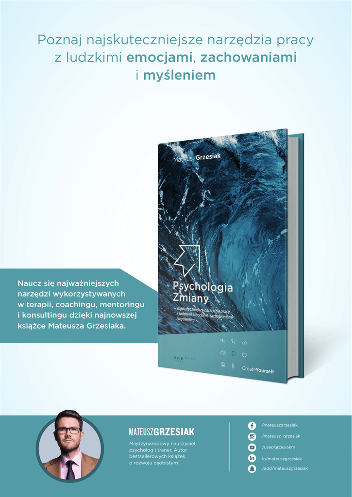 Poznaj najskuteczniejsze narzędzia pracy z ludzkimi emocjami, zachowaniami i myśleniem Naucz się najważniejszych narzędzi wykorzystywanych w terapii, coachingu, mentoringu i konsultingu dzięki najnowszej książce Mateusza Grzesiaka. /mateuszgrzesiak /mateusz_grzesiak Międzynarodowy nauczyciel, psycholog i trener. Autor bestsellerowych książek o rozwoju osobistym /user/grzesiakm in/mateuszgrzesiak /add/mateuszgrzesiak mateuszgrzesiak.com Interdyscyplinarność W dziedzinie szeroko pojmowanych nauk zajmujących się człowiekiem obserwujemy dwie tendencje. Z jednej strony mamy multiplikację dziedzin — na początku, w antyku, człowiekiem, kondycją jego umysłu, ciała i duszy, relacjami z innymi ludźmi, procesami historycznymi etc. zajmowała się przede wszystkim filozofia. Jako metanauka, matka wszystkich innych dziedzin wiedzy, stojąc w opozycji do mitu (wiara), filozofia (racjonalne rozumowanie) starała się zrozumieć całość mechanizmów rządzących światem w ogóle i człowiekiem w tym świecie w szczególe. mateuszgrzesiak.com Później nastąpiło rozbicie wiedzy na poszczególne dziedziny — filozofii pozostawiono zadanie poszukiwania niereligijnych wyjaśnień zjawisk wymykających się nauce, religia miała zadbać o aspekt duchowy, królową poznania uczyniono zaś naukę, coraz bardziej dzieląc ją i kawałkując na ścisłe specjalizacje. I tak na przykład badaniami funkcjonalnymi nad ludzkim mózgiem zajmują się dziś m.in. psychologia poznawcza, neurologia, neurobiologia, lingwistyka, biofizyka, logika i… filozofia umysłu. Specjalizacja konieczna nauki sama w sobie jest Wszak ilość wiedzy, nasza znajomość świata, możliwości jego badania stale rosną. Niestety, specjalizacji towarzyszy też inne zjawisko: zamykanie się specjalistów na wiedzę będącą domeną pokrewnych specjalizacji. Niech przykładem będzie tu medycyna, gdzie kardiolog może pozostać ślepy i głuchy na niepokojące sygnały wysyłane przez brak motywacji pacjenta, a endokrynolog nie dostrzega z kolei objawów wskazujących na psychiczne podłoże fizjologicznej dysfunkcji układu hormonalnego… Każdy „leczy” pacjenta jedynie w zakresie swojej specjalizacji i nie jest w stanie spojrzeć na niego jako całość, a w efekcie proces leczenia jest kosztowny, długotrwały i po prostu nieskuteczny. Co lekarzowi po tym, że postawi dobre diagnozy, jak pacjent mu nie zaufa i nie weźmie lekarstw? Podobny mechanizm działa także w moim środowisku zawodowym. Psychologia behawioralna, humanistyczna, analityczna, coaching — każda z tych specjalności „patrzy” na człowieka z innej strony, wypracowała inne mechanizmy poznawcze, a co za tym idzie, stosuje odmienne praktyki. People helper mateuszgrzesiak.com będący coachem dopatrzy się u klienta innych punktów zapalnych niż freudysta i zaproponuje całkowicie odmienne metody pracy z nimi. Jeśli te metody okażą się niewystarczające, to i człowiek poszukujący pomocy, i ten, który będzie chciał mu tej pomocy udzielić, poniosą klęskę. Dlaczego? Ponieważ coaching, choć oferuje ileś skutecznych narzędzi pozwalających na pomaganie ludziom, nie pozwala na dawanie rad i sugestii, bo jest ograniczony określonymi regułami. Wyobraź sobie, że możesz powiedzieć klientowi, co ma zrobić, bo dla Ciebie to łatwe, albo możesz zdiagnozować go szybciej, niż on sam mógłby to zrobić, i nie robisz tego, bo „nie wolno”. To niepraktyczne i nieetyczne, ponieważ człowiek staje się narzędziem służącym do realizacji postanowień dziedziny, a powinien być celem samym w sobie. Coach, nawet jeśli dobrze opanował swój wycinek nauki o człowieku i do perfekcji doprowadził odpowiednie w jego zakresie metody pomagania, może pozostać nieświadomy aspektów, którymi zajmują się inne specjalizacje psychologiczne, psychospołeczne, religioznawstwo etc. W tej sytuacji łatwo mogą umknąć mu problemy spoza jego „działki”. I nie o sam coaching tu chodzi, bo przykłady można by czerpać z dowolnej innej dziedziny związanej z pracą z człowiekiem — każda szkoła ma ograniczenia, wynikające z tego, że bardziej dba o własne zasady niż o kreatywną inteligencję, ponieważ to dopiero ta pomaga ludziom. Na szczęście w ostatnich latach można zaobserwować pierwsze jaskółki zmian. Coraz częściej mówi się i pisze o konieczności powrotu do postrzegania człowieka jako całości. Powoli uczymy się na nowo traktować ciało i ducha jako mechanizmy ściśle powiązane ze sobą, ale i ze środowiskiem życia (duże zasługi ma tu filozofia Wschodu). Przyczyn chorób będących zmorami naszych czasów — takich jak choroby serca, nowotwory — czy depresji upatrujemy na przykład nie tylko w zawodności naszych organizmów, lecz także w gwałtownych zmianach, które zachodzą w otoczeniu (systemie). Wszystko jest ze sobą połączone. Wówczas na pytanie: „Jakim nurtem pracujesz?”, jeśli w ogóle się ono pojawi, będzie można odpowiedzieć: „Wszystkimi” i nie wzbudzi to zdziwienia. Najwyższy czas, by także różnorodne psychologie i nauki pokrewne się do siebie zbliżyły... ...i zaczęły przenikać, po to by praktycy — coachowie, psychologowie, mentorzy, terapeuci, konsultanci, stratedzy — mogli skuteczniej pomagać swoim klientom i pacjentom, dostrzegając całość problemu, a nie tylko jego wycinek, i w zależności od diagnozy stosując metodykę tej dziedziny, która pomoże najlepiej temu konkretnemu człowiekowi. By dobrze zobrazować to, co mam na myśli, posłużę się przykładem z dziedziny sportu, ponieważ to właśnie obserwacja reguł dotyczących sportu doprowadziła mnie do stworzenia obszaru psychologii zmiany. Od lat interesuję się trenowaniem sztuk walki i jestem wielkim pasjonatem brazylijskiego jiu-jitsu. Jako wojownik można się doskonalić w bardzo wielu różnych dyscyplinach — od boksu do zapasów czy karate. Ale najlepszymi, najsku