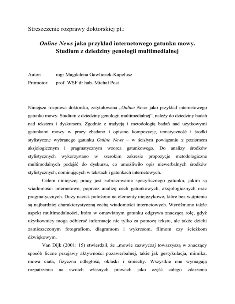 Streszczenie rozprawy doktorskiej pt.: Online News jako przykład internetowego gatunku mowy. Studium z dziedziny genologii multimedialnej Autor: mgr Magdalena Gawliczek-Kapelusz Promotor: prof. WSF dr hab. Michał Post Niniejsza rozprawa doktorska, zatytułowana „Online News jako przykład internetowego gatunku mowy. Studium z dziedziny genologii multimedialnej”, należy do dziedziny badań nad tekstem i dyskursem. Zgodnie z tradycją i metodologią badań nad użytkowymi gatunkami mowy w pracy zbadano i opisano kompozycję, tematyczność i środki stylistyczne wybranego gatunku Online News – w ścisłym powiązaniu z poziomem aksjologicznym stylistycznych i pragmatycznym wykorzystano w wzorca szerokim gatunkowego. zakresie Do analizy środków propozycje metodologiczne multimodalnych podejść do dyskursu, co umożliwiło opis niewerbalnych środków stylistycznych, dominujących w tekstach i gatunkach internetowych. Celem niniejszej pracy jest zobrazowanie specyficznego gatunku, jakim są wiadomości internetowe, poprzez analizę cech gatunkowych, aksjologicznych oraz pragmatycznych. Duży nacisk położono na elementy niejęzykowe, które bez wątpienia są najbardziej charakterystyczną cechą wiadomości internetowych. Wyróżniono także aspekt multimodalności, która w omawianym gatunku odgrywa znaczącą rolę, gdyż użytkownicy mogą odbierać informacje nie tylko za pomocą tekstu, ale także dzięki zamieszczonym fotografiom, diagramom i wykresom, filmom czy ścieżkom dźwiękowym. Van Dijk (2001: 15) stwierdził, że „mowie zazwyczaj towarzyszą w znaczący sposób liczne przejawy aktywności pozawerbalnej, takie jak gestykulacja, mimika, mowa ciała, fizyczna odległość, oklaski i śmiechy. Wszystkie one wymagają rozpatrzenia na swoich własnych prawach jako część całego zdarzenia komunikacyjnego (...). Obok brzmienia wypowiedzi, ów pozawerbalny akompaniament gra istotną rolę w interpretacji znaczeń i funkcji dyskursu”. Innymi słowy, sytuacje komunikacyjne nie składają się wyłącznie z doboru specjalnych słów, ale także z siły głosu, intonacji, mimiki czy gestów. Niniejsza praca prezentuje istotne aspekty wiadomości internetowych – podaje opis i definicję internetu, gatunków internetowych oraz wiadomości internetowych. Ponadto – z punktu widzenia badawczego – omawia podejścia metodologiczne, układ i elementy budowy wraz ze strukturą aksjologiczną, jak i wykładniki stylistyczne i ich aksjologię. Rozprawa podzielona jest na sześć rozdziałów. W rozdziale pierwszym zostały omówione ogólne cechy internetu oraz gatunków internetowych. Szeroko opisano proces ewolucji internetu oraz zmiany, jakie można było zaobserwować w jego rozwoju w ciągu ostatnich lat. W części tej przedstawiono typ języka internetowego wraz z jego właściwościami, stylem i słownictwem, udowadniając, jak bardzo jest on zróżnicowany przez wykorzystanie szerokiego zakresu e-słów i emotikonów. Poruszono także ważne współcześnie aspekty, takie jak pośpiech, zapożyczenia czy próby naśladowania mowy, które niewątpliwie mają wpływ na kształtowanie się języka. Wstępna charakterystyka gatunków internetowych ilustruje różnicę między nimi a tradycyjnymi gatunkami mowy. Założenia wspomniane w tej części potwierdzają odpowiednio dobrane przykłady. W odrębnym podrozdziale skupiono uwagę na interaktywnych funkcjach, które są nierozłącznym elementem gatunków internetowych. W rozdziale drugim przedstawiono wiadomości internetowe na tle dotychczasowych badań i istniejącej literatury. Omówiono cechy ogólne gatunku i szereg zmian, którym został poddany w ciągu ostatnich lat, a także jego rolę i wpływ na odbiorców w odniesieniu do ich potrzeb i oczekiwań. Na szczególną uwagę w tej części pracy zasługują cechy typowe dla wiadomości internetowych, odróżniające je od tradycyjnych form prezentowania wiadomości: połączenie z innymi zjawiskami internetowymi, interakcja i znacząca rola odbiorców oraz narzędzia umożliwiające przemieszczanie się do innych stron internetowych. Omawiany segment uzupełnia wzór gatunku Online News wraz z typowym językiem używanym zarówno przez autora, jak i odbiorców. W rozdziale trzecim omówiono podejście metodologiczne oraz przedstawiono dyskusję nad tekstem i dyskursem i relacje między nimi. Istnieje wiele badań lingwistycznych sięgających lat 60. XX wieku. W tym czasie, bogatym w koncepcje i spory metodologiczne, powstała gramatyka tekstu i sformułowano główne założenia analizy dyskursu. Zaprezentowano wtedy tradycyjne i współczesne koncepcje gatunku mowy oraz wskazano miejsce wiadomości internetowych wśród pokrewnych gatunków. Obszerna część rozdziału traktuje o analitycznych narzędziach badań. Rozdział czwarty jest poświęcony strukturze kompozycyjnej wraz z podziałem na elementy metaramy i tekstu właściwego oraz ich typowym usytuowaniem wewnątrz wiadomości internetowych. Przedstawione elementy ilustrują liczne przykłady, zarówno te językowe, jak i pozajęzykowe. W celu szerszego zobrazowania omawianych aspektów w tej części pracy zamieszczono również szablon i przykładową wiadomość internetową. W rozdziale piątym skoncentrowano się na kompozycji wraz ze strukturą aksjologiczną, a dokładniej na jej dwóch typach – statycznym i dynamicznym. Innymi słowy, przedstawiono tu punkt widzenia zarówno nadawcy (statyczny), jak i odbiorcy (dynamiczny). Dynamiczny charakter odnosi się też do tematycznej organizacji wiadomości internetowych. W rozdziale szóstym zaprezentowano elementy stylistyczne wiadomości internetowych. Wyodrębniono instrumenty wartościowania, a także typologię elementów stylistycznych metaramy – czyli środków językowych i pozajęzykowych – oraz tekstu właściwego – czyli środków systemowych i tekstowych. Cytaty i przykłady użyte w pracy pochodzą ze stron internetowych, t