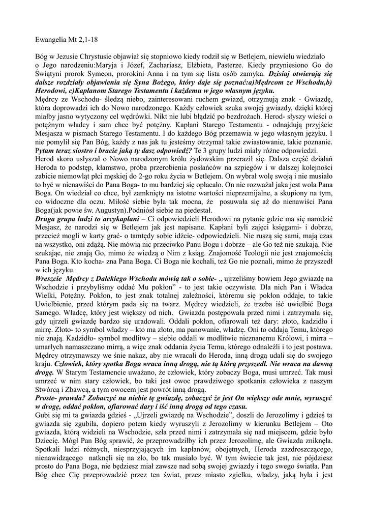 Ewangelia Mt 2,1-18 Bóg w Jezusie Chrystusie objawiał się stopniowo kiedy rodził się w Betlejem, niewielu wiedziało o Jego narodzeniu:Maryja i Józef, Zachariasz, Elżbieta, Pasterze. Kiedy przyniesiono Go do Świątyni prorok Symeon, prorokini Anna i na tym się lista osób zamyka. Dzisiaj otwierają się dalsze rozdziały objawienia się Syna Bożego, który daje się poznać:a)Mędrcom ze Wschodu,b) Herodowi, c)Kapłanom Starego Testamentu i każdemu w jego własnym języku. Mędrcy ze Wschodu- śledzą niebo, zainteresowani ruchem gwiazd, otrzymują znak - Gwiazdę, która doprowadzi ich do Nowo narodzonego. Każdy człowiek szuka swojej gwiazdy, dzięki której miałby jasno wytyczony cel wędrówki. Nikt nie lubi błądzić po bezdrożach. Herod- słyszy wieści o potężnym władcy i sam chce być potężny. Kapłani Starego Testamentu - odnajdują przyjście Mesjasza w pismach Starego Testamentu. I do każdego Bóg przemawia w jego własnym języku. I nie pomylił się Pan Bóg, każdy z nas jak tu jesteśmy otrzymał takie zwiastowanie, takie poznanie. Pytam teraz siostro i bracie jaką ty dasz odpowiedź? Te 3 grupy ludzi miały różne odpowiedzi. Herod skoro usłyszał o Nowo narodzonym królu żydowskim przeraził się. Dalsza część działań Heroda to podstęp, kłamstwo, próba przerobienia posłańców na szpiegów i w dalszej kolejności zabicie niemowląt płci męskiej do 2-go roku życia w Betlejem. On wybrał wolę swoją i nie musiało to być w nienawiści do Pana Boga- to mu bardziej się opłacało. On nie rozważał jaka jest wola Pana Boga. On wiedział co chce, był zamknięty na istotne wartości nieprzemijalne, a skupiony na tym, co widoczne dla oczu. Miłość siebie była tak mocna, że posuwała się aż do nienawiści Pana Boga(jak powie św. Augustyn).Podniósł siebie na piedestał. Druga grupa ludzi to arcykapłani – Ci odpowiedzieli Herodowi na pytanie gdzie ma się narodzić Mesjasz, że narodzi się w Betlejem jak jest napisane. Kapłani byli zajęci księgami- i dobrze, przecież mogli w karty grać- o tamtędy sobie idźcie- odpowiedzieli. Nie ruszą się sami, mają czas na wszystko, oni zdążą. Nie mówią nic przeciwko Panu Bogu i dobrze – ale Go też nie szukają. Nie szukając, nie znają Go, mimo że wiedzą o Nim z ksiąg. Znajomość Teologii nie jest znajomością Pana Boga. Kto kocha- zna Pana Boga. Ci Boga nie kochali, też Go nie poznali, mimo że przyszedł w ich języku. Wreszcie Mędrcy z Dalekiego Wschodu mówią tak o sobie- „ ujrzeliśmy bowiem Jego gwiazdę na Wschodzie i przybyliśmy oddać Mu pokłon” - to jest takie oczywiste. Dla nich Pan i Władca Wielki, Potężny. Pokłon, to jest znak totalnej zależności, któremu się pokłon oddaje, to takie Uwielbienie, przed którym pada się na twarz. Mędrcy wiedzieli, że trzeba iść uwielbić Boga Samego. Władcę, który jest większy od nich. Gwiazda postępowała przed nimi i zatrzymała się, gdy ujrzeli gwiazdę bardzo się uradowali. Oddali pokłon, ofiarowali też dary: złoto, kadzidło i mirrę. Złoto- to symbol władzy – kto ma złoto, ma panowanie, władzę. Oni to oddają Temu, którego nie znają. Kadzidło- symbol modlitwy – siebie oddali w modlitwie nieznanemu Królowi, i mirra – umarłych namaszczano mirrą, a więc znak oddania życia Temu, którego odnaleźli i to jest postawa. Mędrcy otrzymawszy we śnie nakaz, aby nie wracali do Heroda, inną drogą udali się do swojego kraju. Człowiek, który spotka Boga wraca inną drogą, nie tą którą przyszedł. Nie wraca na dawną drogę. W Starym Testamencie uważano, że człowiek, który zobaczy Boga, musi umrzeć. Tak musi umrzeć w nim stary człowiek, bo taki jest owoc prawdziwego spotkania człowieka z naszym Stwórcą i Zbawcą, a tym owocem jest powrót inną drogą. Proste- prawda? Zobaczyć na niebie tę gwiazdę, zobaczyć że jest On większy ode mnie, wyruszyć w drogę, oddać pokłon, ofiarować dary i iść inną drogą od tego czasu. Gubi się mi ta gwiazda gdzieś - „Ujrzeli gwiazdę na Wschodzie”, doszli do Jerozolimy i gdzieś ta gwiazda się zgubiła, dopiero potem kiedy wyruszyli z Jerozolimy w kierunku Betlejem – Oto gwiazda, którą widzieli na Wschodzie, szła przed nimi i zatrzymała się nad miejscem, gdzie było Dziecię. Mógł Pan Bóg sprawić, że przeprowadziłby ich przez Jerozolimę, ale Gwiazda zniknęła. Spotkali ludzi różnych, niesprzyjających im kapłanów, obojętnych, Heroda zazdroszczącego, nienawidzącego natknęli się na zło, bo tak musiało być. W tym świecie tak jest, nie pójdziesz prosto do Pana Boga, nie będziesz miał zawsze nad sobą swojej gwiazdy i tego swego światła. Pan Bóg chce Cię przeprowadzić przez ten świat, przez miasto zgiełku, władzy, jaką była i jest Jerozolima i tam też trzeba się umieć odnaleźć. Na drodze też spotkali Heroda,tzn. że na drodze do dobra stanie zło. Zawsze tak jest w tym świecie. To że tam spotkano kapłanów, niezaangażowanych szukaniem Zbawienia dla siebie – tak też będziesz mieć w swoim życiu. Też spotkasz takich i masz przez to przejść. Myślę, że nie tylko po to, zostało tu opowiedziane o Herodzie, czy arcykapłanach, aby przestrzec, gdyż na drodze do dobra stoi na tym świecie zło i obojętność, niezaangażowanie tych, którzy powinni być zaangażowani, ale też po to, aby pokazać, że Pan Bóg może zaangażować zło do swojej służby. Herod pomógł Mędrcom określić, gdzie mają iść. Zło wskazało drogę dobrą. Nienawiść wskazała drogę Miłości i tak może być na tym świecie. Nie rozpaczaj, gdy stracisz gwiazdę, nie rozpaczaj jeżeli spotkasz ludzi, którzy nie są przyjaźni tobie. Od nich też możesz się coś dowiedzieć, możesz też otrzymać światełko, jak Mędrcy otrzymali od Heroda. Najważniejsze jest, aby wiedzieć, których chcę ludzi odwzorować w swoim życiu: Mędrców, Heroda,czy arcykapłanów. O Mędrcach po