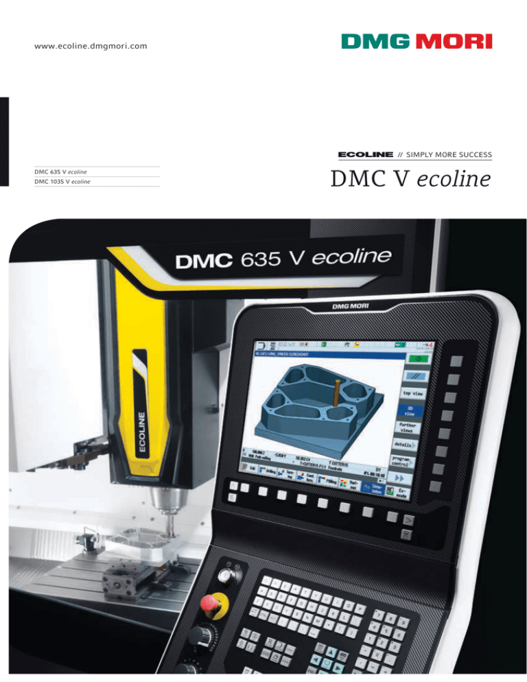 www.ecoline.dmgmori.com // SIMPLY MORE SUCCESS DMC 635 V ecoline DMC 1035 V ecoline DMC V ecoline Zalety obrabiarek Obrabiarka i technika Sterowanie Opcje / jakość i serwis Dane techniczne !!! talent Obrabiarki serii DMC V ecoline Nowa technika: dynamiczne elektrowrzeciono z prędkością obrotową 12.000 obr/min. Nowoczesne centrum obróbkowe musi być produktywne, elastyczne i proste w obsłudze. Fakt ten potwierdzają modele obrabiarek serii DMC V ecoline z konstrukcją C-Frame. Prosty w obsłudze interface, pulpit obsługowy SLIMline®, do wyboru z Operate 4.5 ze sterowaniem SIEMENS 840D solutionline lub HEIDENHAIN TNC 620 sprawiają, że obrabiarki mogą być obsługiwane zarówno przez początkujących jak i profesjonalnych operatorów, zawsze z maksymalną wydajnością. Dodatkowo uzupełniliśmy naszą ofertę o centra obróbkowe ze sterowaniem MAPPS IV MITSUBISHI. Nieważne, z jakim sterowaniem – nasze obrabiarki gwarantują Państwu najszybszą drogę od rysunku do gotowego detalu; do Państwa dyspozycji jest bogata oferta wrzecion DMG MORI i nowoczesna technika napędów z posuwem szybkim 30 m/min. Poza tym nowy, funkcjonalny design dba o optymalną przejrzystość procesów obróbkowych. 02 Zalety ++ Mocne wrzeciono [8.000 obr/min / 83 Nm (40 % ED) / 13 kW (40 % ED)] / [12.000 obr/min / 83 Nm (40 % ED) / 13 kW (40 % ED)]* ++ Magazyn o pojemności 20 narzędzi (30 narzędzi*) – z szybkim, podwójnym chwytakiem Większa przejrzystość! Lampa sygnalizacyjna LED ++ Informuje o aktualnym statusie obróbki ++ Zwiększa bezpieczeństwo procesu wytwarzania i efektywność obróbki Więcej informacji o obróbce! Wyjątkowy wyświetlacz PROGRESSline ++ Redukcja czasów pomocniczych: posuw szybki 30 m/min, czas zmiany narzędzia: 1,6 sek. ++ Produkcja pod kontrolą ++ Sztywność i stabilność korpusu oraz niewielkie wymiary obrabiarki dzięki konstrukcji C-Frame ++ Cyfrowy wyświetlacz czasu obróbki oraz liczby wykonanych sztuk z graficznym wskazaniem zaawansowania procesu ++ Duży wybór sterowań – komfortowy 15"pulpit obsługowy SLIMline® z Operate 4.5 ze sterowaniem SIEMENS 840D solutionline, 15"-pulpit obsługowy SLIMline® HEIDENHAIN TNC 620 i 10,4"-pulpit obsługowy dla stero wania MAPPS IV z MITSUBISHI ++ DMG SMARTkey® ++ DMG Netservice * opcja Więcej zalet! LIGHTline ++ Element świetlny identyfikujący markę ++ Nowoczesne wzornictwo osłon zewnętrznych z wysoką ergonomią eksploatacji 1 2 3 4 1: płytka adaptera, materiał: aluminium, wymiary: 325 × 200 × 23 mm 2: kołnierz centrujący (budowa maszyn), materiał: aluminium, wymiary: 210 × 200 × 10 mm 3: płytka złączeniowa (budowa maszyn), materiał: aluminium, wymiary: 125 × 110 × 32 mm 4: kątownik ustawczy (budowa maszyn), materiał: stal, wymiary: 98 × 54 × 10 mm 03 Większy komfort obsługi! Pulpit obsługowy SLIMline® trzeciej generacji ++ Ergonomiczny pulpit obsługowy oferuje optymalny komfort obsługi. Powierzchnie odporne na zarysowania są poza tym trwale chronione przed zużyciem. Najlepsza kontrola procesu obróbki! O 45 % większe szyby ochronne ++ Optymalny wgląd do przestrzeni roboczej ++ Optymalne oświetlenie przestrzeni roboczej dzięki zastosowaniu nowoczesnej lampy ledowej PLANONlight Nowy design! Powierzchnie hightech ++ Z materiałów odpornych na zarysowania, proste w utrzymaniu powierzchnie optymalnie nadają się do codziennej produkcji Zalety obrabiarek Obrabiarka i technika Sterowanie Opcje / jakość i serwis Dane techniczne 1 Konstrukcja C-Frame z żeliwa szarego ++ Z osią X na stole ++ Maksymalna sztywność oraz niewielkie wymiary obrabiarki 3 ++ Optymalny spływ wiórów Oś Z 4 2 Stabilność i dokładność ++ Prowadnice liniowe (wykonanie wałeczkowe) we wszystkich osiach oraz 3-punktowe podparcie korpusu łoża 3 Mocne elektrowrzeciono ++ Największa wydajność skrawania 4 Magazyn o pojemności 20 / 30* narzędzi Oś ++ Podwójny chwytak gwarancją szybkiej wymiany narzędzi 5 Nowoczesne sterowania Y 1 2 ++ Z symulacją obróbki 3D i graficznym wsparciem 04 6 Dynamiczne napędy osi ++ Posuwy 30 m/min 6 Oś X DMC 1035 V ecoline Obrabiarki serii DMC V ecoline Stabilna konstrukcja C-Frame i opcje ECOLINE. Nowa seria obrabiarek DMC V ecoline bazuje na wysoko stabilnej konstrukcji C-Frame z żeliwa szarego. W celu spełnienia wymogów produkcji nasi inżynierowie połączyli śruby pociągowo-toczne najwyższej jakości z wałeczkowymi prowadnicami liniowymi. Do Państwa dyspozycji przygotowaliśmy również bogatą ofertę opcji, np. bezpośredni system pomiaru drogi, elektrowrzeciono z prędkością obrotową 12.000 obr/min lub pakiet produkcyjny z wydajnym chłodzeniem przez środek wrzeciona (12 lub 20 bar), czy magazyn o pojemności 30 narzędzi. Poza tym niskie zużycie energii pozwala na osiągniecie dodatkowych oszczędności. !!! dokładność DMC 635 V ecoline DMC 1035 V ecoline Droga przesuwu (X / Y / Z) mm 635 / 510 / 460 1.035 / 560 / 510 Max. prędkość obrotowa wrzeciona obr/min 8.000 / 12.000* 8.000 / 12.000* Max. moment obrotowy (40 / 100 % ED) Nm 83 / 57 83 / 57 Moc napędu (40 / 100 % ED) kW 13 / 9 13 / 9 20 / 30* 20 / 30* 30 / 30 / 30 30 / 30 / 30 600 1.000 Liczba narzędzi w magazynie Posuw szybki m/min Obciążenie stołu kg * opcja 5 Oś Z 3 4 05 5 Oś Y 1 2 Oś X 6 DMC 635 V ecoline Zalety obrabiarek Obrabiarka i technika Sterowanie Opcje / jakość i serwis Dane techniczne Większa moc! 06 Szybkie złącze USB do transferu programów tworzonych na zewnątrz. Większa przejrzystość! Monitor 15"-TFT z symulacją obróbki 3D – prosta kontrola procesu. Większy komfort! Klawiatura Full-ASCII gwarancją szybkiego tworzenia opisów w programie obróbki. Większa pamięć na programy! Rozszerzenie* o 2 GB za pomocą karty CF w wersji standardowej. * tylko dla Operate 4.5 i sterowania SIEMENS 840D solutionline Większa różnorodność! Wszystkie cykle seryjne w standardzie. MAPPS IV z MITSUBISHI ++ System obsługowy MAPPS IV z konsolą stero