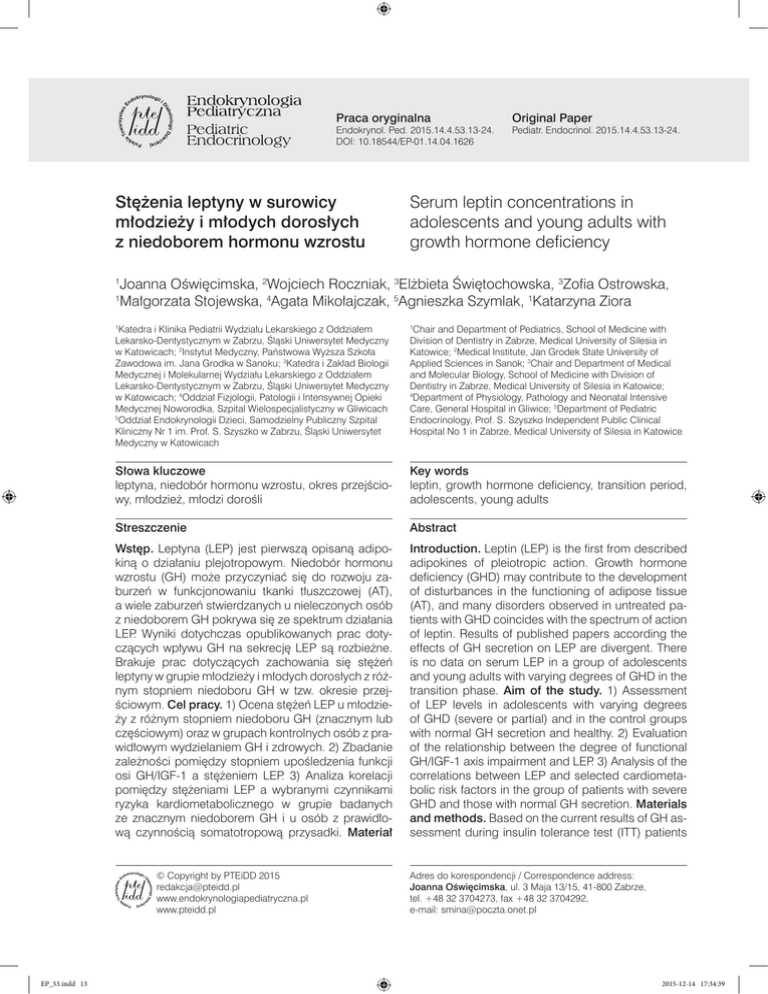 Praca oryginalna Endokrynol. Ped. 2015.14.4.53.13-24. DOI: 10.18544/EP-01.14.04.1626 Stężenia leptyny w surowicy młodzieży i młodych dorosłych z niedoborem hormonu wzrostu Original Paper Pediatr. Endocrinol. 2015.14.4.53.13-24. Serum leptin concentrations in adolescents and young adults with growth hormone deficiency Joanna Oświęcimska, 2Wojciech Roczniak, 3Elżbieta Świętochowska, 3Zofia Ostrowska, Małgorzata Stojewska, 4Agata Mikołajczak, 5Agnieszka Szymlak, 1Katarzyna Ziora 1 1 1 Katedra i Klinika Pediatrii Wydziału Lekarskiego z Oddziałem Lekarsko-Dentystycznym w Zabrzu, Śląski Uniwersytet Medyczny w Katowicach; 2Instytut Medyczny, Państwowa Wyższa Szkoła Zawodowa im. Jana Grodka w Sanoku; 3Katedra i Zakład Biologii Medycznej i Molekularnej Wydziału Lekarskiego z Oddziałem Lekarsko-Dentystycznym w Zabrzu, Śląski Uniwersytet Medyczny w Katowicach; 4Oddział Fizjologii, Patologii i Intensywnej Opieki Medycznej Noworodka, Szpital Wielospecjalistyczny w Gliwicach 5 Oddział Endokrynologii Dzieci, Samodzielny Publiczny Szpital Kliniczny Nr 1 im. Prof. S. Szyszko w Zabrzu, Śląski Uniwersytet Medyczny w Katowicach 1 Słowa kluczowe leptyna, niedobór hormonu wzrostu, okres przejściowy, młodzież, młodzi dorośli Key words leptin, growth hormone deficiency, transition period, adolescents, young adults Streszczenie Abstract Wstęp. Leptyna (LEP) jest pierwszą opisaną adipokiną o działaniu plejotropowym. Niedobór hormonu wzrostu (GH) może przyczyniać się do rozwoju zaburzeń w funkcjonowaniu tkanki tłuszczowej (AT), a wiele zaburzeń stwierdzanych u nieleczonych osób z niedoborem GH pokrywa się ze spektrum działania LEP. Wyniki dotychczas opublikowanych prac dotyczących wpływu GH na sekrecję LEP są rozbieżne. Brakuje prac dotyczących zachowania się stężeń leptyny w grupie młodzieży i młodych dorosłych z różnym stopniem niedoboru GH w tzw. okresie przejściowym. Cel pracy. 1) Ocena stężeń LEP u młodzieży z różnym stopniem niedoboru GH (znacznym lub częściowym) oraz w grupach kontrolnych osób z prawidłowym wydzielaniem GH i zdrowych. 2) Zbadanie zależności pomiędzy stopniem upośledzenia funkcji osi GH/IGF-1 a stężeniem LEP. 3) Analiza korelacji pomiędzy stężeniami LEP a wybranymi czynnikami ryzyka kardiometabolicznego w grupie badanych ze znacznym niedoborem GH i u osób z prawidłową czynnością somatotropową przysadki. Materiał Introduction. Leptin (LEP) is the first from described adipokines of pleiotropic action. Growth hormone deficiency (GHD) may contribute to the development of disturbances in the functioning of adipose tissue (AT), and many disorders observed in untreated patients with GHD coincides with the spectrum of action of leptin. Results of published papers according the effects of GH secretion on LEP are divergent. There is no data on serum LEP in a group of adolescents and young adults with varying degrees of GHD in the transition phase. Aim of the study. 1) Assessment of LEP levels in adolescents with varying degrees of GHD (severe or partial) and in the control groups with normal GH secretion and healthy. 2) Evaluation of the relationship between the degree of functional GH/IGF-1 axis impairment and LEP. 3) Analysis of the correlations between LEP and selected cardiometabolic risk factors in the group of patients with severe GHD and those with normal GH secretion. Materials and methods. Based on the current results of GH assessment during insulin tolerance test (ITT) patients © Copyright by PTEiDD 2015 [email protected] www.endokrynologiapediatryczna.pl www.pteidd.pl EP_53.indd 13 Chair and Department of Pediatrics, School of Medicine with Division of Dentistry in Zabrze, Medical University of Silesia in Katowice; 2Medical Institute, Jan Grodek State University of Applied Sciences in Sanok; 3Chair and Department of Medical and Molecular Biology, School of Medicine with Division of Dentistry in Zabrze, Medical University of Silesia in Katowice; 4 Department of Physiology, Pathology and Neonatal Intensive Care, General Hospital in Gliwice; 5Department of Pediatric Endocrinology, Prof. S. Szyszko Independent Public Clinical Hospital No 1 in Zabrze, Medical University of Silesia in Katowice Adres do korespondencji / Correspondence address: Joanna Oświęcimska, ul. 3 Maja 13/15, 41-800 Zabrze, tel. +48 32 3704273, fax +48 32 3704292, e-mail: [email protected] 2015-12-14 17:34:39 i metody. Na podstawie wyników oznaczeń GH w teście hipoglikemii poinsulinowej (ITT) pacjentów kwalifikowano do jednej z poniższych grup: 1) grupa ze znacznym niedoborem GH – NHW (26 badanych: 8 kobiet i 18 mężczyzn); 2) grupa z częściowym niedoborem GH – CNHW (22 badanych: 7 kobiet i 15 mężczyzn); 3) grupa z prawidłowym wydzielaniem GH – PWHW (28 badanych: 9 kobiet i 19 mężczyzn). Czwartą badaną grupę stanowiły osoby zdrowe – ZD (46 badanych: 15 kobiet, 31 mężczyzn). U wszystkich badanych przeprowadzono pomiary antropometryczne (wzrost, masa ciała, BMI), dokonano analizy składu ciała oraz oznaczono stężenia glukozy, lipidów, insuliny, IGF-1 i leptyny w surowicy. Wyniki. Nie stwierdzono istotnych statystycznie różnic dotyczących stężeń LEP w badanych grupach. Po obliczeniu całkowitej zawartości LEP w płynie zewnątrzkomórkowym na jednostkę masy AT (CLEP/FM) wykazano, że wartości te były istotnie statystycznie niższe w grupie NHW (p<0,01) i korelowały ze stopniem upośledzenia funkcjonowania osi GH/IGF-1. W grupie NHW stężenia leptyny korelowały dodatnio ze stężeniami triglicerydów (r=0,40; p<0,05), a ujemnie z HDL (r= – 0,34; p<0,05). U osób z prawidłowym wydzielaniem GH wykazano dodatnią zależność pomiędzy stężeniami LEP a stężeniami cholesterolu całkowitego (r=0,26; p<0,05), HDL (r=0,37; p<0,001), insuliny (r=0,30; p<0,01) i glukozy (r=0,28; p<0,05) na czczo w surowicy oraz wartościami współczynnika HOMA-IR (r=0,26; p<0,05). Wnioski. 1) Znaczny niedob