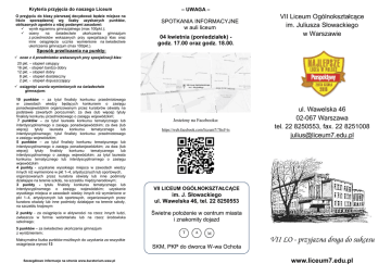 Kryteria przyjęcia do naszego Liceum O przyjęciu do klasy pierwszej decydować będzie miejsce na liście sporządzonej wg liczby uzyskanych punktów, obliczonych zgodnie z niżej podanymi zasadami: wynik egzaminu gimnazjalnego (max 100pkt.); oceny na świadectwie ukończenia gimnazjum z przedmiotów wskazanych przy specjalizacji klas oraz inne osiągnięcia ucznia wymienione na świadectwie ukończenia gimnazjum (max 100pkt.). – UWAGA – SPOTKANIA INFORMACYJNE w auli liceum 04 kwietnia (poniedziałek) godz. 17.00 oraz godz. 18.00. VII Liceum Ogólnokształcące im. Juliusza Słowackiego w Warszawie Sposób przeliczania na punkty: ocen z 4 przedmiotów wskazanych przy specjalizacji klas: 20 pkt. – stopień celujący 16 pkt. - stopień bardzo dobry 12 pkt. – stopień dobry 8 pkt. - stopień dostateczny 2 pkt. - stopień dopuszczający osiągnięć ucznia wymienionych na świadectwie gimnazjum: 10 punktów – za tytuł finalisty konkursu przedmiotowego w zawodach wiedzy będących konkursem o zasięgu ponadwojewódzkim organizowanym przez kuratorów oświaty na podstawie zawartych porozumień; za dwa (lub więcej) tytuły finalisty konkursu przedmiotowego o zasięgu wojewódzkim; 7 punktów – za tytuł laureata konkursu tematycznego lub interdyscyplinarnego o zasięgu ponadwojewódzkim; za dwa (lub więcej) tytuły laureata konkursu tematycznego lub interdyscyplinarnego; tytuł finalisty konkursu przedmiotowego o zasięgu wojewódzkim; 5 punktów – za tytuł finalisty konkursu tematycznego lub interdyscyplinarnego o zasięgu ponadwojewódzkim; za dwa (lub więcej) tytuły finalisty konkursu tematycznego lub interdyscyplinarnego o zasięgu wojewódzkim; za tytuł laureata konkursu tematycznego lub interdyscyplinarnego o zasięgu wojewódzkim 4 punkty - uzyskanie wysokiego miejsca w zawodach wiedzy innych niż wymienione w pkt 1–4, artystycznych lub sportowych, organizowanych przez kuratora oświaty lub inne podmioty działające na terenie szkoły, na szczeblu międzynarodowym; 3 punkty - tytułu finalisty konkursu tematycznego lub interdyscyplinarnego o zasięgu wojewódzkim; uzyskanie wysokiego miejsca w zawodach wiedzy innych niż wymienione w pkt 1–4, artystycznych lub sportowych, organizowanych przez kuratora oświaty lub inne podmioty działające na terenie szkoły, na szczeblu krajowym 2 punkty - za osiągnięcia w aktywności na rzecz innych ludzi, zwłaszcza w formie wolontariatu lub na rzecz środowiska szkolnego; 5 punktów – za świadectwo ukończenia gimnazjum z wyróżnieniem; Maksymalna liczba punktów możliwych do uzyskania za wszystkie osiągnięcia wynosi 13 Szczegółowe informacje na stronie www.kuratorium.waw.pl Jesteśmy na Facebooku: https://web.facebook.com/liceum7/?fref=ts ul. Wawelska 46 02-067 Warszawa tel. 22 8250553, fax. 22 8251008 [email protected] VII LICEUM OGÓLNOKSZTAŁCĄCE im. J. Słowackiego ul. Wawelska 46, tel. 22 8250553 Świetne położenie w centrum miasta i znakomity dojazd T A M VII LO - przyjazna droga do sukcesu SKM, PKP do dworca W-wa Ochota www.liceum7.edu.pl CO NAS WYRÓŻNIA SPOŚRÓD INNYCH SZKÓŁ? bogate tradycje szkoły, założonej w 1860 roku, upaństwowionej w 1922 roku; tytuł Złotej Szkoły w rankingu Perspektyw w roku 2014, 2015 i 2016 liczne wyróżnienia i certyfikaty (Szkoła Odkrywców Talentów, Szkoła Wspierająca Uzdolnionych Wars i Sawa, Szkoła z Pomysłem, II miejsce w XLVIII Warszawskiej Olimpiadzie Młodzieży kształcenie uzdolnionej młodzieży w ramach projektu „Klasa BGŻ”; wymiana z krajami Unii Europejskiej (Niemcy, Francja, Włochy, Grecja, Hiszpania, Łotwa, Chorwacja) i Turcja; Festiwale filmowe, muzyczne i taneczne; sesje naukowe poświęcone różnym tematom; bardzo dobrze wyposażone pracownie, bogate zbiory biblioteki, czytelni i wideoteki; internat działający 7 dni w tygodniu; mnóstwo atrakcyjnych zajęć pozalekcyjnych organizowanych zgodnie z zainteresowaniami uczniów; pracownia komputerowa, centrum multimedialne, stały dostęp do internetu w salach lekcyjnych, a także w szkolnej czytelni; bezpłatne WiFi dla uczniów stołówka szkolna, sklepik oraz kawiarenka; opieka pielęgniarska, pedagogiczna i psychologiczna; dwie sale gimnastyczne, sala do TRX; nowe boiska oraz bieżnia tartanowa imponujące osiągnięcia sportowe, artystyczne; przyjazna atmosfera; i moglibyśmy tak jeszcze dłuuuuugo wymieniać! Zajęcia rozszerzające program nauczania prowadzą specjaliści spoza szkoły (w tym wielu naszych absolwentów) – filmowcy, fotograficy, instruktorzy teatralni i aktorzy, dziennikarze, pracownicy naukowi Uniwersytetu Warszawskiego, innych uczelni i Polskiej Akademii Nauk. NASZA OFERTA NA ROK SZKOLNY 2016/2017 to: sześć klas pierwszych o specjalnościach: 1A – klasa o profilu prawno - politologicznym, języki obce: angielski i francuski – przy rekrutacji punktowane oceny z przedmiotów: język polski, historia, matematyka, język obcy; w programie klasy znajdują się: przedmioty nauczane obowiązkowo na poziomie rozszerzonym: historia i WOS oraz dodatkowy przedmiot do wyboru przez ucznia*; historia myśli politycznej; edukacja prawna – przedmiot uzupełniający geografia polityczna świata; udział w programach edukacyjnych dotyczących problemów prawnych; warsztaty dotyczące problemów społeczno-cywilizacyjnych; roczny kurs historii kina (opcjonalnie); coroczna dwudniowa sesja prawna z udziałem prawników, studentów i wykładowców wyższych uczelni; wykłady i warsztaty na uczelniach (SWPS, Łazarski, UW). 1B - klasa z rozszerzonym nauczaniem m.in. wiedzy o finansach i bankowości, języki obce: angielski i niemiecki – przy rekrutacji punktowane oceny z przedmiotów: język polski, matematyka, geografia, język obcy; w programie klasy znajdą się: przedmioty nauczane obowiązkowo na poziomie rozszerzonym: matematyka i geografia oraz dodatkowy przedmiot do wyboru przez ucznia*; dodatkowo angielski w biznesie – dla chętnych; wstęp do ekonomii; geo