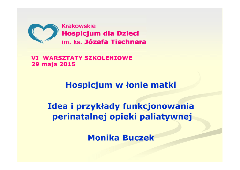 VI WARSZTATY SZKOLENIOWE 29 maja 2015 Hospicjum w łonie matki Idea i przykłady funkcjonowania perinatalnej opieki paliatywnej Monika Buczek Plan spotkania Hospicjum perinatalne – idea i sposób działania Zachodnie modele funkcjonowania Perinatalna opieka paliatywna w Polsce Hospicjum Perinatalne/ Perinatalna opieka Paliatywna opieka paliatywna ruch hospicyjny hospicjum perinatalne Hospicjum perinatalne – dlaczego jest potrzebne? Dzięki postępowi medycyny, kobieta w ciąży ma dostęp do coraz dokładniejszych metod oceny stanu dziecka w łonie matki Dostępne są coraz bardziej zaawansowane możliwości intensywnej terapii w zakresie przedłużania życia Polskie prawo zezwala na aborcję w obliczu nieuleczalnej choroby dziecka Sytuacja prawna w obliczu diagnozy letalnej choroby dziecka Ustawą z 7 stycznia 1993 r o planowaniu rodziny, ochronie płodu ludzkiego i warunkach dopuszczalności przerywania ciąży, w brzmieniu po jej nowelizacjach: Przerwanie ciąży, zgodnie z art. 4a ust.1 pkt1-3 ustawy, jest dopuszczalne wyłącznie przez lekarza w przypadku, gdy: a) ciąża stanowi zagrożenie dla życia lub zdrowia kobiety ciężarnej, b) badania prenatalne lub inne przesłanki medyczne wskazują na duże prawdopodobieństwo ciężkiego i nieodwracalnego upośledzenia płodu albo nieuleczalnej choroby zagrażającej jego życiu, c) zachodzi uzasadnione podejrzenie, że ciąża powstała w wyniku czynu zabronionego. Sytuacja prawna w obliczu diagnozy letalnej choroby dziecka W wypadku stwierdzenia dużego prawdopodobieństwa ciężkiego i nieodwracalnego upośledzenia płodu albo nieuleczalnej choroby zagrażającej jego życiu, przerwanie ciąży jest dopuszczalne: do chwili osiągnięcia przez płód zdolności do samodzielnego życia poza organizmem kobiety ciężarnej. Sytuacja kobiety w ciąży z diagnozą wady letalnej dziecka Informacja o możliwości przerwania ciąży często przedstawiona jest: -jako jedyne rozwiązanie -stronniczo -niekompletnie -pod presją czasu -jako wyraz przekonania o potrzebie ochrony kobiety i dziecka przed cierpieniem Dla osoby w kryzysie emocjonalnym bliższe jest rozwiązanie, które uruchamia znajome schematy. Sytuacja kobiety w ciąży z diagnozą wady letalnej dziecka Alternatywa wobec aborcji: rutynowa opieka perinatalna ograniczona opieka perinatalna Perinatalna opieka paliatywna Lęk przed osamotnieniem utrudnia podjęcie w pełni niezależnej decyzji. Pierwsze hospicjum perinatalne Dr Byron Calhoun i Nathan Hoeldke jako pierwsi wprowadzili perinatalną opiekę hospicyjną w 1995r w Madigan Army Medical Center, Tacoma, Washington Model wewnątrzszpitalny Pierwszy program perinatalnej opieki paliatywnej (1995-2002) 33 przypadki letalnych schorzeń zdiagnozowanych u dzieci przed urodzeniem 28 rodzin wybrało perinatalną opiekę paliatywną, zamiast aborcji (85%). 39% śmierć w łonie matki /61% żywe urodzenia (17 dzieci). Czas przeżycia: pomiędzy 20 min. a 2 mies. Perinatalna Opieka Paliatywna- definicja Opieka paliatywna nad płodem / noworodkiem / niemowlęciem z wadą letalną jest rodzajem czynnej i kompleksowej opieki trwającej od momentu diagnozy, poprzez życie dziecka aż do jego śmierci i dłużej. Obejmuje aspekty fizyczne, emocjonalne, społeczne oraz duchowe i jest ukierunkowana na poprawę jakości życia (noworodka) i wspieranie rodziny. Uwzględnia łagodzenie bolesnych objawów oraz opiekę w czasie śmierci i w okresie żałoby. Uchwała Brytyjskiego Towarzystwa Opieki Perinatalnej (2009) Perinatalna Opieka Paliatywna- definicja Perinatalna opieka paliatywna polega na zapewnieniu wsparcia rodzicom płodów i noworodków z wadami letalnymi i opieka nad noworodkami, które cierpią z powodu tych wad, mająca na celu zapewnienie komfortu oraz uchronienie od uporczywej terapii. Kładzie nacisk na kontrolę (opanowanie) objawów u dziecka, wsparcie psychologiczne, socjalne i duchowe dla rodziców, włączając w to wsparcie w okresie żałoby. Opieka nad dzieckiem może być sprawowana na oddziale neonatologicznym, bądź w domu, o ile dziecko przeżyje poród i będzie mogło być wypisane ze szpitala. Dr T. Dangel, Warszawskie Hospicjum dla Dzieci Formy pomocy udzielanej przez hospicjum perinatalne Konsultacje poprzedzające podjęcie decyzji o kontynuowaniu ciąży POMOC PSYCHOLOGICZNA - Wsparcie w radzeniu sobie z emocjonalnym szokiem - Identyfikowanie i wspieranie obszarów na które rodzice dziecka mogą mieć wpływ - Praca z żałobą - Budowanie sieci wsparcia społecznego - Planowanie z wyprzedzeniem decyzji i wyborów Formy pomocy udzielanej przez hospicjum perinatalne POMOC MEDYCZNA -konsultacje specjalistyczne dostępne na każdym etapie ciąży i po porodzie -zaznajomienie rodziców z zasadami opieki paliatywnej i już wcześniejsze dokonanie wyboru POMOC POŁOŻNICZA - wspólne przygotowanie planu porodu - możliwość zaznajomienia się z miejscem porodu POMOC SOCJALNA POMOC DUCHOWA Koordynowanie różnych form wsparcia Plan porodu: Do personelu, który będzie opiekował się nami i naszym Dzieckiem: Nasze Drogie Dziecko ………………………. otrzymało prenatalną diagnozą choroby letalnej. Jesteśmy świadomi niekorzystnej diagnozy i związanego z nią ryzyka śmierci naszego Dziecka przed urodzeniem lub wkrótce po narodzinach. Ten plan informuje o naszych preferencjach dotyczących przebiegu ciąży, porodu oraz opieki nad naszym Dzieckiem. Jest dla nas zrozumiałe, ze zarówno sytuacja, jak i nasze preferencje mogą ulec zmianie. Plan został stworzony wraz z naszym lekarzem …………………. i został przez niego zaakceptowany. …………………………………………………… Podpis Rodziców Plan porodu Zależy nam tylko na takiej opiece nad naszym dzieckiem, która zapewni mu komfort: -zapewnienie ciepła -trzymanie na rękach -oczyszczanie ust i nosa -stosowanie leków redukujących dyskomfort i ból -karmienie. Nie chcemy, aby stosowano agresywne metody przedłużania 