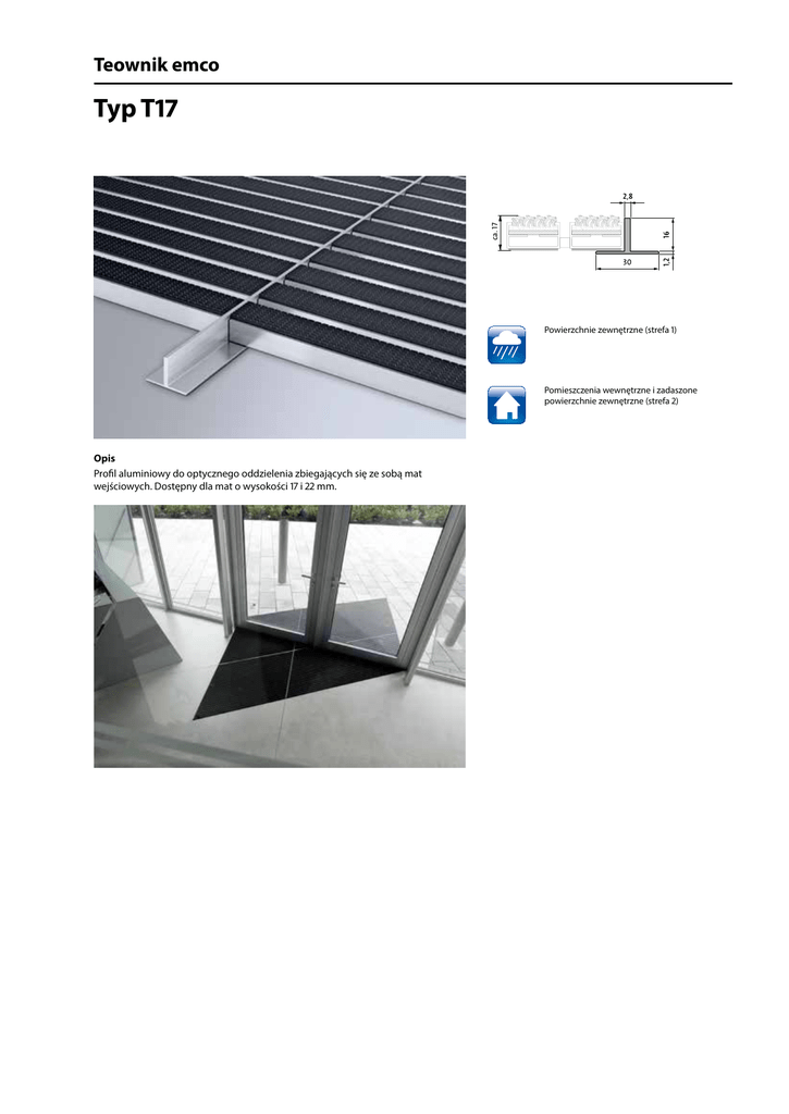 Teownik emco ca. 17 Typ T17 Powierzchnie zewnętrzne (strefa 1) Pomieszczenia wewnętrzne i zadaszone powierzchnie zewnętrzne (strefa 2) Opis Profil aluminiowy do optycznego oddzielenia zbiegających się ze sobą mat wejściowych. Dostępny dla mat o wysokości 17 i 22 mm. Teownik emco Typ T17 Systemy mat wejściowych Teownik emco Opis Profil aluminiowy do optycznego oddzielenia zbiegających się ze sobą mat wejściowych. Dostępny dla mat o wysokości 17 i 22 mm. Grubość materiału ok. (mm) 1,2 Typ T17 emco Polska Sp.z.o.o. · Ul. Makowskiego 1 · 02-784 Warszawa / PL · Tel./Fax (+48) 22 818 82 36 · [email protected] · www.emco-bau.com