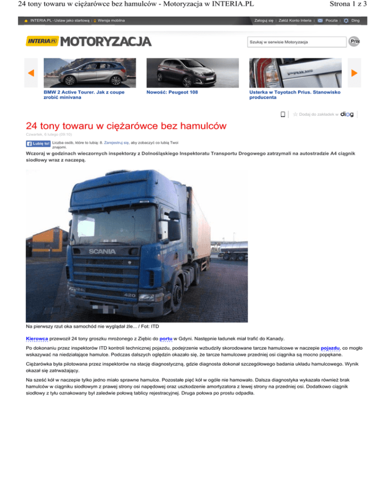 24 tony towaru w ciężarówce bez hamulców - Motoryzacja w INTERIA.PL INTERIA.PL - Ustaw jako startową Wersja mobilna Strona 1 z 3 Zaloguj się Załóż Konto Interia Poczta Ding Prze BMW 2 Active Tourer. Jak z coupe zrobić minivana Nowość: Peugeot 108 Usterka w Toyotach Prius. Stanowisko producenta Dodaj do zakładek w 24 tony towaru w ciężarówce bez hamulców Czwartek, 6 lutego (09:10) Lubię to! Liczba osób, które to lubią: 8. Zarejestruj się, aby zobaczyć co lubią Twoi znajomi. Wczoraj w godzinach wieczornych inspektorzy z Dolnośląskiego Inspektoratu Transportu Drogowego zatrzymali na autostradzie A4 ciągnik siodłowy wraz z naczepą. Na pierwszy rzut oka samochód nie wyglądał źle... / Fot: ITD Kierowca przewoził 24 tony groszku mrożonego z Ziębic do portu w Gdyni. Następnie ładunek miał trafić do Kanady. Po dokonaniu przez inspektorów ITD kontroli technicznej pojazdu, podejrzenie wzbudziły skorodowane tarcze hamulcowe w naczepie pojazdu, co mogło wskazywać na niedziałające hamulce. Podczas dalszych oględzin okazało się, że tarcze hamulcowe przedniej osi ciągnika są mocno popękane. Ciężarówka była pilotowana przez inspektorów na stację diagnostyczną, gdzie diagnosta dokonał szczegółowego badania układu hamulcowego. Wynik okazał się zatrważający. Na sześć kół w naczepie tylko jedno miało sprawne hamulce. Pozostałe pięć kół w ogóle nie hamowało. Dalsza diagnostyka wykazała również brak hamulców w ciągniku siodłowym z prawej strony osi napędowej oraz uszkodzenie amortyzatora z lewej strony na przedniej osi. Dodatkowo ciągnik siodłowy z tyłu oznakowany był zaledwie połową tablicy rejestracyjnej. Druga połowa po prostu odpadła. 24 tony towaru w ciężarówce bez hamulców - Motoryzacja w INTERIA.PL INTERIA.PL - Ustaw jako startową Wersja mobilna Strona 2 z 3 Zaloguj się Załóż Konto Interia Poczta Zardzewiała tarcza świadczy, że hamulec nie działa / Fot: ITD W wyniku dalszej kontroli okazało się, że kierowca nie rejestrował czasu prowadzenia pojazdu, obowiązkowych przerw i odpoczynków. Różnica w hamowaniu na jednej osi okazał się przerażająca / Fot: ITD Za stwierdzone naruszenia z ustawy o transporcie drogowym i usterki w pojeździe kierowca otrzymał mandat w łącznej wysokości 2,5 tys. złotych. Pojazd trafił na parking strzeżony. Ciagnik miał tylko kawałek tablicy / Fot: ITD Ding