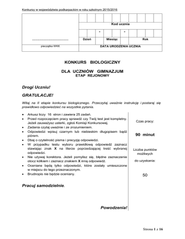 Konkursy w województwie podkarpackim w roku szkolnym 2015/2016 Kod ucznia ……………………… pieczątka WKK Dzień Miesiąc Rok DATA URODZENIA UCZNIA KONKURS BIOLOGICZNY DLA UCZNIÓW GIMNAZJUM ETAP REJONOWY Drogi Uczniu! GRATULACJE! Witaj na II etapie konkursu biologicznego. Przeczytaj uważnie instrukcję i postaraj się prawidłowo odpowiedzieć na wszystkie pytania. Arkusz liczy 16 stron i zawiera 25 zadań. Przed rozpoczęciem pracy sprawdź czy Twój test jest kompletny. Jeżeli zauważysz usterki, zgłoś Komisji Konkursowej. Zadania czytaj uważnie i ze zrozumieniem. Odpowiedzi wpisuj czarnym lub niebieskim długopisem bądź piórem. Dbaj o czytelność pisma i precyzję odpowiedzi. W przypadku testu wyboru prawidłową odpowiedź zaznacz stawiając znak X na literze poprzedzającej treść wybranej odpowiedzi. Nie używaj korektora. Jeżeli pomylisz się, błędne zaznaczenie otocz kółkiem i zaznacz znakiem X inną odpowiedź. Oceniane będą tylko odpowiedzi, które zostały umieszczone w miejscu do tego przeznaczonym. Brudnopis nie będzie oceniany. Czas pracy: 90 minut Liczba punktów możliwych do uzyskania: 50 Pracuj samodzielnie. Powodzenia! Strona 1 z 16 Konkursy w województwie podkarpackim w roku szkolnym 2015/2016 Zadanie 1. (0- 2 pkt) Temperatura mierzona na powierzchni ciała zdrowego człowieka wynosi 36,60C i waha się w ciągu doby tylko o 0,50C – 0,70C. Utrzymanie stałej temperatury ciała zapewniają mechanizmy termoregulacyjne, działające między innymi z udziałem skóry. Jakie mechanizmy termoregulacyjne działają, gdy temperatura otoczenia spada, a jakie, gdy temperatura otoczenia wzrasta? Uzupełnij tabelę, wybierając właściwe określenia podane w nawiasie. Mechanizmy termoregulacyjne SPADEK TEMPERATURY WZROST TEMPERATURY 1.Podskórne naczynia krwionośne (rozszerzają się / zwężają się) 2. Szybkość metabolizmu (zmniejsza się / zwiększa się) 3.Wydzielanie potu (wzrasta / maleje) 4. Drżenie ciała (nasila się / ustępuje) Zadanie 2. (0- 3 pkt) A. Poza udziałem w procesach termoregulacyjnych, skóra pełni jeszcze wiele innych funkcji. Wyjaśnij, na czym polega wydalnicza i wydzielnicza funkcja skóry. funkcja wydalnicza skóry _______________________________________________ _____________________________________________________________________ funkcja wydzielnicza skóry______________________________________________ _____________________________________________________________________ B. Skóra człowieka może być miejscem występowania wielu pasożytów. Są to grzyby pasożytnicze, jak również drobne stawonogi, takie jak wszy, pchły oraz kleszcze. Ich ukłucia są bolesne i dokuczliwe, a na dodatek mogą przenosić bakterie i wirusy, które wywołują poważne choroby. Jakie choroby mogą przenosić wymienione stawonogi? Przy każdej grupie pasożytów należy wpisać jeden przenoszony przez nie mikroorganizm wywołujący chorobę lub nazwę samej choroby (jeden przykład). Wszy _____________________________________________________________________ Pchły _____________________________________________________________________ Kleszcze ___________________________________________________________________ Strona 2 z 16 Konkursy w województwie podkarpackim w roku szkolnym 2015/2016 C. Na wewnętrznej powierzchni palców naskórek pokryty jest delikatnymi bruzdami w kształcie łuków, fal i pętli. Bruzdy te tworzą określony układ linii zwanych liniami papilarnymi, który jest inny dla każdego człowieka. Odciski palców są charakterystyczne dla tylko jednego człowieka, są taką jego „wizytówką”, co wykorzystywane jest w kryminalistyce. Czy u bliźniąt linie papilarne są takie same, czy różnią się tak jak u innych osób? ______________________________________________ _______________________________________________ Zadanie 3. (0-3 pkt) A. Szkielet człowieka zbudowany jest z tkanki chrzęstnej i kostnej. Spośród poniższych zdań dotyczących budowy i występowania tych tkanek wybierz dwa, które są fałszywe i dokonaj ich korekty. 1. W tkance kostnej występują komórki kostne – osteocyty, osteoklasty – komórki miejscowo rozpuszczające kość i osteoblasty – komórki kościotwórcze. 2. Tkanka kostna gąbczasta zbudowana jest z beleczek kostnych tworzących przestrzenną sieć, wypełnioną czerwonym szpikiem kostnym. 3. Tkanka chrzęstna włóknista ze względu na dużą wytrzymałość na zerwanie występuje w ścięgnach, tworzy również krążki międzykręgowe w kręgosłupie. 4. Tkanka chrzęstna w przeciwieństwie do tkanki kostnej jest mocno unerwiona i unaczyniona. 5. Tkanki łączne oporowe, do których zaliczamy tkankę chrzęstną i kostną stanowią magazyn jonów wapniowych i fosforanowych w organizmie. Korekta zdania nr ________ ___________________________________________________________________________ ___________________________________________________________________________ Korekta zdania nr _______ ___________________________________________________________________________ ___________________________________________________________________________ B. Tkanka kostna i chrzęstna są charakterystyczne dla zwierząt mających twardy wewnętrzny szkielet czyli u kręgowców. Jednak tkanka chrzęstna występuje w jednej grupie bezkręgowców. Podaj nazwę gromady i typu zwierząt bezkręgowych, które mają tkankę chrzęstną i napisz co tkanka ta u nich buduje. Typ: _______________________ Gromada:_________________________ Występowanie tkanki chrzęstnej:______________________________________________ Strona 3 z 16 Konkursy w województwie podkarpackim w roku szkolnym 2015/2016 Zadanie 4. (0-1 pkt) Badanie grupy krwi może mieć ogromne znaczenie dla zdrowia i życia człowieka. Znajomość grupy krwi pozwala na bezpieczne wykonanie transfuzji krwi, gdy dojdzie do jej znacznej utraty w wyniku wypadku lub zabiegu chirurgicznego. Aby poznać swoją grupę, wystarczy proste badani
