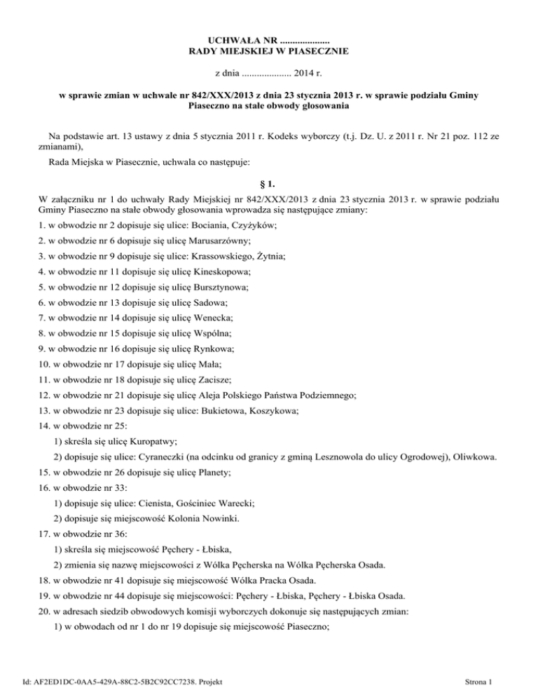 UCHWAŁA NR .................... RADY MIEJSKIEJ W PIASECZNIE z dnia .................... 2014 r. w sprawie zmian w uchwale nr 842/XXX/2013 z dnia 23 stycznia 2013 r. w sprawie podziału Gminy Piaseczno na stałe obwody głosowania Na podstawie art. 13 ustawy z dnia 5 stycznia 2011 r. Kodeks wyborczy (t.j. Dz. U. z 2011 r. Nr 21 poz. 112 ze zmianami), Rada Miejska w Piasecznie, uchwala co następuje: § 1. W załączniku nr 1 do uchwały Rady Miejskiej nr 842/XXX/2013 z dnia 23 stycznia 2013 r. w sprawie podziału Gminy Piaseczno na stałe obwody głosowania wprowadza się następujące zmiany: 1. w obwodzie nr 2 dopisuje się ulice: Bociania, Czyżyków; 2. w obwodzie nr 6 dopisuje się ulicę Marusarzówny; 3. w obwodzie nr 9 dopisuje się ulice: Krassowskiego, Żytnia; 4. w obwodzie nr 11 dopisuje się ulicę Kineskopowa; 5. w obwodzie nr 12 dopisuje się ulicę Bursztynowa; 6. w obwodzie nr 13 dopisuje się ulicę Sadowa; 7. w obwodzie nr 14 dopisuje się ulicę Wenecka; 8. w obwodzie nr 15 dopisuje się ulicę Wspólna; 9. w obwodzie nr 16 dopisuje się ulicę Rynkowa; 10. w obwodzie nr 17 dopisuje się ulicę Mała; 11. w obwodzie nr 18 dopisuje się ulicę Zacisze; 12. w obwodzie nr 21 dopisuje się ulicę Aleja Polskiego Państwa Podziemnego; 13. w obwodzie nr 23 dopisuje się ulice: Bukietowa, Koszykowa; 14. w obwodzie nr 25: 1) skreśla się ulicę Kuropatwy; 2) dopisuje się ulice: Cyraneczki (na odcinku od granicy z gminą Lesznowola do ulicy Ogrodowej), Oliwkowa. 15. w obwodzie nr 26 dopisuje się ulicę Planety; 16. w obwodzie nr 33: 1) dopisuje się ulice: Cienista, Gościniec Warecki; 2) dopisuje się miejscowość Kolonia Nowinki. 17. w obwodzie nr 36: 1) skreśla się miejscowość Pęchery - Łbiska, 2) zmienia się nazwę miejscowości z Wólka Pęcherska na Wólka Pęcherska Osada. 18. w obwodzie nr 41 dopisuje się miejscowość Wólka Pracka Osada. 19. w obwodzie nr 44 dopisuje się miejscowości: Pęchery - Łbiska, Pęchery - Łbiska Osada. 20. w adresach siedzib obwodowych komisji wyborczych dokonuje się następujących zmian: 1) w obwodach od nr 1 do nr 19 dopisuje się miejscowość Piaseczno; Id: AF2ED1DC-0AA5-429A-88C2-5B2C92CC7238. Projekt Strona 1 2) w obwodach od nr 20 do nr 22 skreśla się miejscowość Zalesie Dolne i dopisuje się miejscowość Piaseczno; 3) w obwodach nr 23, 24, 37 i 38 skreśla się miejscowość Gołków i dopisuje się miejscowość Piaseczno; 4) w obwodzie nr 44 dopisuje się ul. Królewska 91. 21. w obwodzie nr 17, w kolumnie siedziba obwodowej komisji wyborczej zmienia się nazwę z Ośrodek Kultury na Centrum Kultury. § 2. Numery i granice stałych obwodów głosowania oraz siedziby obwodowych komisji wyborczych po zmianach, o których mowa w § 1 niniejszej uchwały określa załącznik nr 1. § 3. Uchwała podlega przekazaniu Wojewodzie Mazowieckiemu oraz Komisarzowi Wyborczemu w Warszawie. § 4. Uchwała podlega ogłoszeniu w Dzienniku Urzędowym Województwa Mazowieckiego oraz podaje się ją do wiadomości w sposób zwyczajowo przyjęty tj. poprzez wywieszenie na tablicy ogłoszeń Urzędu Miasta i Gminy Piaseczno oraz poprzez zamieszczenie jej treści w BIP-ie. § 5. Wykonanie uchwały powierza się Burmistrzowi Miasta i Gminy Piaseczno. § 6. Uchwała wchodzi w życie z dniem jej podjęcia. Id: AF2ED1DC-0AA5-429A-88C2-5B2C92CC7238. Projekt Strona 2 Uzasadnienie Przedkładane zmiany mają w zasadzie charakter kosmetyczny. Do utworzonych uchwalą 842/XXX/2013 z dnia 23 stycznia 2013 roku stałych obwodów głosowania dopisuje się ulice niezamieszkałe lub miejscowości wskazane wg. adresów zameldowania wyborców, a nie umieszczone w poprzednim podziale ( poprawki opisane w § 1 w ust. od 1 – 13, 15, 16, 17.2, 18). Zmiana opisana w § 1 ust. 14 spowodowana została zmianą w nazwie ulicy. Zmiana opisana w § 1 ust. 17.1 i 19 – dotyczy przeniesienia miejscowości z obwodu 36 do 44 zmiana ta nie powoduje konieczności dokonania zmian w okręgach wyborczych ( wg. stanu na dzień podjęcia uchwały w 2013 roku zmiana ta dotyczy 86 mieszkańców, 66 wyborców ). W niniejszej uchwale dokonuje się również ujednolicenia adresów przy siedzibach obwodowych komisji wyborczych ( § 1 pkt .20 ). Załącznik nr 1 do niniejszej uchwały zawiera zmiany opisane w niniejszej uchwale. Id: AF2ED1DC-0AA5-429A-88C2-5B2C92CC7238. Projekt Strona 3 Załącznik Nr 1 do Uchwały Nr .................... Rady Miejskiej w Piasecznie z dnia....................2014 r. Nr obwodu głosowania Teren obwodu głosowania 1 Piaseczno ulica: Albatrosów 2 Piaseczno ulice: Bociania, Czyżyków, Strusia, Tukanów 3 Piaseczno ulice: Pawia, Pelikanów 4 Piaseczno ulice: Jabłoniowa, Łabędzia, Mleczarska, Powstańców Warszawy, Raszyńska, Sękocińska, Słowicza, Syrenki, Wiśniowa, Zielony Sad, Złotej Kaczki Piaseczno ulice: Aleja Róż, Sikorskiego 5 6 7 8 9 10 11 Siedziba obwodowej komisji wyborczej Gimnazjum Nr 1, ul. Sikorskiego 20 Piaseczno Gimnazjum Nr 1, ul. Sikorskiego 20 Piaseczno Gimnazjum Nr 1, ul. Sikorskiego 20 Piaseczno Gimnazjum Nr 1, ul. Sikorskiego 20 Piaseczno Szkoła Podstawowa nr 5, ul. Szkolna 14 Piaseczno Piaseczno ulice: Szkoła Podstawowa nr 5, Kusocińskiego, Marusarzówny, Wojska Polskiego od ul. Szkolna 14 nr 1 do nr 7 Piaseczno Piaseczno ulica: Szkoła Podstawowa nr 5, Szkolna ul. Szkolna 14 Piaseczno Piaseczno ulice: Przedszkole nr 4, Fabryczna, Ludowa, Puławska od nr 1 do nr 32E ul. Fabryczna 13 Piaseczno Piaseczno ulice: Przedszkole nr 4, Aleja Lotników, Dworcowa, Jana Pawła II, ul. Fabryczna 13 Kazimierza Jarząbka, Krassowskiego, Piaseczno Poniatowskiego, Saperów, Towarowa, Żytnia Piaseczno ulice: Przedszkole nr 4, Bema, Gen. Grochowskiego, Kniaziewicza, ul. Fabryczna 13 Kościelna, Mochnackiego, Nad Perełką, Piaseczno Nadarzyńska, Wojska Polskiego od nr 8 do końca Piaseczno ulice: Przedszkole nr 11, Energetyczna, Kineskopowa, Puławska od nr 34A do ul. Nefrytowa 14 końca Piaseczno Id: AF2ED1DC-0AA5-429A-88C2-