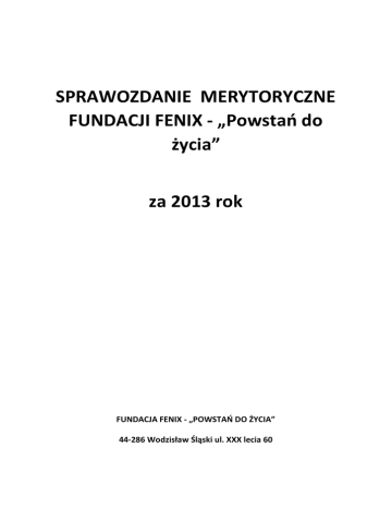 SPRAWOZDANIE MERYTORYCZNE FUNDACJI FENIX - „Powstań do życia” za 2013 rok FUNDACJA FENIX - „POWSTAŃ DO ŻYCIA” 44-286 Wodzisław Śląski ul. XXX lecia 60 SPRAWOZDANIE MERYTORYCZNE Z DZIAŁALNOŚCI FUNDACJI FENIX – "Powstań do życia" za 2013 rok I. DANE FUNDACJI 1. Informacje o Fundacji Fundacja Fenix - „Powstań do życia” z siedzibą w Wodzisławiu Śląskim, ul. XXX lecia 60 ustanowiona została aktem notarialnym spisanym w dniu 25.10.2012 roku przez Katarzynę Bosowską, zwaną „Fundatorem” i zarejestrowana w Krajowym Rejestrze Sądowym przez Sąd Rejonowy w Gliwicach X Wydział Gospodarczy pod nr KRS 0000447093 oraz otrzymała numer Regon: 243155875. Numer Identyfikacji Podatkowej to: 6472566692. Fundacja rozpoczęła działalność 10.01.2013 roku. 2. Organy Fundacji Zarząd Rada Fundacji. Zarząd jest jednoosobowy. Funkcję Prezesa Zarządu sprawuje Katarzyna Bosowska. Członkami Rady Fundacji są Małgorzata Niezgoda-Kubla oraz Anna Gałązka-Sztajer. II. ZASADY, METODY I ZAKRES DZIAŁALNOŚCI STATUTOWEJ 1. Cele statutowe Fundacji Celem statutowym Fundacji jest działalność wychowawcza, oświatowa, terapeutyczna i profilaktyczna oraz o charakterze pomocy społecznej wobec dzieci i młodzieży pochodzącej ze środowisk patologicznych i rodzin dysfunkcyjnych. Działalność ta ma umożliwić młodym ludziom osiągnięcie dojrzałej, odpowiedzialnej, wartościowej społecznie dorosłości, przygotować ich do godnego życia dorosłego zarówno od strony osobistej jak i społecznej, a przez to zmniejszyć natężenie zjawisk „dzieci ulicy”, młodych ludzi bezdomnych, bezrobotnych, schodzących na drogę patologii społecznej (alkoholizmu, narkomanii, prostytucji, przestępczości). Celami szczegółowymi Fundacji są: stwarzanie dzieciom i młodzieży pochodzącym z rodzin dysfunkcyjnych warunków rozwoju umożliwiających pokonywania obciążeń psychicznych (zwłaszcza emocjonalnych i społecznych) wynikających z życia w patologicznym środowisku rodzinnym, w ubóstwie, bezradności życiowej rodziców, działania skierowane na podnoszenie gotowości młodzieży żyjącej w trudnych warunkach bytowych, w rodzinach patologicznych do podejmowania dojrzałych i wartościowych społecznie decyzji odnośnie własnej edukacji, przyszłości zawodowej, dorosłego życia, stwarzanie możliwości rozwoju edukacyjnego dzieci i młodzieży pochodzących z rodzin dysfunkcyjnych, motywowanie ich do wysiłku edukacyjnego, podnoszenie świadomości rodzicielskiej i wychowawczej rodziców obciążonych patologią społeczną – dążenie do podjęcia przez rodziców uzależnionych leczenia, integracja dzieci i młodzieży z rodzin dysfunkcyjnych z dziećmi i młodzieżą z rodzin prawidłowo funkcjonujących, niesienie pomocy społecznej, w tym pomocy osobom podejmującym leczenie na terapiach odwykowych otwartych w oddziałach zamkniętych jak i po jej zakończeniu, świadczenie pomocy społecznej na rzecz osób współuzależnionych w trakcie terapii ich bliskich, niesienie pomocy społecznej rodzinom osób uzależnionych i współuzależnionych w trakcie i po terapii odwykowej, prowadzenie działalności w zakresie propagowania wiedzy o chorobie alkoholowej i jej skutkach, działalność na rzecz alkoholików w zakresie szkoleń zawodowych, pomocy w poszukiwaniu pracy, rozwiązywania problemów po ukończeniu terapii odwykowej, przeciwdziałanie patologiom społecznym, działalność wspomagająca technicznie, szkoleniowo, informacyjnie lub finansowo organizacje pozarządowe, działalność w zakresie integracji i organizacji czasu wolnego dla alkoholików i ich rodzin, działalność w zakresie poradnictwa prawnego w sprawach żywotnych dla alkoholików i ich rodzin. Fundacja realizuje swoje cele poprzez: organizowanie turnusów socjoterapeutycznych i profilaktycznych (na zasadach integracji młodzieży), finansowanie kursów językowych dla swoich podopiecznych, organizowanie pomocy w nauce szkolnej (korepetycje, kursy, szkolenia), finansowanie działań związanych z rozwojem zainteresowań i uzdolnień dzieci i młodzieży, zorganizowanie punktu poradnictwa dla rodziców- działającego w kierunku przekonania rodziców uzależnionych do podjęcia leczenia, zapewniającego pomoc psychologiczną rodzinom o niskim poziomie wrażliwości pedagogicznej i zaradności życiowej, organizowanie i udział w finansowaniu akcji pomocy dla alkoholików przed, w trakcie i po zakończeniu terapii odwykowej, pomoc alkoholikom w trakcie terapii odwykowej w zakupie środków czystości, odzieży, materiałów biurowych do nauki, dofinansowanie działalności rekreacyjnej dla trzeźwiejących alkoholików i ich rodzin, zakup podręczników i pomocy naukowych dla dzieci alkoholików, fundowanie stypendiów socjalnych i naukowych dla dzieci alkoholików organizowanie i udział w finansowaniu różnych form wypoczynku letniego i zimowego dla dzieci i młodzieży, organizowanie i udział w finansowaniu akcji społecznych w zakresie finansowego i psychicznego wspierania osób współuzależnionych, organizowanie i udział w finansowaniu akcji integracyjnych, mających na celu wspieranie trzeźwości, upowszechnianie wśród społeczeństwa instytucji wolontariatu, poprzez organizowanie szkoleń dla przyszłych wolontariuszy, zachęcanie młodzieży i dorosłych czynnego uczestnictwa w akcjach organizowanych przez Fundację, organizowanie, prowadzenie i wspieranie badań w zakresie związanym z celami Fundacji, organizowanie i prowadzenie szkoleń związanych z realizacją celów Fundacji. 2. Opis działalności statutowej w okresie sprawozdawczym W ramach działalności statutowej Fundacja przeprowadziła szereg projektów i zadań jednorazowych skierowanych dla pojedynczych odbiorców lub małych grup: a) bezpłatne korepetycje, b) zakup podręczników i pomocy szkolnych, c) organizacja kuligu, d) organizacja wyjazdu na lodowisko, e) organizacja wyjazdu na narty, f) organizacja li