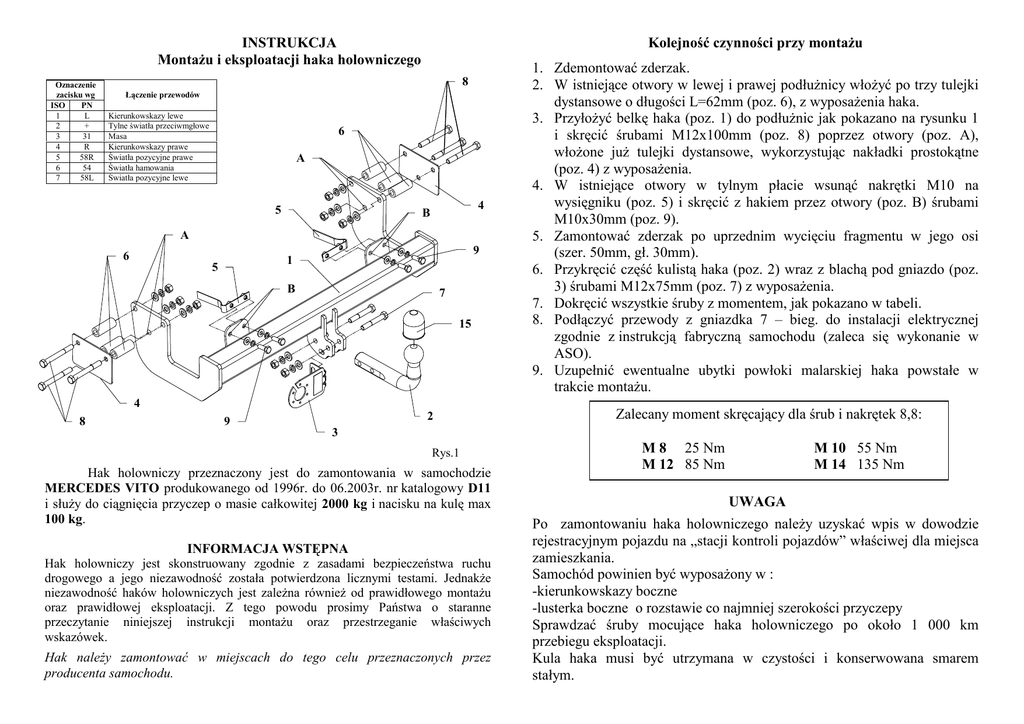 INSTRUKCJA MontaŜu i eksploatacji haka holowniczego Oznaczenie zacisku wg ISO PN 1 L 2 + 3 31 4 R 5 58R 6 54 7 58L Kolejność czynności przy montaŜu 8 Łączenie przewodów Kierunkowskazy lewe Tylne światła przeciwmgłowe Masa Kierunkowskazy prawe Światła pozycyjne prawe Światła hamowania Światła pozycyjne lewe 6 A 5 4 B A 6 9 1 5 B 7 15 4 8 9 2 1. Zdemontować zderzak. 2. W istniejące otwory w lewej i prawej podłuŜnicy włoŜyć po trzy tulejki dystansowe o długości L=62mm (poz. 6), z wyposaŜenia haka. 3. PrzyłoŜyć belkę haka (poz. 1) do podłuŜnic jak pokazano na rysunku 1 i skręcić śrubami M12x100mm (poz. 8) poprzez otwory (poz. A), włoŜone juŜ tulejki dystansowe, wykorzystując nakładki prostokątne (poz. 4) z wyposaŜenia. 4. W istniejące otwory w tylnym płacie wsunąć nakrętki M10 na wysięgniku (poz. 5) i skręcić z hakiem przez otwory (poz. B) śrubami M10x30mm (poz. 9). 5. Zamontować zderzak po uprzednim wycięciu fragmentu w jego osi (szer. 50mm, gł. 30mm). 6. Przykręcić część kulistą haka (poz. 2) wraz z blachą pod gniazdo (poz. 3) śrubami M12x75mm (poz. 7) z wyposaŜenia. 7. Dokręcić wszystkie śruby z momentem, jak pokazano w tabeli. 8. Podłączyć przewody z gniazdka 7 – bieg. do instalacji elektrycznej zgodnie z instrukcją fabryczną samochodu (zaleca się wykonanie w ASO). 9. Uzupełnić ewentualne ubytki powłoki malarskiej haka powstałe w trakcie montaŜu. Zalecany moment skręcający dla śrub i nakrętek 8,8: 3 Rys.1 Hak holowniczy przeznaczony jest do zamontowania w samochodzie MERCEDES VITO produkowanego od 1996r. do 06.2003r. nr katalogowy D11 i słuŜy do ciągnięcia przyczep o masie całkowitej 2000 kg i nacisku na kulę max 100 kg. INFORMACJA WSTĘPNA Hak holowniczy jest skonstruowany zgodnie z zasadami bezpieczeństwa ruchu drogowego a jego niezawodność została potwierdzona licznymi testami. JednakŜe niezawodność haków holowniczych jest zaleŜna równieŜ od prawidłowego montaŜu oraz prawidłowej eksploatacji. Z tego powodu prosimy Państwa o staranne przeczytanie niniejszej instrukcji montaŜu oraz przestrzeganie właściwych wskazówek. Hak naleŜy zamontować w miejscach do tego celu przeznaczonych przez producenta samochodu. M 8 25 Nm M 12 85 Nm M 10 55 Nm M 14 135 Nm UWAGA Po zamontowaniu haka holowniczego naleŜy uzyskać wpis w dowodzie rejestracyjnym pojazdu na „stacji kontroli pojazdów” właściwej dla miejsca zamieszkania. Samochód powinien być wyposaŜony w : -kierunkowskazy boczne -lusterka boczne o rozstawie co najmniej szerokości przyczepy Sprawdzać śruby mocujące haka holowniczego po około 1 000 km przebiegu eksploatacji. Kula haka musi być utrzymana w czystości i konserwowana smarem stałym. PPUH AUTO-HAK S.J. WyposaŜenie haka: Produkcja Haków Holowniczych Henryk & Zbigniew Nejman 76-200 SŁUPSK ul. Słoneczna 16K tel/fax (059) 8-414-414; 8-414-413 E-mail: [email protected] www. autohak.com.pl Hak holowniczy bez wyposaŜenia elektrycznego Klasa: A50-X Nr kat. D11 Przeznaczony do zamontowania w samochodzie: Producent: MERCEDES Model: VITO Typ: Klasa V produkowanego od 1996r. do 06.2003r. Dane techniczne: Wartość siły D : 11,27 kN maksymalna masa przyczepy: 2000 kg maksymalny nacisk na kulę: 100 kg Numer homologacji zgodnie z wytycznymi regulaminu EKG/ONZ 55.01: E20-55R-01 0826 KARTA GWARANCYJNA Producent udziela gwarancji niniejszą kartą gwarancyjną na okres 24 miesięcy licząc od dnia zakupu haka holowniczego do samochodu: MERCEDES VITO produkowanego od 1996r. do 06.2003r. Data produkcji .............................. Data zakupu.................................. Zakres gwarancji obejmuje wyłącznie wady jakościowe wynikające z winy producenta. Gwarancja nie obejmuje natomiast uszkodzeń zawinionych przez nabywcę, wynikających z niewłaściwego montaŜu, uŜytkowania lub konserwacji, uszkodzeń mechanicznych, normalnego zuŜycia podczas eksploatacji itp. Gwarancja udzielona na zakupiony towar nie wyłącza, nie ogranicza ani nie zawiesza uprawnień kupującego wynikających z niezgodności towaru z umową. Reklamacje naleŜy zgłaszać w punkcie sprzedaŜy, składając jednocześnie kartę gwarancyjną. Usunięcie "wady" następuje po stwierdzeniu przez punkt sprzedaŜy wspólnie z producentem słuszności złoŜonej reklamacji. Reklamacja powinna być załatwiona w ciągu 14 dni od dnia uznania reklamacji. Karta gwarancyjna jest niewaŜna jeŜeli nie jest wypełniona i podpisana. Data zgłoszenia reklamacji: ................................................................... INFORMACJA WSTĘPNA Hak holowniczy jest skonstruowany zgodnie z zasadami bezpieczeństwa ruchu drogowego. Hak holowniczy jest elementem wpływającym na bezpieczeństwo jazdy i moŜe zostać zainstalowany wyłącznie przez personel wyspecjalizowany. Niedopuszczalne jest dokonywanie jakichkolwiek zmian w konstrukcji haka. Powoduje to wygaśniecie dopuszczenia do stosowania. W przypadku obecności masy izolacyjnej lub osłony podwozia w miejscu przylegania haka, naleŜy ją usunąć. Nieosłonięte miejsca karoserii oraz wywiercone otwory naleŜy pomalować farbą antykorozyjną. Informacjami wiąŜącymi odnośnie wartości obciąŜeń są dane podawane przez producenta samochodu, względnie wartości maksymalnej masy przyczepy oraz maksymalnego nacisku na kulę, przy czym wartości parametrów haka holowniczego nie mogą być przekroczone. Wzór do obliczania wartości siły D: Maks. masa przyczepy [kg] x Maks. masa samochodu [kg] Maks. masa przyczepy [kg] + Maks. masa samochodu [kg] X 9,81 = 1000 D [kN]