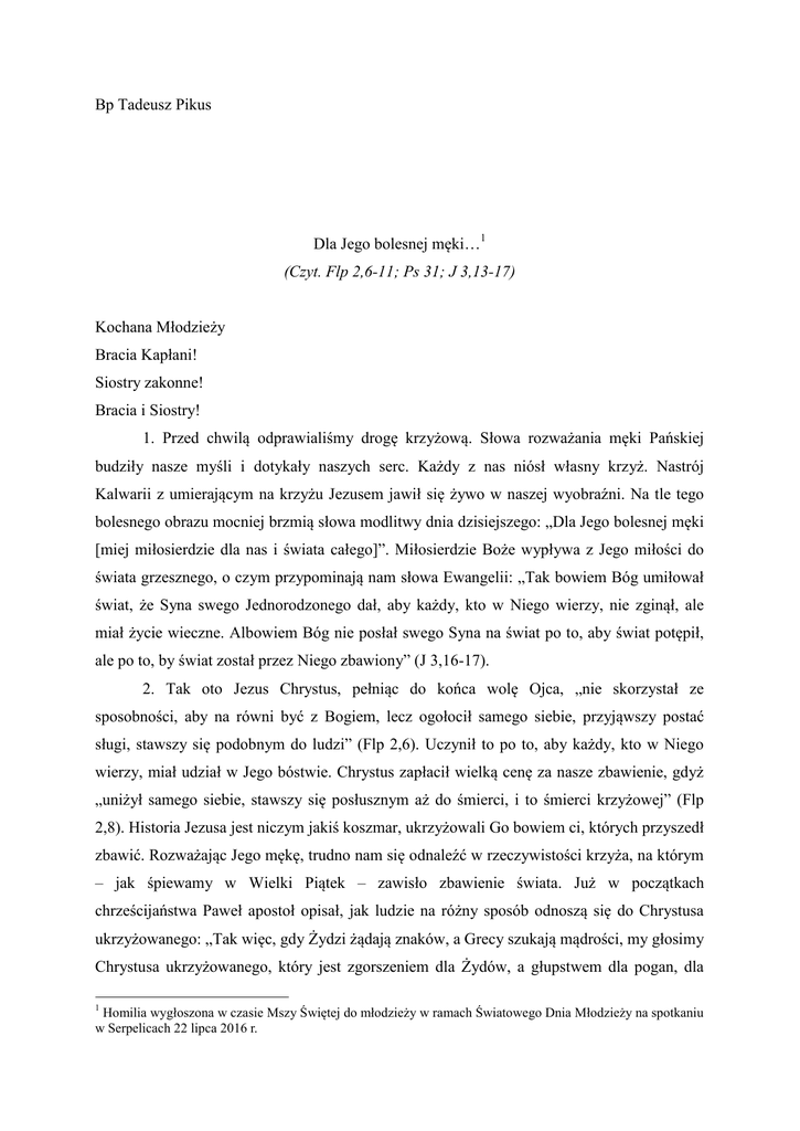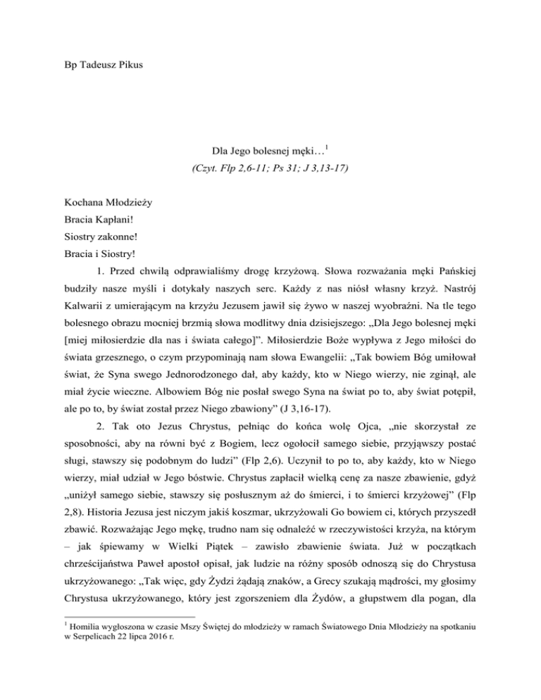 Bp Tadeusz Pikus Dla Jego bolesnej męki…1 (Czyt. Flp 2,6-11; Ps 31; J 3,13-17) Kochana Młodzieży Bracia Kapłani! Siostry zakonne! Bracia i Siostry! 1. Przed chwilą odprawialiśmy drogę krzyżową. Słowa rozważania męki Pańskiej budziły nasze myśli i dotykały naszych serc. Każdy z nas niósł własny krzyż. Nastrój Kalwarii z umierającym na krzyżu Jezusem jawił się żywo w naszej wyobraźni. Na tle tego bolesnego obrazu mocniej brzmią słowa modlitwy dnia dzisiejszego: „Dla Jego bolesnej męki [miej miłosierdzie dla nas i świata całego]”. Miłosierdzie Boże wypływa z Jego miłości do świata grzesznego, o czym przypominają nam słowa Ewangelii: „Tak bowiem Bóg umiłował świat, że Syna swego Jednorodzonego dał, aby każdy, kto w Niego wierzy, nie zginął, ale miał życie wieczne. Albowiem Bóg nie posłał swego Syna na świat po to, aby świat potępił, ale po to, by świat został przez Niego zbawiony” (J 3,16-17). 2. Tak oto Jezus Chrystus, pełniąc do końca wolę Ojca, „nie skorzystał ze sposobności, aby na równi być z Bogiem, lecz ogołocił samego siebie, przyjąwszy postać sługi, stawszy się podobnym do ludzi” (Flp 2,6). Uczynił to po to, aby każdy, kto w Niego wierzy, miał udział w Jego bóstwie. Chrystus zapłacił wielką cenę za nasze zbawienie, gdyż „uniżył samego siebie, stawszy się posłusznym aż do śmierci, i to śmierci krzyżowej” (Flp 2,8). Historia Jezusa jest niczym jakiś koszmar, ukrzyżowali Go bowiem ci, których przyszedł zbawić. Rozważając Jego mękę, trudno nam się odnaleźć w rzeczywistości krzyża, na którym – jak śpiewamy w Wielki Piątek – zawisło zbawienie świata. Już w początkach chrześcijaństwa Paweł apostoł opisał, jak ludzie na różny sposób odnoszą się do Chrystusa ukrzyżowanego: „Tak więc, gdy Żydzi żądają znaków, a Grecy szukają mądrości, my głosimy Chrystusa ukrzyżowanego, który jest zgorszeniem dla Żydów, a głupstwem dla pogan, dla 1 Homilia wygłoszona w czasie Mszy Świętej do młodzieży w ramach Światowego Dnia Młodzieży na spotkaniu w Serpelicach 22 lipca 2016 r. tych zaś, którzy są powołani, tak spośród Żydów, jak i spośród Greków, Chrystusem, mocą Bożą i mądrością Bożą” (1Kor 1,22-24). W historii chrześcijaństwa Chrystus na krzyżu doznaje zarówno czci, jak i pogardy, zaś krzyż stanowi dla jednych błogosławieństwo, dla innych zaś przekleństwo. 3. Na tym tle ludzie tworzą własną teologię krzyża, mówiąc np., że krzyż jest znakiem pokoju. Oho! Ładny znak pokoju. Krzyż jest polem walki, a nie pokoju. Bo przecież na krzyżu dokonuje się walka między życiem a śmiercią, między miłością a nienawiścią. Chrystus walczy ze śmiercią, piekłem i szatanem. Natomiast Chrystus nie walczy z człowiekiem, lecz walczy o człowieka, aby nikt nie zginął, ale miał życie wieczne w królestwie Bożym. Chrystus walczy miłością przeciw nienawiści, życiem przeciw śmierci. Pokój zaś jest owocem tej walki – powtarzam – owocem! zwycięża Chrystus – mocą miłości – śmierć, piekło i szatana. My zaś przez krzyż otrzymujemy udział w tym zwycięstwie. Jezus Chrystus zaprasza swoich uczniów, by wzięli swój krzyż i naśladowali Go. Powstaje pytanie, na ile mój krzyż jest autentyczną cząstką krzyża Chrystusowego. Czy owocem mojej walki krzyżowej jest pokój, miłość, prawda? 4. Są i tacy, którzy mówią, że krzyż to znak miłości. Jest to prawda, ale nie do końca, ponieważ krzyż – oprócz tego, że jest znakiem miłości Bożej – jest przede wszystkim znakiem naszego grzechu. Bo co oznacza krzyż? Oznacza brzemię i narzędzie śmierci, na które składają się nasze grzechy i słabości. W krzyżu Chrystusa jest twój i mój grzech. To my budujemy krzyż Chrystusowi, nie kto inny, po prostu każdy z nas. Bowiem Chrystus przychodzi właśnie do tych, którzy źle się mają, aby ich uwolnić, a jednocześnie obdarować udziałem w królestwie Bożym. To On bierze na własne ramiona nasze grzechy i dźwiga je. W warszawskiej parafii p.w. Matki Boskiej Ostrobramskiej przed wejściem do kościoła znajduje się krzyż, na którym jego twórca, zamiast pasyjki, umieścił na złączeniu dwóch belek czworo rąk, które zwarły się w uścisku. Chciał pokazać w ten sposób, że krzyż jest dziełem Boga i człowieka – na nim spotyka się Bóg miłosierny z grzesznym człowiekiem. Dlatego też, kiedy stajemy przed Bogiem przy konfesjonale, przekazujemy w wierze nasze grzechy a jednocześnie otrzymujemy od Boga dar miłości miłosiernej. Dzięki temu darowi stajemy się bliżsi Ojcu miłosiernemu (por. Łk 6,36), a słowa wypowiadanej przez nas Modlitwy Pańskiej „i odpuść nam nasze winy jako i my odpuszczamy naszym winowajcom” brzmią bardziej wiarygodnie. 5. Są też opinie, według których, krzyż powinien stać w godnym miejscu. Co to znaczy w „godnym”? Dajcie mi godne miejsce dla Boga tutaj, na ziemi. Nie ma takiego miejsca! Jednak skoro Bóg sam wybrał ziemię, posyłając tam swego Syna, to każde miejsce jest godne Jego krzyża. Każde! Bo gdzie Chrystus został ukrzyżowany? W bazylice, w królewskim zamku? Nie miejsce dodaje godności krzyżowi, lecz krzyż nadaje godność każdemu miejscu. Krzyż Chrystusa stanął poza miastem, na śmietnisku, w miejscu wzgardzonym. A jakie towarzystwo miał Chrystus? – pytamy. Było kilka życzliwych Mu osób, a reszta to tłum, który wył, szydził, bluźnił, a obok na krzyżach wisieli dwaj złoczyńcy. Takie było miejsce i takie towarzystwo. Chrystus ukrzyżowany przyjmuje takie miejsce na ziemi, jakie zgotuje Mu człowiek, jakie zgotuje Mu każdy z nas. Niekiedy chcemy utaić znak krzyża, mówiąc, że wystarczy mieć krzyż w sercu. Otóż nie, bowiem nim krzyż pojawił się w naszym sercu, to pierwej stanął na Kalwarii. Bez Chrystusowego krzyża na Kalwarii nie byłoby krzyża w