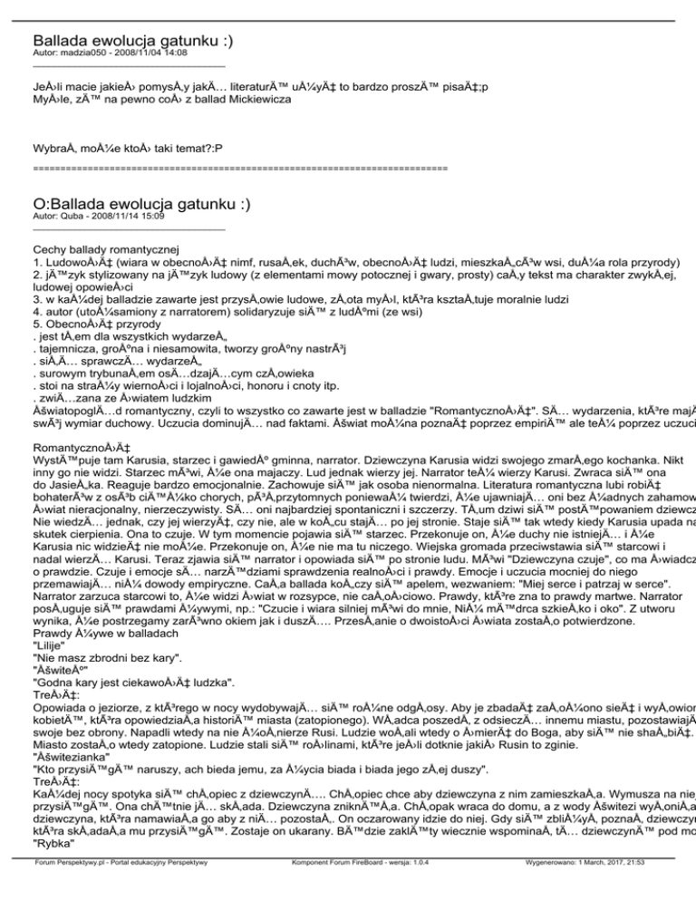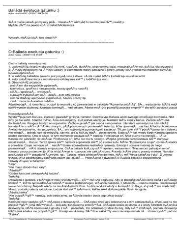 Ballada ewolucja gatunku :) Autor: madzia050 - 2008/11/04 14:08 _____________________________________ JeÅ›li macie jakieÅ› pomysÅ‚y jakÄ… literaturÄ™ użyć to bardzo proszÄ™ pisać;p MyÅ›le, zÄ™ na pewno coÅ› z ballad Mickiewicza WybraÅ‚ może ktoÅ› taki temat?:P ============================================================================ O:Ballada ewolucja gatunku :) Autor: Quba - 2008/11/14 15:09 _____________________________________ Cechy ballady romantycznej 1. Ludowość (wiara w obecność nimf, rusaÅ‚ek, duchów, obecność ludzi, mieszkaÅ„ców wsi, duża rola przyrody) 2. jÄ™zyk stylizowany na jÄ™zyk ludowy (z elementami mowy potocznej i gwary, prosty) caÅ‚y tekst ma charakter zwykÅ‚ej, ludowej opowieÅ›ci 3. w każdej balladzie zawarte jest przysÅ‚owie ludowe, zÅ‚ota myÅ›l, która ksztaÅ‚tuje moralnie ludzi 4. autor (utożsamiony z narratorem) solidaryzuje siÄ™ z ludźmi (ze wsi) 5. Obecność przyrody . jest tÅ‚em dla wszystkich wydarzeÅ„ . tajemnicza, groźna i niesamowita, tworzy groźny nastrój . siłą sprawczÄ… wydarzeÅ„ . surowym trybunaÅ‚em osÄ…dzajÄ…cym czÅ‚owieka . stoi na straży wiernoÅ›ci i lojalnoÅ›ci, honoru i cnoty itp. . zwiÄ…zana ze Å›wiatem ludzkim ÅšwiatopoglÄ…d romantyczny, czyli to wszystko co zawarte jest w balladzie "Romantyczność". SÄ… wydarzenia, które majÄ swój wymiar duchowy. Uczucia dominujÄ… nad faktami. Åšwiat można poznać poprzez empiriÄ™ ale też poprzez uczuci Romantyczność WystÄ™puje tam Karusia, starzec i gawiedź gminna, narrator. Dziewczyna Karusia widzi swojego zmarÅ‚ego kochanka. Nikt inny go nie widzi. Starzec mówi, że ona majaczy. Lud jednak wierzy jej. Narrator też wierzy Karusi. Zwraca siÄ™ ona do JasieÅ„ka. Reaguje bardzo emocjonalnie. Zachowuje siÄ™ jak osoba nienormalna. Literatura romantyczna lubi robić bohaterów z osób ciężko chorych, półprzytomnych ponieważ twierdzi, że ujawniajÄ… oni bez żadnych zahamow Å›wiat nieracjonalny, nierzeczywisty. SÄ… oni najbardziej spontaniczni i szczerzy. TÅ‚um dziwi siÄ™ postÄ™powaniem dziewcz Nie wiedzÄ… jednak, czy jej wierzyć, czy nie, ale w koÅ„cu stajÄ… po jej stronie. Staje siÄ™ tak wtedy kiedy Karusia upada na skutek cierpienia. Ona to czuje. W tym momencie pojawia siÄ™ starzec. Przekonuje on, że duchy nie istniejÄ… i że Karusia nic widzieć nie może. Przekonuje on, że nie ma tu niczego. Wiejska gromada przeciwstawia siÄ™ starcowi i nadal wierzÄ… Karusi. Teraz zjawia siÄ™ narrator i opowiada siÄ™ po stronie ludu. Mówi "Dziewczyna czuje", co ma Å›wiadcz o prawdzie. Czuje i emocje sÄ… narzÄ™dziami sprawdzenia realnoÅ›ci i prawdy. Emocje i uczucia mocniej do niego przemawiajÄ… niż dowody empiryczne. CaÅ‚a ballada koÅ„czy siÄ™ apelem, wezwaniem: "Miej serce i patrzaj w serce". Narrator zarzuca starcowi to, że widzi Å›wiat w rozsypce, nie caÅ‚oÅ›ciowo. Prawdy, które zna to prawdy martwe. Narrator posÅ‚uguje siÄ™ prawdami żywymi, np.: "Czucie i wiara silniej mówi do mnie, Niż mÄ™drca szkieÅ‚ko i oko". Z utworu wynika, że postrzegamy zarówno okiem jak i duszÄ…. PrzesÅ‚anie o dwoistoÅ›ci Å›wiata zostaÅ‚o potwierdzone. Prawdy żywe w balladach "Lilije" "Nie masz zbrodni bez kary". "Åšwiteź" "Godna kary jest ciekawość ludzka". Treść: Opowiada o jeziorze, z którego w nocy wydobywajÄ… siÄ™ rożne odgÅ‚osy. Aby je zbadać zaÅ‚ożono sieć i wyÅ‚owion kobietÄ™, która opowiedziaÅ‚a historiÄ™ miasta (zatopionego). WÅ‚adca poszedÅ‚ z odsieczÄ… innemu miastu, pozostawiajÄ swoje bez obrony. Napadli wtedy na nie żoÅ‚nierze Rusi. Ludzie woÅ‚ali wtedy o Å›mierć do Boga, aby siÄ™ nie shaÅ„bić. Miasto zostaÅ‚o wtedy zatopione. Ludzie stali siÄ™ roÅ›linami, które jeÅ›li dotknie jakiÅ› Rusin to zginie. "Åšwitezianka" "Kto przysiÄ™gÄ™ naruszy, ach bieda jemu, za życia biada i biada jego zÅ‚ej duszy". Treść: Każdej nocy spotyka siÄ™ chÅ‚opiec z dziewczynÄ…. ChÅ‚opiec chce aby dziewczyna z nim zamieszkaÅ‚a. Wymusza na niej przysiÄ™gÄ™. Ona chÄ™tnie jÄ… skÅ‚ada. Dziewczyna zniknęła. ChÅ‚opak wraca do domu, a z wody Åšwitezi wyÅ‚oniÅ‚a dziewczyna, która namawiaÅ‚a go aby z niÄ… pozostaÅ‚. On oczarowany idzie do niej. Gdy siÄ™ zbliżyÅ‚ poznaÅ‚ dziewczyn która skÅ‚adaÅ‚a mu przysiÄ™gÄ™. Zostaje on ukarany. BÄ™dzie zaklÄ™ty wiecznie wspominaÅ‚ tÄ… dziewczynÄ™ pod mo "Rybka" Forum Perspektywy.pl - Portal edukacyjny Perspektywy Komponent Forum FireBoard - wersja: 1.0.4 Wygenerowano: 1 March, 2017, 21:53 Treść: Dziewczyna zwierza siÄ™ Åšwiteziankom, że jej narzeczony zdradziÅ‚ jÄ… i żeni siÄ™ z kimÅ› innym. Rzuca siÄ™ do wod Zostawia jednak dziecko. Dziecka nie ma kto karmić. Krysia wypÅ‚ywa z rzeki jako syrena i karmi je. Raz jednak zdarzyÅ‚o siÄ™, ze nie wyniesiono dziecka nad rzekÄ™ dziecka bo wyszedÅ‚ sam pan. Krysia zamieniÅ‚a dawnego kochanka z żonÄ… kamienie. "Ballady i romanse" PowstaÅ‚y w latach 1819-1821, wydano je w 1822r. jako I? tom "Poezji". W otwierajÄ…cej rozprawce "O poezji romantycznej" oraz w? "RomantycznoÅ›ci" i "Åšwitezi" zawarte sÄ… zasady programowe literatury romantycznej, pozostaÅ‚e sÄ… ich praktycznÄ… realizacjÄ…. Data ich wydania? uważana jest za poczÄ…tek romantyzmu, ponieważ w nich po raz pierwszy zrealizowano teoretyczne zaÅ‚ożenia przeciwstawne klasycyzmowi. Jest to typ? literatury oparty na folklorze. Zawarto w nich romantyczne zaÅ‚ożenia:? - Gatunek - FabuÅ‚a oparta na wierzeniach ludowych - Bohaterowie :widma (Lilije, Romantyczność), rusaÅ‚ki (Åšwitezianka), diabÅ‚y i duchy (Pani Twardowska) - Nadprzyrodzone wydarzenia - Fantastyka, tajemnicz
