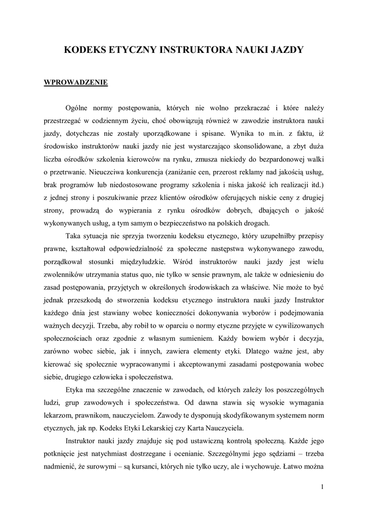 KODEKS ETYCZNY INSTRUKTORA NAUKI JAZDY WPROWADZENIE Ogólne normy postępowania, których nie wolno przekraczać i które należy przestrzegać w codziennym życiu, choć obowiązują również w zawodzie instruktora nauki jazdy, dotychczas nie zostały uporządkowane i spisane. Wynika to m.in. z faktu, iż środowisko instruktorów nauki jazdy nie jest wystarczająco skonsolidowane, a zbyt duża liczba ośrodków szkolenia kierowców na rynku, zmusza niekiedy do bezpardonowej walki o przetrwanie. Nieuczciwa konkurencja (zaniżanie cen, przerost reklamy nad jakością usług, brak programów lub niedostosowane programy szkolenia i niska jakość ich realizacji itd.) z jednej strony i poszukiwanie przez klientów ośrodków oferujących niskie ceny z drugiej strony, prowadzą do wypierania z rynku ośrodków dobrych, dbających o jakość wykonywanych usług, a tym samym o bezpieczeństwo na polskich drogach. Taka sytuacja nie sprzyja tworzeniu kodeksu etycznego, który uzupełniłby przepisy prawne, kształtował odpowiedzialność za społeczne następstwa wykonywanego zawodu, porządkował stosunki międzyludzkie. Wśród instruktorów nauki jazdy jest wielu zwolenników utrzymania status quo, nie tylko w sensie prawnym, ale także w odniesieniu do zasad postępowania, przyjętych w określonych środowiskach za właściwe. Nie może to być jednak przeszkodą do stworzenia kodeksu etycznego instruktora nauki jazdy Instruktor każdego dnia jest stawiany wobec konieczności dokonywania wyborów i podejmowania ważnych decyzji. Trzeba, aby robił to w oparciu o normy etyczne przyjęte w cywilizowanych społecznościach oraz zgodnie z własnym sumieniem. Każdy bowiem wybór i decyzja, zarówno wobec siebie, jak i innych, zawiera elementy etyki. Dlatego ważne jest, aby kierować się społecznie wypracowanymi i akceptowanymi zasadami postępowania wobec siebie, drugiego człowieka i społeczeństwa. Etyka ma szczególne znaczenie w zawodach, od których zależy los poszczególnych ludzi, grup zawodowych i społeczeństwa. Od dawna stawia się wysokie wymagania lekarzom, prawnikom, nauczycielom. Zawody te dysponują skodyfikowanym systemem norm etycznych, jak np. Kodeks Etyki Lekarskiej czy Karta Nauczyciela. Instruktor nauki jazdy znajduje się pod ustawiczną kontrolą społeczną. Każde jego potknięcie jest natychmiast dostrzegane i ocenianie. Szczególnymi jego sędziami – trzeba nadmienić, że surowymi – są kursanci, których nie tylko uczy, ale i wychowuje. Łatwo można 1 stracić ich szacunek i zaufanie, bardzo trudno jednak je odzyskać. A przecież rezultaty pracy instruktora w ogromnym stopniu zależą od jego autorytetu, który nie może być narzucony czy sztucznie wykreowany, ale powinien wynikać z jego kompetencji i postaw etycznych. Zasady zawarte w Kodeksie zostały sformułowane na poziomie dużego uogólnienia. Są to przemyślenia instruktorów nauki jazdy, jakie zrodziły się podczas szkoleń na certyfikat kompetencji personelu w latach 2002 – 2003, a następnie zostały skonsultowane z Polską Federacją Stowarzyszeń Szkół Kierowców oraz Radą Ośrodków Szkolenia Kierowców pod patronatem ITS. Kodeks zawiera 32 dyrektywy, czyli normy (zasady), których przestrzeganie ma służyć poprawie wizerunku instruktora nauki jazdy oraz pomagać w dokonywaniu bardziej trafnych wyborów etycznych. Kodeks składa się z 6 następujących części: I. II. Zasady ogólne. Powinności wobec kursantów. III. Powinności wobec własnej grupy zawodowej. IV. Powinności wobec społeczeństwa. V. Powinności reprezentantów instruktorów nauki jazdy. VI. Powinności właścicieli ośrodków szkolenia kierowców. 2 I. ZASADY OGÓLNE Instruktora nauki jazdy obowiązują ogólnie przyjęte zasady etyczne. Jest on odpowiedzialny za życie i zdrowie kursantów i innych uczestników ruchu, bezwzględne przestrzeganie przepisów prawa o ruchu drogowym, poszanowanie godności osobistej kursantów, dbałość o środowisko naturalne. Zasady zawarte w kodeksie etycznym instruktora nauki jazdy powinny obowiązywać go zarówno w działalności zawodowej, jak i w życiu prywatnym. Instruktor nauki jazdy: 1. Nie może żądać od kursantów ani współpracowników zachowania sprzecznego z ogólnie przyjętymi zasadami oraz zasadami określonymi w kodeksie etycznym instruktora nauki jazdy. 2. Powinien stale poszerzać i doskonalić swoją wiedzę i umiejętności. 3. Nie powinien podejmować się wykonywania czynności z zakresu praktyki zawodowej, które wykraczałyby poza jego wiedzę i kompetencje zawodowe. 4. Nie toleruje i przeciwdziała negatywnym zjawiskom (korupcja, zaniżanie cen, bylejakość usług itp.) występujących w szkoleniu kandydatów na kierowców. 5. Jest odpowiedzialny za rozwój ośrodka szkolenia kierowców, którego jest właścicielem lub w którym pracuje. Dba o wizerunek firmy. 6. Jest uczciwy i lojalny wobec pracodawcy i współpracowników. Nie prowadzi działalności konkurencyjnej. 7. Nie działa na szkodę innego instruktora nauki jazdy, ani ośrodka szkolenia kierowców. 8. Czynnie uczestniczy w działalności stowarzyszeń, organizacji itp., których celem jest nobilitacja zawodu, poprawa jakości szkolenia oraz bezpieczeństwa drogowego. II. POWINNOŚCI INSTRUKTORA NAUKI JAZDY WOBEC KURSANTÓW 1. Instruktor nauki jazdy w swojej pracy kieruje się przede wszystkim dobrem kursanta. 2. Podejście instruktora nauki jazdy do kursantów powinny charakteryzować następujące cechy: otwartość i umiejętność nawiązania kontaktu, kompetencje zawodowe, umiejętność indywidualnego podejścia do kursanta, 3 poszanowanie godności ludzkiej, równe traktowanie mężczyzn i kobiet, tolerancja, empatia, partnerstwo i podmiotowy stosunek do uczniów, życzliwość, dyscyplina, sprawiedliwa i obiektywna ocena pracy i postaw kursantów, kultura, przejawiająca się m.in.: kontrolowaniem własnych emocji, używaniem poprawnego języka polskiego, dbałością o