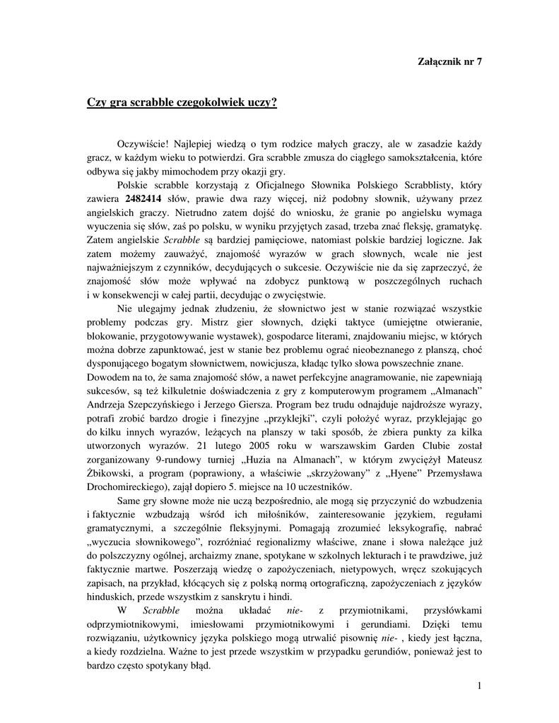 Załącznik nr 7 Czy gra scrabble czegokolwiek uczy? Oczywiście! Najlepiej wiedzą o tym rodzice małych graczy, ale w zasadzie każdy gracz, w każdym wieku to potwierdzi. Gra scrabble zmusza do ciągłego samokształcenia, które odbywa się jakby mimochodem przy okazji gry. Polskie scrabble korzystają z Oficjalnego Słownika Polskiego Scrabblisty, który zawiera 2482414 słów, prawie dwa razy więcej, niż podobny słownik, używany przez angielskich graczy. Nietrudno zatem dojść do wniosku, że granie po angielsku wymaga wyuczenia się słów, zaś po polsku, w wyniku przyjętych zasad, trzeba znać fleksję, gramatykę. Zatem angielskie Scrabble są bardziej pamięciowe, natomiast polskie bardziej logiczne. Jak zatem możemy zauważyć, znajomość wyrazów w grach słownych, wcale nie jest najważniejszym z czynników, decydujących o sukcesie. Oczywiście nie da się zaprzeczyć, że znajomość słów może wpływać na zdobycz punktową w poszczególnych ruchach i w konsekwencji w całej partii, decydując o zwycięstwie. Nie ulegajmy jednak złudzeniu, że słownictwo jest w stanie rozwiązać wszystkie problemy podczas gry. Mistrz gier słownych, dzięki taktyce (umiejętne otwieranie, blokowanie, przygotowywanie wystawek), gospodarce literami, znajdowaniu miejsc, w których można dobrze zapunktować, jest w stanie bez problemu ograć nieobeznanego z planszą, choć dysponującego bogatym słownictwem, nowicjusza, kładąc tylko słowa powszechnie znane. Dowodem na to, że sama znajomość słów, a nawet perfekcyjne anagramowanie, nie zapewniają sukcesów, są też kilkuletnie doświadczenia z gry z komputerowym programem „Almanach” Andrzeja Szepczyńskiego i Jerzego Giersza. Program bez trudu odnajduje najdroższe wyrazy, potrafi zrobić bardzo drogie i finezyjne „przyklejki”, czyli położyć wyraz, przyklejając go do kilku innych wyrazów, leżących na planszy w taki sposób, że zbiera punkty za kilka utworzonych wyrazów. 21 lutego 2005 roku w warszawskim Garden Clubie został zorganizowany 9-rundowy turniej „Huzia na Almanach”, w którym zwyciężył Mateusz Żbikowski, a program (poprawiony, a właściwie „skrzyżowany” z „Hyene” Przemysława Drochomireckiego), zajął dopiero 5. miejsce na 10 uczestników. Same gry słowne może nie uczą bezpośrednio, ale mogą się przyczynić do wzbudzenia i faktycznie wzbudzają wśród ich miłośników, zainteresowanie językiem, regułami gramatycznymi, a szczególnie fleksyjnymi. Pomagają zrozumieć leksykografię, nabrać „wyczucia słownikowego”, rozróżniać regionalizmy właściwe, znane i słowa należące już do polszczyzny ogólnej, archaizmy znane, spotykane w szkolnych lekturach i te prawdziwe, już faktycznie martwe. Poszerzają wiedzę o zapożyczeniach, nietypowych, wręcz szokujących zapisach, na przykład, kłócących się z polską normą ortograficzną, zapożyczeniach z języków hinduskich, przede wszystkim z sanskrytu i hindi. W Scrabble można układać niez przymiotnikami, przysłówkami odprzymiotnikowymi, imiesłowami przymiotnikowymi i gerundiami. Dzięki temu rozwiązaniu, użytkownicy języka polskiego mogą utrwalić pisownię nie- , kiedy jest łączna, a kiedy rozdzielna. Ważne to jest przede wszystkim w przypadku gerundiów, ponieważ jest to bardzo często spotykany błąd. 1 Warto jednak pamiętać, że w języku polskim występuje wiele homofonów (wyrazów, które brzmią identycznie, ale ich zapis jest różny). Wśród bardziej znanych można wymienić: chart/hart, morze/może, są także takie pary, gdzie tylko jeden z wyrazów jest powszechnie znany: duch/duh, puch/puh. Do homofonów możemy też zaliczyć pary: „zaprzeczony dopełniacz liczby mnogiej gerundium zakończonego w mianowniku na -ycie, -icie, -ucie” oraz „zaprzeczenie odpowiedniego bezokolicznika”, np.: nieżyć – nie żyć, niepić – nie pić, nieczuć – nie czuć. Gry słowne, w założeniu powinny też rozwijać wiedzę ogólną. I tak jest, gdyż znajomość znaczenia słów pomaga uniknąć strat w grze. Słowa są też zapamiętywane przez graczy wzrokowo („ktoś to mi kiedyś zagrał”, „widziałem na planszy”). Trudno ganić gracza za to, że w dążeniu do sukcesu – zwycięstwa, kładzie słowo, którego znaczenie nie jest mu dokładnie znane. Trudno też zaprzeczyć temu, że siłą rzeczy, cały czas podczas gry, ćwiczona jest pamięć wzrokowa i spostrzegawczość. Z drugiej strony, wielu graczy nie potrafi jednak uczyć się oderwanych ciągów liter, muszą znać znaczenie. W dobie powszechnego użycia kalkulatorów, nie bez znaczenia jest fakt, że w czasie gry ćwiczona jest umiejętność sumowania liczb (wymusza to obowiązek prowadzenia zapisu punktowego przez obu graczy). Wielu graczy rozpoczynających grę, w kilka, czy kilkanaście lat po zakończeniu szkolnej edukacji, stwierdza ze zdumieniem, że utraciło umiejętność liczenia w pamięci. Ponadto, konieczność prowadzenia zapisu wymusza przenoszenie uwagi z planszy i stojaka do zapisu. Można porównać to do wszechstronnych ćwiczeń gimnastycznych dla naszego mózgu. I to jest chyba największa zaleta spędzania czasu na grze scrabble. Korzyści ze sprawnego mózgu nie trzeba wymieniać, nie da się ich zmierzyć ani przecenić :) Zupełnie niedocenianym aspektem gry Scrabble, jest konieczność nabrania umiejętności godzenia się z porażką. Element losowy sprawia, że nawet prezentując najwyższy poziom gry, trzeba liczyć się z przegranymi. Można to zauważyć, przeglądając wyniki poszczególnych turniejów, gdzie nawet najlepsi zwykle nie mają kompletu zwycięstw na koncie, zdarzają się też spektakularne porażki i sukcesy. Jak wynika z badań pani Justyny Nurkiewicz (praca magisterska „Wpływ reaktywności emocjonalnej i aktywności na orientację motywacyjną u polskich Scrabblistów” Uniwersytet im. Kardynała Stefana Wyszyńskiego 2002), najlepsi scrabbliści ch