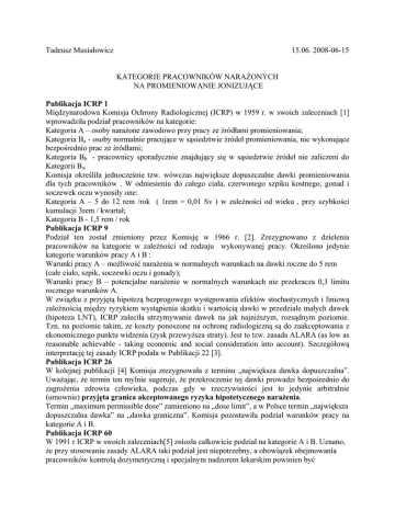 Tadeusz Musiałowicz 15.06. 2008-06-15 KATEGORIE PRACOWNIKÓW NARAŻONYCH NA PROMIENIOWANIE JONIZUJĄCE Publikacja ICRP 1 Międzynarodowa Komisja Ochrony Radiologicznej (ICRP) w 1959 r. w swoich zaleceniach [1] wprowadziła podział pracowników na kategorie: Kategoria A – osoby narażone zawodowo przy pracy ze źródłami promieniowania; Kategoria Ba - osoby normalnie pracujące w sąsiedztwie źródeł promieniowania, nie wykonujące bezpośrednio prac ze źródłami; Kategoria Bb - pracownicy sporadycznie znajdujący się w sąsiedztwie źródeł nie zaliczeni do Kategorii Ba. Komisja określiła jednocześnie tzw. wówczas największe dopuszczalne dawki promieniowania dla tych pracowników . W odniesieniu do całego ciała, czerwonego szpiku kostnego, gonad i soczewek oczu wynosiły one: Kategoria A – 5 do 12 rem /rok ( 1rem = 0,01 Sv ) w zależności od wieku , przy szybkości kumulacji 3rem / kwartał; Kategoria B - 1,5 rem / rok Publikacja ICRP 9 Podział ten został zmieniony przez Komisję w 1966 r. [2]. Zrezygnowano z dzielenia pracowników na kategorie w zależności od rodzaju wykonywanej pracy. Określono jedynie kategorie warunków pracy A i B : Warunki pracy A – możliwość narażenia w normalnych warunkach na dawki roczne do 5 rem (całe ciało, szpik, soczewki oczu i gonady); Warunki pracy B – potencjalne narażenie w normalnych warunkach nie przekracza 0,3 limitu rocznego warunków A. W związku z przyjętą hipotezą bezprogowego występowania efektów stochastycznych i liniową zależnością między ryzykiem wystąpienia skutku i wartością dawki w przedziale małych dawek (hipoteza LNT), ICRP zaleciła utrzymywanie dawek na jak najniższym, rozsądnym poziomie. Tzn. na poziomie takim, ze koszty ponoszone na ochronę radiologiczną są do zaakceptowania z ekonomicznego punktu widzenia (zysk przewyższa straty). Jest to tzw. zasada ALARA (as low as reasonable achievable - taking economic and social consideration into account). Szczegółową interpretację tej zasady ICRP podała w Publikacji 22 [3]. Publikacja ICRP 26 W kolejnej publikacji [4] Komisja zrezygnowała z terminu „największa dawka dopuszczalna”. Uważając, że termin ten mylnie sugeruje, że przekroczenie tej dawki prowadzi bezpośrednio do zagrożenia zdrowia człowieka, podczas gdy w rzeczywistości jest to jedynie arbitralnie (umownie) przyjęta granica akceptowanego ryzyka hipotetycznego narażenia. Termin „maximum permissible dose” zamieniono na „dose limit”, a w Polsce termin „największa dopuszczalna dawka” na „dawka graniczna”. Komisja pozostawiła podział warunków pracy na kategorie A i B. Publikacja ICRP 60 W 1991 r ICRP w swoich zaleceniach[5] zniosła całkowicie podział na kategorie A i B. Uznano, że przy stosowaniu zasady ALARA taki podział jest niepotrzebny, a obowiązek obejmowania pracowników kontrolą dozymetryczną i specjalnym nadzorem lekarskim powinien być wprowadzany na podstawie nie tylko teoretycznych rozważań narażenia ale także na podstawie różnych innych lokalnie rozpatrywanych aspektów. IAEA w 1996 r , konsekwentnie w ślad za ICRP zniosła także podział na kategorie A i B [6]. Wprowadzono jedynie obniżenie limitu średniej dawki rocznej dla praktykantów i studentów w wieku od 16 do 18 lat do mniej więcej 0,3 limitu przyjętego dla pracowników dorosłych. Dyrektywa 96/29 Rady Unii Europejskiej Zalecenia ICRP jako zalecenia największego na świecie autorytetu w sprawach ochrony radiologicznej były i są podstawą wszystkich przepisów międzynarodowych, także Dyrektyw Unii Europejskiej i Standardów Międzynarodowej Agencji Energii Atomowej ( IAEA ). Są one z reguły wprowadzane do tych przepisów bez zmian. Odstępstwo od tej reguły zrobił Euratom w Dyrektywie 96/29 [7], mimo zastrzeżeń wśród ekspertów opracowujących nowelizację (H.J.Dunster – informacja prywatna), podziału pracowników na kategorie nie zniesiono, przyjmując następujące definicje: Kategoria A – narażeni na promieniowanie pracownicy, którzy mogą otrzymać w ciągu roku dawkę efektywną powyżej 6 mSv lub równoważną powyżej 3/10 limitu dla soczewek oczu , skóry i kończyn podanych w art. 9(2) ( tzn. limitu dla pracowników ). Kategoria B - pracownicy narażeni na promieniowanie którzy nie zostali zakwalifikowani do kategorii A . Jednocześnie podano definicję, że narażony na promieniowanie pracownik to osoba, która w wyniku pracy zawodowej może być narażona na dawki powyżej limitu ustalonego dla osób z ludności. Taka definicja pozbawia pracowników, teoretycznie narażonych jedynie na dawki poniżej 1 mSv, obowiązkowego nadzoru dozymetrycznego, a więc obowiązku pracodawcy aby kontrolował czy pracownicy zostali prawidłowo zakwalifikowani. Aby zachować zgodność z powyższą Dyrektywa, Art. 17 ustawy Prawo Atomowe dzieli pracowników narażonych na promieniowanie w zależności od potencjalnego narażenia na kategorie A i B podając próg od kiedy zaczyna się kategoria B (praktyczne narażenie )– 1mSv/rok, znosząc tym samym obowiązek jakiegokolwiek nadzoru poniżej tego progu. To nie jest dobry przepis, ponieważ wyznaczanie potencjalnego narażenia jest w wielu przypadkach bardzo problematyczne, między innymi dla tego, że zależy ono nie tylko od warunków pracy ale także od indywidualnego sposobu jej wykonywania , a nadzór jest potrzebny również po to aby sprawdzać czy ludzie dobrze pracują i czy teoretyczne założenia sprawdzają się w praktyce . REFERENCJE 1. ICRP Publication 1 Pergamon Press Oxford 1959 2. ICRP Publication 9 Pergamon Press Oxford 1966 3. ICRP Publication 22 Pergamon Press Oxford 1973 4. ICRP Publication 26 Pergamon Press Oxford 1977 5. ICRP Publication 60 Pergamon Press Oxford 1991 6. IAEA Safety Series No 115 Vienna 1996 7. EU Council Directive 96/29 Euratom of 13 May 1996