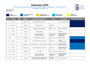 Kalendarz 2016 WYDARZEŃ ŻEGLARSKICH, REGAT KLAS WYCZYNOWYCH, MORSKICH I TURYSTYCZNYCH NA POMORZU W ROKU 2016 Data Aktualizacji: 28.12.2015r. Regaty Ogólnopolskie (Centralne) Regaty Międzynarodowe Regaty Pucharu Bałtyku Południowego Regaty Ogólnopolskie (Centralne) Regaty Ogólnopolskie (Centralne) Regaty Pucharu Zatoki Gdańskiej Cykl Regat Pucharu Wdzydz Regaty Ogólnopolskie (Centralne) Regaty Ogólnopolskie (Centralne) Regaty Ogólnopolskie (Centralne) Regaty Zatoki Gdańskiej Regaty Pucharu–Zatoki Regaty Pucharu Zatoki 1. Pucharu 27.12-03.01 Liangkawi MAS Gdańskiej Mistrzostwa Świata Juniorów ISAFGdańskiej Regaty Pucharuwww.youthworlds2015.org Zatoki Gdańskiej Regaty Pucharu Zatoki Gdańskiej Cykl Regat Pucharu Wdzydz Cykl Regat Pucharu Wdzydz Rok Miejsce Nazwa Regat / Wydarzenia Klasy Organizator Dodatkowe informacje Regaty Pucharu Bałtyku Południowego Regaty Pucharu Bałtyku Południowego 2015Regaty Pucharu Bałtyku Południowego Regaty Pucharu Bałtyku PołudniowegoRegaty Pucharu Bałtyku Południowego Lp. Rok 2016 Cykl Regat Pucharu Wdzydz Cykl Regat Pucharu Wdzydz 2. 29.12-03.01 Australia Mistrzostwa Świata 3. 02-03.01 Człuchów Biała Wstęga j. Rychnowskiego 16.01 Gdynia VII Gala Żeglarska 23-24.01 Osiek Regaty Lodowe Osiek I Edycja Pucharu Wójta Charzykowy Mistrzostwa Flotylli Północnej Austria Mistrzostwa Świata i Europy. kl. DN 4. 5. 2 6. 25.01 Cykl Regat Pucharu Wdzydz OPEN BIC DN-S, J, Jm, IO KS Vi-king, Człuchów UM, PoZŻ SNOW KITE, Open ICEBOARD UKS Kałębie, Andrzej Uzdowski, Maciej Dziemiańczuk Bojery – DN S, J, Jmł LKS Charzykowy Bojery kl. DN INDIYRA www.icesailing.org Bojery kl. DN kl. IOP Stowarzyszenie Flota Polska DN, Olsztyn Bojery kl. DN Stowarzyszenie Flota Polska DN, Olsztyn Bojery – DN S, J, Jmł LKS Charzykowy 7. 23-30.01 8. 5 30-31.01 Najlepszy lód Mistrzostwa Polski Jun. Mistrzostwa Polski kl. IO 9. 30-31.01 Najlepszy lód Mistrzostwa Polski Jun. Mł. Kl. DN 10. 06-07.02 Charzykowy Puchar LZS-u 11. 06-07.02 Osiek Regaty Lodowe Osiek II Edycja Pucharu Wójta SNOW KITE, Open ICEBOARD UKS Kałębie, Andrzej Uzdowski, Maciej Dziemiańczuk 12. 13-14.02 Człuchów Mistrzostwa Okręgu Pomorskiego I wyścig „Memoriał Henryka Kobierowskiego” DN OPEN S, J, Jmł ICE OPTI KS Vi-king, Człuchów 13. 13-14.02 Osiek Regaty Lodowe Osiek III Edycja Pucharu Wójta SNOW KITE, Open ICEBOARD UKS Kałębie, Andrzej Uzdowski, Maciej Dziemiańczuk 14. 15-19.02 Parnu Estonia Mistrzostwa Świata i Europy Jun. kl. DN Mistrzostwa Europy kl. IOP Bojery kl. DN kl. IOP INDIYRA www.icesailing.org 15. 6 26-28.02 Najlepszy lód Międzynarodowe Mistrzostwa Polski Bojery – kl DN Stowarzyszenie Flota Polska DN, Olsztyn 16. 1 20-21.02 1 Tolkmicko Regaty o Bursztynową Latarnię Zalewu Wiślanego DN J, S, Jmł, IO UKS Tolkmicko Gdańsk Dwór Artusa Rejs Roku 2015 Fundacja Gdańska Warszawa 29 Targi Wiatr i Woda Murator EXPO, PZŻ Regaty Zakończenia Sezonu 2014/2015 17. 1 2 04.03 18. 1 10-13.03 4 19. 12-13.03 Charzykowy 20. 16-17.04 Osiek Regaty Wiosenne Osiek Bojery – DN S, J, Jmł LKS Charzykowy UKS BIC RCB UKS Osiek, Zarząd Kl. AOC www.trofeoprincesasofia.or g Palma de Mallorca Hiszpania Princess Sofia Trophy 22. 1 23-24.04 7 Charzykowy Regaty Otwarcia Sezonu OPP A,B, Laser 4,7 LKS Charzykowy 23. 1 23-24.04 9 Charzykowy Memoriał Ottona Weilanda LAS, LAR, LAS 4,7, 420, Finn, ChKŻ Chojnice Kartuzy – Złota Góra Regaty Otwarcia Sezonu OPT-B, Omega UKS Lamelka Kartuzy Francja Hyeres Puchar Świata ISAF kl. AOC www.sailing.org, http://www.ffvoile.fr/ffv/web/ Puck Otwarte Regaty Małego Morza o Puchar Burmistrza Miasta Władysławowa kl. Puck PSKP, HOM Puck Puck Puchar Zatoki Puck Kamienica Królewska Regaty Otwarcia Sezonu 2016 Gdynia Klubowe Otwarcie Sezonu Puchar Komandora JKMW „Kotwica” 21. 1 25.03-02.04 5 24. 2 0 25.04 25. 2 25.04-01.05 1 26. 2 2 28.04 27. 2 29.04-01.05 3 28. 30.04 29. 2 30.04-01..05 4 OPT OPT, Vaurien, Turystyczna KS Zatoka Puck UKS Wiking Kamienica Królewska JKMW „KOTWICA”, OSŻ MW, Gdynia Centrum Targowo-Kongresowe MT Polska Puchar Świata ISAF Puchar Świata ISAF 30. 2 5 Charzykowy Regaty Otwarcia Sezonu Turystyczne ChKŻ Charzykowy 31. 2 01-02.05 6 Sopot Regaty Otwarcia Sezonu RS:X, FW, TECH, RCB SKŻ Ergo Hestia Sopot 32. 2 30.04-02.05 7 Gdynia XXXV Puchar Arki, El. ME.LAS4,7, LAR LAS, LAR, LAS 4.7 MKŻ Arka Gdynia Wdzydze XII Regaty im. Mariana Mokwy T-1, T-2, T-3 Omega, OPT Stowarzyszenie Przyjaciół Wdzydz 34. 2 30.04-01.05 9 Charzykowy Regaty Konstytucyjne OPT A.B, Laser 4,7, 420 ChKŻ Chojnice 35. 3 30.04-01.05 0 Sopot Sopot Catamaran Cup A, HC-16, F-18, open UKS Navigo Sopot Charzykowy Memoriał Ottona Weilanda OPT A, B, Open Bic ChKŻ Chojnice Osiek Puchar Morza Kociewskiego I Edycja UKS BIC RCB UKS Osiek, Zarząd Chałupy Ford Kite Cup edycja 1 KBR Polskie Stowarzyszenie Kiteboardingu Gdynia IV Regaty „Trójcup” Delphia 40 OSŻMW, Gdynia Gdynia Energa Sailing Cup, Puchar YKP Gdynia OPT A YKP Gdynia Gdańsk Górki Zachodnie Puchar Gdańska Kl. OPT COSA Krynica Morska Puchar PZŻ - cz. 1 kl. AOC PZŻ, Gdańsk XII Gdańskie Otwarcie Sezonu Żeglarskiego 2015 44. 4 21-22.05 0 Gdynia Puchar Polski Kl. 505 YK Stal Gdynia 45. 4 24-28.05 2 Holandia Medemblik Delta Lloyd Regatta kl. AOC www.deltalloydregatta.org Gdynia Otwarcie sezonu żeglarskiego 2015 na Pomorzu - Gdańsk Gdynia, Sopot, Żeglarski Puchar Trójmiasta Jachty morskie KWR, ORC, OPEN PoZŻ, MOSiR Gdańsk, MOSiR Sopot, GOSiR Gdynia Puchar PZŻ - cz. 2 RSX J,TEC, OKD, E, 420, 29er, CDT, l’EQ, LAR J,K,M, LAR M, LAS 4.7 PZŻ, MOSiR Puck 01.05 33. 2 8 02.05 36. 3 06-08.05 1 37. 07-08.05 38. 3 3 08-10.05 39. 3 07-08.05 4 40. 3 20-22.05 ? 7 41. 3 8 42. 20-22.05 43. 3 9 23.05 46. 4 4 29.05 47. 4 27-29. 05 5 48. 22-24.05 27-29.05 Krynica Morska EL. MŚ, ME, EUROSAF, ISAF, LAR K i M El. ME i MŚ las 4,7 II eliminacja do MŚ i E Puchar Polski kl. olimpijskich MOSiR Gdańsk PoZŻ Eliminacje: ME, OOM, PP 49. 28-29.05 Sopot Regaty Katamaranów „Trzy Mola