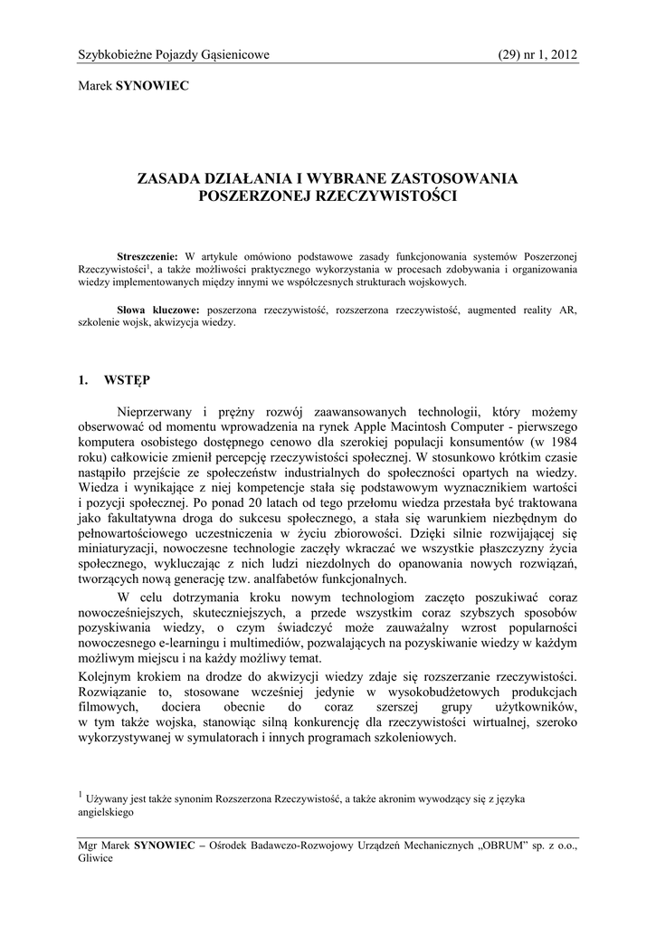 Szybkobieżne Pojazdy Gąsienicowe (29) nr 1, 2012 Marek SYNOWIEC ZASADA DZIAŁANIA I WYBRANE ZASTOSOWANIA POSZERZONEJ RZECZYWISTOŚCI Streszczenie: W artykule omówiono podstawowe zasady funkcjonowania systemów Poszerzonej Rzeczywistości1, a także możliwości praktycznego wykorzystania w procesach zdobywania i organizowania wiedzy implementowanych między innymi we współczesnych strukturach wojskowych. Słowa kluczowe: poszerzona rzeczywistość, rozszerzona rzeczywistość, augmented reality AR, szkolenie wojsk, akwizycja wiedzy. 1. WSTĘP Nieprzerwany i prężny rozwój zaawansowanych technologii, który możemy obserwować od momentu wprowadzenia na rynek Apple Macintosh Computer - pierwszego komputera osobistego dostępnego cenowo dla szerokiej populacji konsumentów (w 1984 roku) całkowicie zmienił percepcję rzeczywistości społecznej. W stosunkowo krótkim czasie nastąpiło przejście ze społeczeństw industrialnych do społeczności opartych na wiedzy. Wiedza i wynikające z niej kompetencje stała się podstawowym wyznacznikiem wartości i pozycji społecznej. Po ponad 20 latach od tego przełomu wiedza przestała być traktowana jako fakultatywna droga do sukcesu społecznego, a stała się warunkiem niezbędnym do pełnowartościowego uczestniczenia w życiu zbiorowości. Dzięki silnie rozwijającej się miniaturyzacji, nowoczesne technologie zaczęły wkraczać we wszystkie płaszczyzny życia społecznego, wykluczając z nich ludzi niezdolnych do opanowania nowych rozwiązań, tworzących nową generację tzw. analfabetów funkcjonalnych. W celu dotrzymania kroku nowym technologiom zaczęto poszukiwać coraz nowocześniejszych, skuteczniejszych, a przede wszystkim coraz szybszych sposobów pozyskiwania wiedzy, o czym świadczyć może zauważalny wzrost popularności nowoczesnego e-learningu i multimediów, pozwalających na pozyskiwanie wiedzy w każdym możliwym miejscu i na każdy możliwy temat. Kolejnym krokiem na drodze do akwizycji wiedzy zdaje się rozszerzanie rzeczywistości. Rozwiązanie to, stosowane wcześniej jedynie w wysokobudżetowych produkcjach filmowych, dociera obecnie do coraz szerszej grupy użytkowników, w tym także wojska, stanowiąc silną konkurencję dla rzeczywistości wirtualnej, szeroko wykorzystywanej w symulatorach i innych programach szkoleniowych. 1 Używany jest także synonim Rozszerzona Rzeczywistość, a także akronim wywodzący się z języka angielskiego Mgr Marek SYNOWIEC – Ośrodek Badawczo-Rozwojowy Urządzeń Mechanicznych „OBRUM” sp. z o.o., Gliwice Marek SYNOWIEC 2. CZYM JEST POSZERZONA RZECZYWISTOŚĆ? Poszerzona rzeczywistość (ang. Augmented Reality) jest stosunkowo młodym obszarem badań informatyki, który zajmuje się łączeniem, czy też nakładaniem na elementy świata rzeczywistego obiektów wirtualnych. Dzięki temu rozwiązaniu użytkownik uzyskuje możliwość rozszerzenia dostępnych zmysłowo elementów świata realnego o dodatkowe segmenty informacyjne, estetyczne, optymalizacyjne otrzymane przy wykorzystaniu technologii informatycznych. Rys. 1 przedstawia schemat kontinuum rzeczywistości. Wynika z niego, iż poza możliwością poszerzania obrazu świata rzeczywistego istnieje także możliwość podejścia odwrotnego, tzn. poszerzania obrazu świata wirtualnego o elementy świata rzeczywistego. Granica pomiędzy sferą Poszerzonych: Rzeczywistości i Wirtualności jest niezwykle płynna i zasadza się w znacznej mierze na stosunku ilości elementów wywodzących się ze świata realnego do tych, utworzonych za pośrednictwem metod informatycznych. W celu ukrócenia niejasności oraz ewentualnych sporów nomenklaturowych, przyjąłem definicję AR, nawiązującą do tekstu Ivana Sutherlanda pt. „The Ultimate Display” z 1965 roku stanowiącego podwaliny dla dalszego rozwoju Poszerzonej Rzeczywistości, a zaproponowaną przez R. Azumę [1], który twierdził, że warunkiem mówienia o poszerzonej rzeczywistości konieczne jest współistnienie trzech czynników: połączenia świata wirtualnego z realnym, interaktywności treści w czasie rzeczywistym, rejestracji w trzech wymiarach. Mieszana Rzeczywistość Środowisko rzeczywiste Poszerzona Rzeczywistość AR Poszerzona Wirtualność AV Środowisko wirtualne Rys. 1. Schemat ciągłości rzeczywistości (autorstwo: Milgram i Kishino, 1994 r.) Rzeczywistość może być rozszerzana o dodatkowe dane na wielu płaszczyznach. Podstawowym, a zarazem najgłębiej przebadanym i najlepiej do tej pory rozwiniętym wykorzystaniem tej technologii są aplikacje dedykowane oddziaływaniu na wzrok i słuch użytkownika (wiązało się to w głównej mierze z prostotą nakładania treści/plików graficznych i dźwiękowych na odpowiadające im obiekty świata realnego). Wraz z dalszymi badaniami nad możliwościami AR zaczęto wprowadzać „rozszerzenia” dla pozostałych zmysłów. Dzięki zastosowaniu odpowiednich czujników pojawiła się możliwość wykorzystania dotyku w interfejsie oprogramowania oraz przy manipulowaniu nakładanymi elementami wirtualnymi. Niedawno zostały zaproponowane rozwiązania przeznaczone dla dwóch pozostałych zmysłów: węchu i smaku. W pierwszym przypadku urządzenie po identyfikacji tekstury (ciasto, czekolada, owoce itp.) za pośrednictwem dozownika rozpyla odpowiednie aromaty (Rys.2a). Natomiast urządzenie TagCandy otwiera przed użytkownikiem paletę nowych doznań za pośrednictwem Zasada działania i wybrane zastosowania poszerzonej rzeczywistości „zwykłego” lizaka (rys. 2b). Ze względu jednak na brak (do tej pory) aplikacji wojskowych ukierunkowanych na smak i węch, rozwiązania te zostaną pominięte w dalszym opisie. a) projekt: Meta cookie [22], b) projekt: TagCandy [23] Rys. 2. Aplikacje AR Prace nad rzeczywistością poszerzoną zostały zapoczątkowane w latach sześćdziesiątych, jednakże pierwsze skuteczne i użytkowe wdrożenie w sferze cywilnej miało miejsce trzy dekady później, 
