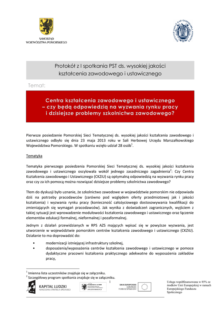 Protokół z I spotkania PST ds. wysokiej jakości kształcenia zawodowego i ustawicznego Temat: Pierwsze posiedzenie Pomorskiej Sieci Tematycznej ds. wysokiej jakości kształcenia zawodowego i ustawicznego odbyło się dnia 23 maja 2013 roku w Sali Herbowej Urzędu Marszałkowskiego Województwa Pomorskiego. W spotkaniu wzięło udział 28 osób1. Tematyka Tematyka pierwszego posiedzenia Pomorskiej Sieci Tematycznej ds. wysokiej jakości kształcenia zawodowego i ustawicznego oscylowała wokół jednego zasadniczego zagadnienia2: Czy Centra Kształcenia zawodowego i Ustawicznego (CKZiU) są optymalną odpowiedzią na wyzwania rynku pracy oraz czy za ich pomocą można rozwiązać dzisiejsze problemy szkolnictwa zawodowego? Tłem do dyskusji było uznanie, że szkolnictwo zawodowe w województwie pomorskim nie odpowiada dziś na potrzeby pracodawców (zarówno pod względem oferty przedmiotowej jak i jakości kształcenia) i wyzwania rynku pracy (konieczność całożyciowego dostosowywania kwalifikacji do zmieniających się wymagań pracodawców). Jak wynika z doświadczeń zagranicznych, wyjściem z takiej sytuacji jest wprowadzenie modułowości kształcenia zawodowego i ustawicznego oraz łączenie elementów edukacji formalnej, nieformalnej i pozaformalnej. Jednym z działań przewidzianych w RPS AZS mających wpisać się w powyższe wyzwania, jest utworzenie w województwie pomorskim centrów kształcenia zawodowego i ustawicznego (CKZiU). Działanie to ma doprowadzić do: • • 1 2 modernizacji istniejącej infrastruktury szkolnej, doposażenia/wyposażenia centrów kształcenia zawodowego i ustawicznego w pomoce dydaktyczne pracowni kształcenia praktycznego adekwatne do wyposażenia zakładów pracy, Imienna lista uczestników znajduje się w załączniku. Szczegółowy program spotkania znajduje się w załączniku. 1 Usługa współfinansowana w 85% ze środków Unii Europejskiej w ramach Europejskiego Funduszu Społecznego • • • uruchomienia kierunków kształcenia na poziomie ponadgimnazjalnym szkolnictwa zawodowego związanych z branżami o największym potencjale rozwoju regionu, wypracowania formuły uruchamiania oferty kształcenia ustawicznego odpowiadającej bieżącym potrzebom pracodawców, utworzenia ośrodków egzaminacyjnych umożliwiających w szczególności potwierdzanie efektów uczenia się w drodze formalnej i nieformalnej. Podczas spotkania zastanawiano się, jak skonstruować pomorskie kształcenie zawodowe i ustawiczne, aby było w pełni efektywnym elementem systemu edukacyjnego województwa pomorskiego. W trakcie pracy warsztatowej uczestnicy starali się znaleźć odpowiedzi na następujące pytania: CKZiU a aktualna oferta szkolnictwa zawodowego – czym się będą różniły? Jak będzie kształtowana oferta centrów, jak dobierani będą nauczyciele? Czy CKZiU będą centrami nowo zdefiniowanych kwalifikacji i kompetencji czy raczej kompilacją kilku dotychczasowych szkół zawodowych? Co należy jeszcze zweryfikować, aby rozwinąć model wzorcowy? Współpraca szkół z pracodawcami – jak mógłby wyglądać pomorski system praktycznej nauki zawodu? Propozycje rozwiązań/działań, identyfikacja barier i możliwe rozwiązania. Czy istnieją standardy profesjonalnego szkolenia pracowników przez firmy? Kodeks kultury współodpowiedzialności edukacyjnej pracodawców i szkół. Jakie powinny być rozwiązania umożliwiające potwierdzanie efektów uczenia się w drodze poza systemem szkolnym? Jak szkolnictwo zawodowe wpisać w system kształcenia całożyciowego? W jaki sposób szkolnictwo zawodowe może niwelować efekty procesów restrukturyzacji i modernizacji gospodarki na poziomie regionu? Porządek obrad • • • • • • Przywitanie uczestników spotkania przez moderatora dr Annę Hildebrandt – Instytut Badań nad Gospodarką Rynkową (IBnGR) Wystąpienie Wicemarszałka Województwa Pomorskiego Wiesława Byczkowskiego Wprowadzenie do panelu. Zaprezentowanie, celu, zadań oraz przebiegu spotkania moderator spotkania dr Anna Hildebrandt (IBnGR) Wystąpienie Dyrektora Wydziału Edukacji i Sportu Urzędu Marszałkowskiego Województwa Pomorskiego Adama Krawca prezentujące koncepcję Centrum Kształcenia Zawodowego i Ustawicznego (CKZiU) zgodną z założeniami Regionalnego Programu Strategicznego Wystąpienie Dyrektora Stowarzyszenia „Dolina Lotnicza” Andrzeja Rybki ukazujące doświadczenia Stowarzyszenia „Dolina Lotnicza” w zakresie współpracy ze szkołami zawodowymi w województwie podkarpackim Dyskusja po wystąpieniach 2 Usługa współfinansowana w 85% ze środków Unii Europejskiej w ramach Europejskiego Funduszu Społecznego • • • • • Wystąpienie Prezesa OptiNav sp. z o.o. Arkadiusza Śmigielskiego prezentujące oczekiwania wobec szkolnictwa zawodowego z perspektywy pracodawcy Dyskusja po wystąpieniu Praca warsztatowa Prezentacja wyników pracy w grupach Podsumowanie Przebieg wystąpień, komentarzy i dyskusji, poruszane zagadnienia Centra Kształcenia Zawodowego i Ustawicznego – czy będą odpowiedzią na wyzwania rynku pracy i dzisiejsze problemy szkolnictwa zawodowego? Jak ma wyglądać modelowy projekt centrum kształcenia zawodowego i ustawicznego według założeń Regionalnego Programu Strategicznego - jakim potrzebom ma odpowiadać i kto ma w tym uczestniczyć? Na to pytanie miał odpowiedzieć Dyrektor Departamentu Edukacji i Sportu Urzędu Marszałkowskiego Województwa Pomorskiego, Adam Krawiec. Dyrektor rozpoczął od stwierdzenia, że tak naprawdę chodzi o ideę wpływania na sieć kształcenia zawodowego w województwie. Za sieć kształcenia zawodowego odpowiadają powiaty. Samorząd województwa nie ma kompetencji, aby wpływać na kierunki kształcenia w poszczególnych szkołach. Idea centrów powstała jako odpowiedź na dylemat, czy pracować nad równomiernym dostrzeganiem każdej szkoły zawodowej (na tym polega obecnie realizowany projekt systemowy Departamentu Eduka