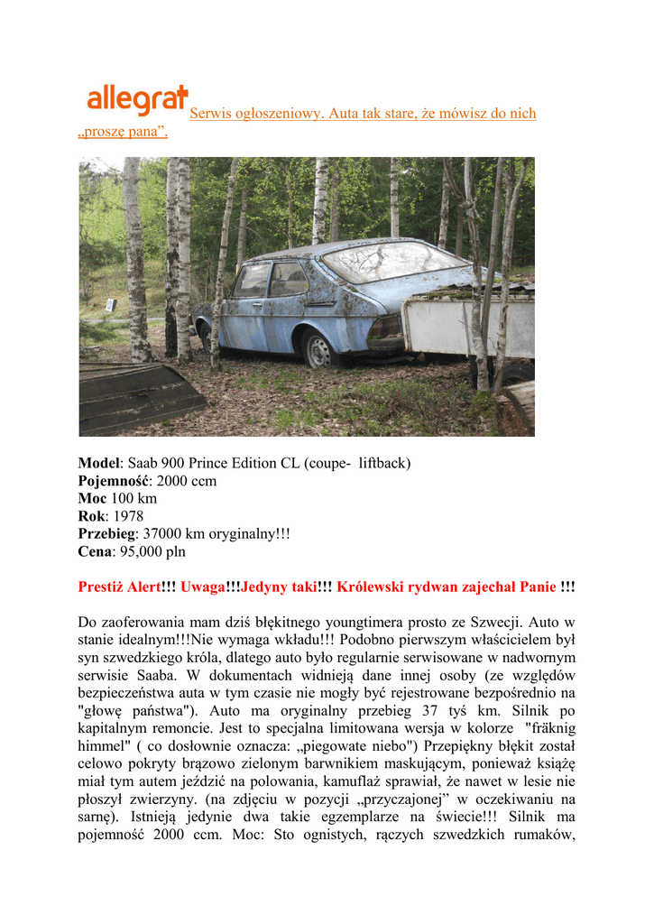 Serwis ogłoszeniowy. Auta tak stare, że mówisz do nich „proszę pana”. Model: Saab 900 Prince Edition CL (coupe- liftback) Pojemność: 2000 ccm Moc 100 km Rok: 1978 Przebieg: 37000 km oryginalny!!! Cena: 95,000 pln Prestiż Alert!!! Uwaga!!!Jedyny taki!!! Królewski rydwan zajechał Panie !!! Do zaoferowania mam dziś błękitnego youngtimera prosto ze Szwecji. Auto w stanie idealnym!!!Nie wymaga wkładu!!! Podobno pierwszym właścicielem był syn szwedzkiego króla, dlatego auto było regularnie serwisowane w nadwornym serwisie Saaba. W dokumentach widnieją dane innej osoby (ze względów bezpieczeństwa auta w tym czasie nie mogły być rejestrowane bezpośrednio na "głowę państwa"). Auto ma oryginalny przebieg 37 tyś km. Silnik po kapitalnym remoncie. Jest to specjalna limitowana wersja w kolorze "fräknig himmel" ( co dosłownie oznacza: „piegowate niebo") Przepiękny błękit został celowo pokryty brązowo zielonym barwnikiem maskującym, ponieważ książę miał tym autem jeździć na polowania, kamuflaż sprawiał, że nawet w lesie nie płoszył zwierzyny. (na zdjęciu w pozycji „przyczajonej” w oczekiwaniu na sarnę). Istnieją jedynie dwa takie egzemplarze na świecie!!! Silnik ma pojemność 2000 ccm. Moc: Sto ognistych, rączych szwedzkich rumaków, dostojnie mruczy spod zadziornej maski, niejednemu sztubakowi w błyszczącym Pasaciku przytarł nosa na światłach. Przy tym średnie spalanie na poziomie 6 litrów w cyklu mieszanym. Karoseria: dynamiczne, 3 drzwiowe, sportowe coupe, mocarne nadwozie zostało wykute z solidnej szwedzkiej stali, w samej kuźni Hefajstosa . Auto bardzo bezpieczne! Jest bezpieczniejsze od volvo, posiada łamaną kolumnę kierownicy ( w tym egzemplarzu jest celowo już nadłamana), a przy tym dostojne niczym królewska karoca. Na wyposażeniu: wspomaganie kierownicy, tzw. "cichy klakson" (aby nie wystraszyć zwierzyny), 4 biegowa, manualna skrzynia biegów, zapalniczka, manualnie opuszczane szyby, schowek, analogowo regulowana temperatura powietrza wewnątrz kabiny, system zrównoważonego ciśnienia w kabinie(szyby celowo nie domykają się do uszczelki, ma to na celu zoptymalizowanie cyrkulacji powietrza, patent szwedzki, dziś używany w nowoczesnych budynkach). Tapicerka w kolorze sino koperkowy beż jest zaprojektowana specjalnie do tego egzemplarza i nosi nazwę „atom älskare” (tłm. ”Atomowy amant”). Szczególnie podoba się płci pięknej, więc podjeżdżając takim klasykiem pod dyskotekę, możesz „rwać kumate rzodkieweczki” bez opamiętania. A jeśli już wyrwiesz watahę niewiast, bez problemu zmieścisz je do obszernego pięcioosobowego wnętrza. Bagażnik pomieści zarówno szafkę nocną z epoki Ludwika XIX jak i worek smacznych kartofli. Auto jest w 100 procentach oryginalne i jak wspomniałem niezaprzeczalnie unikatowe (dwa egzemplarze, drugi znajduje się podobno u kolekcjonera z Dubaju). Kupując to auto inwestujesz bez ryzyka, zaś ono z dnia na dzień będzie zyskiwać na wartości. Mało tego, oprócz pasywnego, codziennego zarobku (regularny wzrost wartości), auto może zarabiać na siebie!!Wesela, imprezy okolicznościowe, a nawet statystowanie w filmach, sprawiają, że auto nie dość, że praktycznie "samo się utrzymuje" to dodatkowo "dorzuca się" do rodzinnego budżetu. Auto zagrało już w filmie, w najbardziej oczekiwanej polskiej produkcji filmowej (Jestem Bogiem) gdzie zagrało mech na jednym katowickich z osieli. Na zdjęciu widoczna jest oryginalna przyczepka z 1978 dedykowana do tego modelu, kryta maskującym eternitem, która jest oryginalnym dodatkowym wyposażeniem do tego modelu (jest w stanie pomieścić zarówno dwie sarny i dzika, jak i zwyczajny kredens czy lodówkę). W przyczepce dorzucam całą masa części zamiennych (praktycznie można z nich zbudować drugie auto). W aucie nigdy nie było palone, przez 27 lat stało w garażu, ogrzewanym i wentylowanym, przykryte kocem. Po sprowadzeniu do Polski w 2007 roku prze dwa lata jeździła nim moja żona, starsza kobieta (rocznik 1938) tylko w słoneczne i suche dni, do kościoła (2 km od domu). Auto jest 4 samochodem w rodzinie. Sprzedaję z bólem serca. Auto oddam tylko w dobre ręce. Cena nie podlega negocjacji, za dodatkową, niewielką opłatą mogę dorzucić widoczną na zdjęciu łódkę (łódka również jest zabytkowa i pochodzi z 1966 roku (niestety dokumentacja zaginęła w morskich odmętach). W grę wchodzi zamiana na Passata B6, Octavię II, najchętniej kombi w dieslu, oczywiście z dopłatą z twojej strony. Na wszystkie pytania odpowiem na gg.