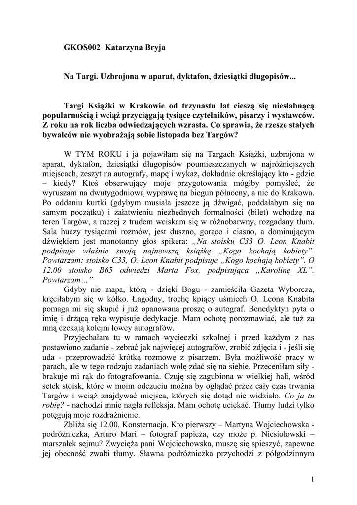 GKOS002 Katarzyna Bryja Na Targi. Uzbrojona w aparat, dyktafon, dziesiątki długopisów... Targi Książki w Krakowie od trzynastu lat cieszą się niesłabnącą popularnością i wciąż przyciągają tysiące czytelników, pisarzy i wystawców. Z roku na rok liczba odwiedzających wzrasta. Co sprawia, że rzesze stałych bywalców nie wyobrażają sobie listopada bez Targów? W TYM ROKU i ja pojawiłam się na Targach Książki, uzbrojona w aparat, dyktafon, dziesiątki długopisów poumieszczanych w najróżniejszych miejscach, zeszyt na autografy, mapę i wykaz, dokładnie określający kto - gdzie – kiedy? Ktoś obserwujący moje przygotowania mógłby pomyśleć, że wyruszam na dwutygodniową wyprawę na biegun północny, a nie do Krakowa. Po oddaniu kurtki (gdybym musiała jeszcze ją dźwigać, poddałabym się na samym początku) i załatwieniu niezbędnych formalności (bilet) wchodzę na teren Targów, a raczej z trudem wciskam się w różnobarwny, rozgadany tłum. Sala huczy tysiącami rozmów, jest duszno, gorąco i ciasno, a dominującym dźwiękiem jest monotonny głos spikera: „Na stoisku C33 O. Leon Knabit podpisuje właśnie swoją najnowszą książkę „Kogo kochają kobiety”. Powtarzam: stoisko C33, O. Leon Knabit podpisuje „Kogo kochają kobiety”. O 12.00 stoisko B65 odwiedzi Marta Fox, podpisująca „Karolinę XL”. Powtarzam…” Gdyby nie mapa, którą - dzięki Bogu - zamieściła Gazeta Wyborcza, kręciłabym się w kółko. Łagodny, trochę kpiący uśmiech O. Leona Knabita pomaga mi się skupić i już opanowana proszę o autograf. Benedyktyn pyta o imię i drżącą ręka wypisuje dedykacje. Mam ochotę porozmawiać, ale tuż za mną czekają kolejni łowcy autografów. Przyjechałam tu w ramach wycieczki szkolnej i przed każdym z nas postawiono zadanie - zebrać jak najwięcej autografów, zrobić zdjęcia i - jeśli się uda - przeprowadzić krótką rozmowę z pisarzem. Była możliwość pracy w parach, ale w tego rodzaju zadaniach wolę zdać się na siebie. Przeceniłam siły brakuje mi rąk do fotografowania. Czuję się zagubiona w wielkiej hali, wśród setek stoisk, które w moim odczuciu można by oglądać przez cały czas trwania Targów i wciąż znajdywać miejsca, których się dotąd nie widziało. Co ja tu robię? - nachodzi mnie nagła refleksja. Mam ochotę uciekać. Tłumy ludzi tylko potęgują moje rozdrażnienie. Zbliża się 12.00. Konsternacja. Kto pierwszy – Martyna Wojciechowska podróżniczka, Arturo Mari – fotograf papieża, czy może p. Niesiołowski – marszałek sejmu? Zwycięża pani Wojciechowska, muszę się spieszyć, zapewne jej obecność zwabi tłumy. Sławna podróżniczka przychodzi z półgodzinnym 1 wyprzedzeniem, dzięki czemu zdobywam autograf bez większych trudności. Nie tylko ja zauważam jej obecność, przed stoiskiem formuje się spory ogonek, więc znów nici z wywiadu. Ponownie zagłębiam się w wykaz. Marta Fox, godzina 12.30, stoisko B65. Nauczona doświadczeniem od razu biorę się do szukania stoiska. Czekam. Zjawia się pani Fox. Nie spieszy się, poprawia makijaż, przeczesuje krótkie, jasne włosy, rozkłada wachlarz. Słowem - miła, elegancka dama po czterdziestce. Z uśmiechem rozdaje autografy, pozuje do zdjęć. Zamaszyście podpisuje się w moim zeszycie, dedykuje czytelnikom książkę przyniesioną przeze mnie z biblioteki. Kiedy odchodzę, Martę Fox oblegają czytelnicy. Wracam na stoisko National Geographic, mam nadzieją, że tłumy zniknęły, że uda się zamienić choć parę słów z Martyna Wojciechowską, ale skąd! Kolejka jest o wiele większa niż za pierwszym razem. Kręcę się trochę tu i tam, oglądam przypadkowe książki. Jak się okazuje, i w ten sposób można trafić na coś ciekawego – na przykład nieco kontrowersyjna książeczka dla dzieci – o kupach. W środku dokładne opisy kup poszczególnych zwierząt (z rysunkami!). Na półce stoi kolejna chyba część serii – o robakach. Jak przyciągnięta jakąś nieznaną siłą wracam do Marty Fox. Wyraźnie sprzyja mi szczęście. Przy stoisku stoi już tylko niewielka grupka zainteresowanych, ale po chwili i oni odchodzą. Niepewnie zbliżam się do stoiska. Czy to na pewno dobry pomysł? – zastanawiam się. - Czy mogłabym przeprowadzić z Panią krótki wywiad? – pytam szybko, zanim zdążę się rozmyślić. - Oczywiście – Marta Fox wygląda na zdziwioną, ale nie daje tego po sobie poznać. Uśmiecha się, dodając mi odwagi. Siadamy przy stoliku. Uruchamiam dyktafon ( na szczęście przećwiczyłam to w domu ) i kolejno zadaję wcześniej przygotowane pytania. Ze zdenerwowania mówię szybko, nieuważnie słucham odpowiedzi, przerywam. Pisarka jest wyrozumiała. Potrafi mówić o sobie dużo i bez fałszywej skromności. Polubiłam ją. Po wyłączeniu dyktafonu swobodnie gawędzimy, przepraszam za przerywanie, tłumaczę, że to dopiero mój drugi wywiad. Rozmowę przerywa nam przyjście kolejnych czytelników. Żegnam się. Chętnie zostałabym dłużej, mam nadzieję, że kiedyś jeszcze ją spotkam. Jednego jestem pewna – czternaste Targi Książki nie odbędą się beze mnie. I to będzie „wejście smoka”. Bogatsza w doświadczenie nie odpuszczę żadnemu pisarzowi. 2