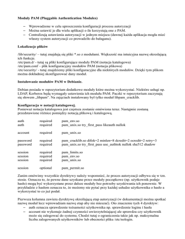 Moduły PAM (Pluggable Authentication Modules) – Wprowadzone w celu uproszczenia konfiguracji procesu autoryzacji – Można ustawić je dla wielu aplikacji o ile korzystają one z PAM. – Centralizują ustawienia autoryzacji w jednym miejscu (dawnej każda aplikacja mogła mieć własny system autoryzacji co prowadziło do bałaganu). Lokalizacje plików /lib/security/ – tutaj znajdują się pliki *.so z modułami. Większość ma intuicyjna nazwę okreslającą ich funkcje. /etc/pam.d/ - tutaj są pliki konfigurujące moduły PAM (notacja katalogowa) /etc/pam.conf – plik konfiguracyjny modułów PAM (notacja plikowa) /etc/security/ - tutaj znajdziemy pliki konfiguracyjne dla niektórych modułów. Dzięki tym plikom można dokładniej skonfigurować dany moduł. Instalowanie modułów PAM w Debianie. Debian posiada w repozytorium dodatkowe moduły które można wykorzystać. Niektóre usługi np. LDAP, Kerberos będą wymagały ustawienia ich modułu PAM. Paczki w repozytorium zaczynają się słowem „libpam”. Na zajęciach instalowany był tylko moduł libpam_cracklib. Konfiguracja w notacji katalogowej. Ponieważ notacja katalogowa jest częstsza zostanie omówiona teraz. Następnie zostaną przedstawione różnice pomiędzy notacją plikową i katalogową. auth auth required required pam_env.so pam_unix.so try_first_pass likeauth nullok account required pam_unix.so password password required required pam_cracklib.so difok=2 minlen=8 dcredit=2 ocredit=2 retry=3 pam_unix.so try_first_pass use_authtok nullok sha512 shadow session session session required required required pam_limits.so pam_env.so pam_unix.so session optional pam_permit.so Zanim omówimy wszystkie dyrektywy należy wspomnieć, że proces autoryzacji odbywa się w tzn. stosie. Oznacza to, że pewne dane uzyskane przez moduły początkowe (np. użytkownik podaje hasło) mogą być wykorzystane przez dalsze moduły bez potrzeby uzyskiwania ich ponownie. W przykładzie z hasłem oznacza to, że możemy nie pytać przy każdej usłudze użytkownika o hasło a wykorzystać to co już podał. Pierwsza kolumna zawiera dyrektywę określającą etap autoryzacji (w dokumentacji można spotkać nazwę moduł lecz wprowadzam nazwę etap aby nie mieszać). Oto znaczenie tych 4 dyrektyw: – auth oznacza sprawdzenie tożsamości użytkownika np. sprawdzenie loginu i hasła – account nie wykonuje żadnej czynności uwierzytelniającej ale sprawdza czy użytkownik może się zalogować do systemu. Chodzi tutaj o ograniczenia takie jak np. maksymalna liczba zalogowanych użytkowników lub obecności pliku /etc/nologin. – Password jest odpowiedzialny za stworzenie „tokena” dla użytkownika który jest właśnie logowany. Token tez zwiera informacje o użytkowniku np. UID i GID. – session odpowiada za czynności i ustawienia które trzeba wykonać zanim użytkownik otrzyma dostęp do powłoki. Druga kolumna określa „priorytet” modułu. Można znaleźć tutaj 4 podstawowe dyrektywy: – required określa, że jeżeli ten moduł zwróci błąd to cały proces autoryzacji zwróci błąd niepowodzenia. – requisite określa podobnie jak required, że nie powodzenie tego modułu sprawia, że cały proces zwraca błąd ale w odróżnieniu od required jego nie powodzenie przerywa od razu dalszą autoryację. Zatem w przypadku required błąd zostanie zwrócony dopiero po zakończeniu przetwarzania wszystkich modułów. – sufficient mówi, że powodzenie tego modułu wystarcza aby przerwać proces i zwrócić kod sukcesu. Natomiast jeżeli moduł required który jest przed nim zwróci błąd to sukces tego modułu jest ignorowany. – optional określa, że powodzenie lub niepowodzenie tego modułu są beż znaczenia. Zostały jezcze 2 dyrektywy do omówienia: – include powoduje dołączenie zawartości wskazanego pliku do stosu modułów. – Substack podobnie jak include dołącza plik ale jego zawartość jest traktowana jako pod stos. Istnieje możliwość definiowania własnego priorytetu. W tym celu w drugiej kolumnie wpisujemy w nawiasu kwadratowe wartości kluczy i przypisywane im wartości według formatu: [kluczN=akcja1,kluczM=akcja2,...] Oto lista kluczy: success, open_err, symbol_err, service_err, system_err, buf_err, perm_denied, auth_err, cred_insufficient, authinfo_unavail, user_unknown, maxtries, new_authtok_reqd, acct_expired, session_err, cred_unavail, cred_expired, cred_err, no_module_data, conv_err, authtok_err, authtok_recover_err, authtok_lock_busy, authtok_disable_aging, try_again, ignore, abort, authtok_expired, module_unknown, bad_item, conv_again, incomplete, default. Akcja określa jedno z następujących słów kluczowych: ignore, bad, die, ok, done, reset Nazwy są intuicyjne ale wyjaśnienia wymaga tylko dyrektywa reset. Powoduje ona skasowane danych które zostały odłożone na aktualnym stosie PAM (np. wcześniej pobrane hasła). Jednak jeżeli jesteśmy w pod stosie to ta akcja skasuje tylko dane z tego pod stosu. Trzecia kolumna określa właściwy moduł wraz z parametrami: pam_unix.so try_first_pass likeauth nullok pam_unix.so jest nazwą modułu a reszta linijki to jego parametry. Jeżeli ilość parametrów jest zbyt długa można zastosować załamanie wiersza więc linijka: password required pam_cracklib.so difok=2 minlen=8 dcredit=2 ocredit=2 retry=3 będzie zinterpretowana tak samo jak: password required pam_cracklib.so difok=2 minlen=8 \ dcredit=2 ocredit=2 retry=3 Jeżeli pominięto by znak „\” wówczas w pliku z tą konfiguracją byłby błąd. Należy uważać na błędy ponieważ mogą one zablokować nam dostęp do systemu! Notacja plikowa Różnica pomiędzy notacją plikową a katalogową polega na tym, że w notacji plikowej wszystkie wpisy umieszczone są w pliku /etc/pam.conf. Dodatkowo w celu określenia do której aplikacji dotyczy wpis należy umieścić nazwę aplikacji przed nazwą etapu. Przykład: login auth requisite pam_nologin Wpis ten dotyczy aplik