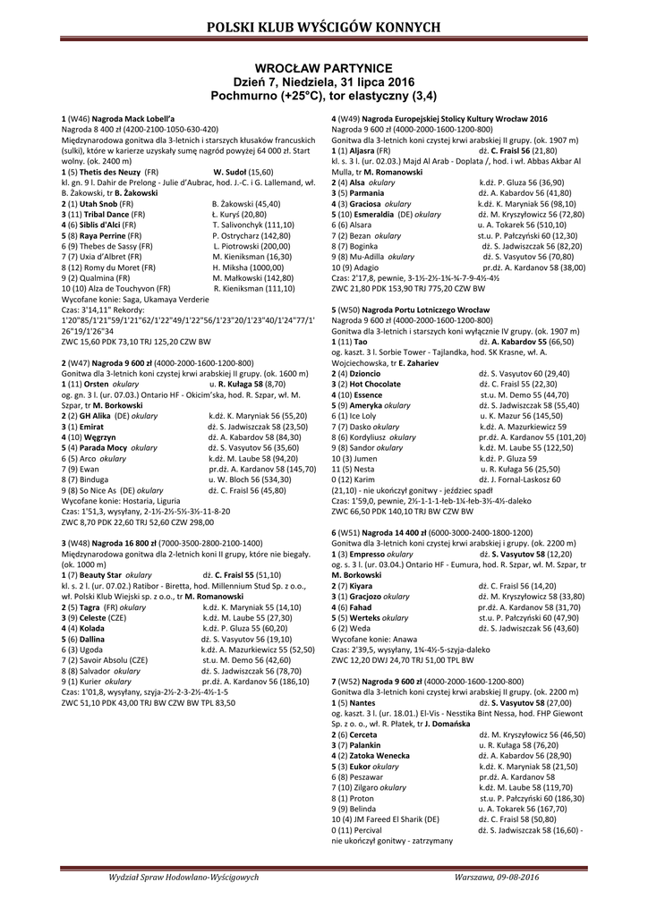 POLSKI KLUB WYŚCIGÓW KONNYCH WROCŁAW PARTYNICE Dzień 7, Niedziela, 31 lipca 2016 Pochmurno (+25°C), tor elastyczny (3,4) 1 (W46) Nagroda Mack Lobell’a Nagroda 8 400 zł (4200-2100-1050-630-420) Międzynarodowa gonitwa dla 3-letnich i starszych kłusaków francuskich (sulki), które w karierze uzyskały sumę nagród powyżej 64 000 zł. Start wolny. (ok. 2400 m) 1 (5) Thetis des Neuzy (FR) W. Sudoł (15,60) kl. gn. 9 l. Dahir de Prelong - Julie d’Aubrac, hod. J.-C. i G. Lallemand, wł. B. Żakowski, tr B. Żakowski 2 (1) Utah Snob (FR) B. Żakowski (45,40) 3 (11) Tribal Dance (FR) Ł. Kuryś (20,80) 4 (6) Siblis d'Alci (FR) T. Salivonchyk (111,10) 5 (8) Raya Perrine (FR) P. Ostrycharz (142,80) 6 (9) Thebes de Sassy (FR) L. Piotrowski (200,00) 7 (7) Uxia d’Albret (FR) M. Kieniksman (16,30) 8 (12) Romy du Moret (FR) H. Miksha (1000,00) 9 (2) Qualmina (FR) M. Małkowski (142,80) 10 (10) Alza de Touchyvon (FR) R. Kieniksman (111,10) Wycofane konie: Saga, Ukamaya Verderie Czas: 3'14,11" Rekordy: 1'20"85/1'21"59/1'21"62/1'22"49/1'22"56/1'23"20/1'23"40/1'24"77/1' 26"19/1'26"34 ZWC 15,60 PDK 73,10 TRJ 125,20 CZW BW 2 (W47) Nagroda 9 600 zł (4000-2000-1600-1200-800) Gonitwa dla 3-letnich koni czystej krwi arabskiej II grupy. (ok. 1600 m) 1 (11) Orsten okulary u. R. Kułaga 58 (8,70) og. gn. 3 l. (ur. 07.03.) Ontario HF - Okicim’ska, hod. R. Szpar, wł. M. Szpar, tr M. Borkowski 2 (2) GH Alika (DE) okulary k.dż. K. Maryniak 56 (55,20) 3 (1) Emirat dż. S. Jadwiszczak 58 (23,50) 4 (10) Węgrzyn dż. A. Kabardov 58 (84,30) 5 (4) Parada Mocy okulary dż. S. Vasyutov 56 (35,60) 6 (5) Arco okulary k.dż. M. Laube 58 (94,20) 7 (9) Ewan pr.dż. A. Kardanov 58 (145,70) 8 (7) Binduga u. W. Bloch 56 (534,30) 9 (8) So Nice As (DE) okulary dż. C. Fraisl 56 (45,80) Wycofane konie: Hostaria, Liguria Czas: 1'51,3, wysyłany, 2-1½-2½-5½-3½-11-8-20 ZWC 8,70 PDK 22,60 TRJ 52,60 CZW 298,00 3 (W48) Nagroda 16 800 zł (7000-3500-2800-2100-1400) Międzynarodowa gonitwa dla 2-letnich koni II grupy, które nie biegały. (ok. 1000 m) 1 (7) Beauty Star okulary dż. C. Fraisl 55 (51,10) kl. s. 2 l. (ur. 07.02.) Ratibor - Biretta, hod. Millennium Stud Sp. z o.o., wł. Polski Klub Wiejski sp. z o.o., tr M. Romanowski 2 (5) Tagra (FR) okulary k.dż. K. Maryniak 55 (14,10) 3 (9) Celeste (CZE) k.dż. M. Laube 55 (27,30) 4 (4) Kolada k.dż. P. Gluza 55 (60,20) 5 (6) Dallina dż. S. Vasyutov 56 (19,10) 6 (3) Ugoda k.dż. A. Mazurkiewicz 55 (52,50) 7 (2) Savoir Absolu (CZE) st.u. M. Demo 56 (42,60) 8 (8) Salvador okulary dż. S. Jadwiszczak 56 (78,70) 9 (1) Kurier okulary pr.dż. A. Kardanov 56 (186,10) Czas: 1'01,8, wysyłany, szyja-2½-2-3-2½-4½-1-5 ZWC 51,10 PDK 43,00 TRJ BW CZW BW TPL 83,50 Wydział Spraw Hodowlano-Wyścigowych 4 (W49) Nagroda Europejskiej Stolicy Kultury Wrocław 2016 Nagroda 9 600 zł (4000-2000-1600-1200-800) Gonitwa dla 3-letnich koni czystej krwi arabskiej II grupy. (ok. 1907 m) 1 (1) Aljasra (FR) dż. C. Fraisl 56 (21,80) kl. s. 3 l. (ur. 02.03.) Majd Al Arab - Doplata /, hod. i wł. Abbas Akbar Al Mulla, tr M. Romanowski 2 (4) Alsa okulary k.dż. P. Gluza 56 (36,90) 3 (5) Parmania dż. A. Kabardov 56 (41,80) 4 (3) Graciosa okulary k.dż. K. Maryniak 56 (98,10) 5 (10) Esmeraldia (DE) okulary dż. M. Kryszyłowicz 56 (72,80) 6 (6) Alsara u. A. Tokarek 56 (510,10) 7 (2) Bezan okulary st.u. P. Pałczyński 60 (12,30) 8 (7) Boginka dż. S. Jadwiszczak 56 (82,20) 9 (8) Mu-Adilla okulary dż. S. Vasyutov 56 (70,80) 10 (9) Adagio pr.dż. A. Kardanov 58 (38,00) Czas: 2'17,8, pewnie, 3-1½-2½-1¾-¾-7-9-4½-4½ ZWC 21,80 PDK 153,90 TRJ 775,20 CZW BW 5 (W50) Nagroda Portu Lotniczego Wrocław Nagroda 9 600 zł (4000-2000-1600-1200-800) Gonitwa dla 3-letnich i starszych koni wyłącznie IV grupy. (ok. 1907 m) 1 (11) Tao dż. A. Kabardov 55 (66,50) og. kaszt. 3 l. Sorbie Tower - Tajlandka, hod. SK Krasne, wł. A. Wojciechowska, tr E. Zahariev 2 (4) Dzioncio dż. S. Vasyutov 60 (29,40) 3 (2) Hot Chocolate dż. C. Fraisl 55 (22,30) 4 (10) Essence st.u. M. Demo 55 (44,70) 5 (9) Ameryka okulary dż. S. Jadwiszczak 58 (55,40) 6 (1) Ice Loly u. K. Mazur 56 (145,50) 7 (7) Dasko okulary k.dż. A. Mazurkiewicz 59 8 (6) Kordyliusz okulary pr.dż. A. Kardanov 55 (101,20) 9 (8) Sandor okulary k.dż. M. Laube 55 (122,50) 10 (3) Jumen k.dż. P. Gluza 59 11 (5) Nesta u. R. Kułaga 56 (25,50) 0 (12) Karim dż. J. Fornal-Laskosz 60 (21,10) - nie ukończył gonitwy - jeździec spadł Czas: 1'59,0, pewnie, 2½-1-1-1-łeb-1¼-łeb-3½-4½-daleko ZWC 66,50 PDK 140,10 TRJ BW CZW BW 6 (W51) Nagroda 14 400 zł (6000-3000-2400-1800-1200) Gonitwa dla 3-letnich koni czystej krwi arabskiej i grupy. (ok. 2200 m) 1 (3) Empresso okulary dż. S. Vasyutov 58 (12,20) og. s. 3 l. (ur. 03.04.) Ontario HF - Eumura, hod. R. Szpar, wł. M. Szpar, tr M. Borkowski 2 (7) Kiyara dż. C. Fraisl 56 (14,20) 3 (1) Gracjozo okulary dż. M. Kryszyłowicz 58 (33,80) 4 (6) Fahad pr.dż. A. Kardanov 58 (31,70) 5 (5) Werteks okulary st.u. P. Pałczyński 60 (47,90) 6 (2) Weda dż. S. Jadwiszczak 56 (43,60) Wycofane konie: Anawa Czas: 2'39,5, wysyłany, 1¾-4½-5-szyja-daleko ZWC 12,20 DWJ 24,70 TRJ 51,00 TPL BW 7 (W52) Nagroda 9 600 zł (4000-2000-1600-1200-800) Gonitwa dla 3-letnich koni czystej krwi arabskiej II grupy. (ok. 2200 m) 1 (5) Nantes dż. S. Vasyutov 58 (27,00) og. kaszt. 3 l. (ur. 18.01.) El-Vis - Nesstika Bint Nessa, hod. FHP Giewont Sp. z o. o., wł. R. Płatek, tr J. Domańska 2 (6) Cerceta dż. M. Kryszyłowicz 56 (46,50) 3 (7) Palankin u. R. Kułaga 58 (76,20) 4 (2) Zatoka Wenecka dż. A. Kabardov 56 (28,90) 5 (3) Eukor okulary k.dż. K. Maryniak 58 (21,50) 6 (8) Peszawar pr.dż. A. Kardanov 58 7 (10) Zilgaro okulary k.dż. M. Laube 58 (119,70) 8 (1) Proton st.u. P. Pałczyński 60 (186,30) 9 (9) Belinda u. A. Tokarek 56 (167,70) 10 (4) JM Fareed El Sharik (DE) dż. C. Fraisl 58 (50,80) 0 (11) Percival dż. S. Jadwiszczak 58 (16,60) nie ukończył gonitwy - zatrzymany Warszawa, 09-08-2016 POLSKI KLUB WYŚCIGÓW KONNYCH Czas: 2'4
