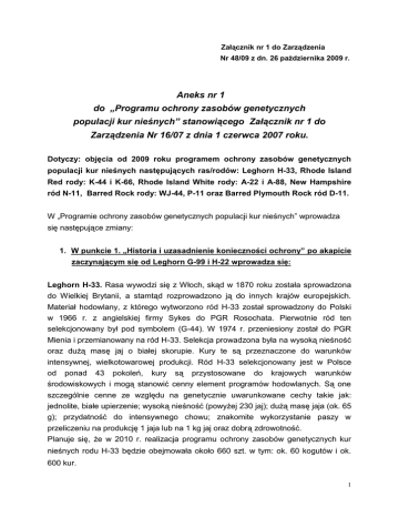 Załącznik nr 1 do Zarządzenia Nr 48/09 z dn. 26 października 2009 r. Aneks nr 1 do „Programu ochrony zasobów genetycznych populacji kur nieśnych” stanowiącego Załącznik nr 1 do Zarządzenia Nr 16/07 z dnia 1 czerwca 2007 roku. Dotyczy: objęcia od 2009 roku programem ochrony zasobów genetycznych populacji kur nieśnych następujących ras/rodów: Leghorn H-33, Rhode Island Red rody: K-44 i K-66, Rhode Island White rody: A-22 i A-88, New Hampshire ród N-11, Barred Rock rody: WJ-44, P-11 oraz Barred Plymouth Rock ród D-11. W „Programie ochrony zasobów genetycznych populacji kur nieśnych” wprowadza się następujące zmiany: 1. W punkcie 1. „Historia i uzasadnienie konieczności ochrony” po akapicie zaczynającym się od Leghorn G-99 i H-22 wprowadza się: Leghorn H-33. Rasa wywodzi się z Włoch, skąd w 1870 roku została sprowadzona do Wielkiej Brytanii, a stamtąd rozprowadzono ją do innych krajów europejskich. Materiał hodowlany, z którego wytworzono ród H-33 został sprowadzony do Polski w 1966 r. z angielskiej firmy Sykes do PGR Rosochata. Pierwotnie ród ten selekcjonowany był pod symbolem (G-44). W 1974 r. przeniesiony został do PGR Mienia i przemianowany na ród H-33. Selekcja prowadzona była na wysoką nieśność oraz dużą masę jaj o białej skorupie. Kury te są przeznaczone do warunków intensywnej, wielkotowarowej produkcji. Ród H-33 selekcjonowany jest w Polsce od ponad 43 pokoleń, kury są przystosowane do krajowych warunków środowiskowych i mogą stanowić cenny element programów hodowlanych. Są one szczególnie cenne ze względu na genetycznie uwarunkowane cechy takie jak: jednolite, białe upierzenie; wysoką nieśność (powyżej 230 jaj); dużą masę jaja (ok. 65 g); przydatność do intensywnego chowu; znakomite wykorzystanie paszy w przeliczeniu na produkcję 1 jaja lub na 1 kg jaj oraz dobrą zdrowotność. Planuje się, że w 2010 r. realizacja programu ochrony zasobów genetycznych kur nieśnych rodu H-33 będzie obejmowała około 660 szt. w tym: ok. 60 kogutów i ok. 600 kur. 1 Rhode Island Red rody: K-44 i K-66 oraz Rhode Island White rody: A-22 i A-88. Rasa ta powstała w drugiej połowie XIX wieku w stanie Rhode Island w USA. W wyniku krzyżowania różnych ras niosek z azjatyckimi ptakami, takimi jak kochiny i bojowniki malajskie oraz prowadzenia selekcji w kierunku wyższej nieśności, wytworzono stosunkowo jednolitą rasę. Dopiero w 1904 roku ustalono właściwe dla tej rasy cechy wyglądu, przy czym początkowo uznawano za zgodne z wzorcem rasowym jedynie ptaki o upierzeniu brązowym z pojedynczym grzebieniem. Dwa lata później dołączyły do nich również ptaki o białym upierzeniu oraz posiadające grzebień różyczkowy. Do Polski wszystkie ww. rody sprowadzono z Francji w połowie lat osiemdziesiątych XX wieku. Ptaki te umieszczono na fermie w Zakładzie Selekcji Drobiu w Brodziszewie, a następnie przeniesiono do Zarodowej Fermy Kur Nieśnych w Dusznikach, należącej do Centralnego Ośrodka Badawczo- Rozwojowego w Poznaniu z siedzibą w Zakrzewie (COBRD). Ptaki uznane zostały jako rody zarodowe 1989 r. Rody te wykorzystywano w programie krzyżowania towarowego w celu uzyskania zestawów rodzicielskich do produkcji komercyjnych mieszańców kur nieśnych, charakteryzujących się wysoką produkcyjnością w intensywnym chowie klatkowym i na ściółce, o handlowej nazwie Astra: S, N, D, P, W-1 i W-2. W wyniku konkurencji materiału hodowlanego sprowadzanego do Polski z zagranicy, po 2005 roku zanotowano spadek sprzedaży mieszańców towarowych pochodzących po tych rodach i w 2009 roku podjęto decyzję o likwidacji Zarodowej Fermy Kur Nieśnych w Dusznikach, co stworzyło realne zagrożenie wyginięcia także ww. rodów. Na wniosek Instytutu Zootechniki PIB, ww. rody przeniesiono do Zakładu Doświadczalnego IZ PIB Rossocha (woj. łódzkie) i jednocześnie wystąpiono do Ministerstwa Rolnictwa i Rozwoju Wsi o objęcie ich programem ochrony zasobów genetycznych zwierząt. Utrzymywanie przez wiele pokoleń populacji tych kur w odrębnych stadach spowodowało, że odznaczają się one odmienną strukturą genetyczną i pochodzeniem w porównaniu do innych rodów Rhode Island. W krzyżowaniu z innymi rasami i rodami wykazują wysoki stopień heterozji, a w porównaniu z innymi rodami Rhode Island charakteryzują się wyższą produkcyjnością. Planuje się, że w 2010 r. realizacja programu ochrony zasobów genetycznych kur nieśnych Rhode Island Red rody: K-44 i K-66 oraz Rhode Island White rody: A-22 i A-88 będzie obejmowała po ok. 660 szt. w tym: ok. 60 kogutów i ok. 600 kur. New Hampshire N-11. Rasa ta powstała na początku XX wieku w stanie New Hamshire w USA. Materiał wyjściowy do jej wytworzenia stanowiły kury Rhode Island. W Stanach Zjednoczonych ptaki te stały się niezwykle popularne ze względu 2 na swą wszechstronną użytkowość tj. wykorzystanie nieśne i mięsne. Zainteresowanie tą rasą dotarło do Europy dopiero pod koniec lat czterdziestych. W Polsce prace selekcyjne nad rodem N-11, sprowadzonym z Austrii z firmy Landesman rozpoczęto w 1962 r. Początkowo kury N-11 utrzymywano w Państwowym Gospodarstwie Rolnym Kowalskie, a następnie przeniesiono go do Zakładu Selekcji Drobiu w Brodziszewie, skąd sprowadzono je na fermę w Dusznikach. Ród ten wykorzystywano w programie krzyżowania towarowego w celu uzyskania zestawów rodzicielskich do produkcji komercyjnych mieszańców kur nieśnych o handlowej nazwie Astra: N, D i Eksperymentalna, charakteryzujących się dobrą produkcyjnością. Ze względu na stosunkowo wysoką masę ciała w intensywnym chowie preferowane były do utrzymania na ściółce. Po 2000 roku coraz większa ilość kur, wytwarzanych na bazie rodów wyjściowych New Hempshire i Barred Rock, ze względu na dużą masę ciała i kolorowe upierzenie nabywana była do chowu ekstensywnego, szczególnie w małych stadkach w chowie przyzagrodowym. Ten typ p