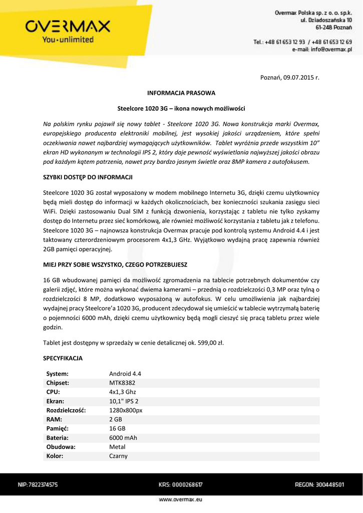Poznań, 09.07.2015 r. INFORMACJA PRASOWA Steelcore 1020 3G – ikona nowych możliwości Na polskim rynku pojawił się nowy tablet - Steelcore 1020 3G. Nowa konstrukcja marki Overmax, europejskiego producenta elektroniki mobilnej, jest wysokiej jakości urządzeniem, które spełni oczekiwania nawet najbardziej wymagających użytkowników. Tablet wyróżnia przede wszystkim 10” ekran HD wykonanym w technologii IPS 2, który daje pewność wyświetlania najwyższej jakości obrazu pod każdym kątem patrzenia, nawet przy bardzo jasnym świetle oraz 8MP kamera z autofokusem. SZYBKI DOSTĘP DO INFORMACJI Steelcore 1020 3G został wyposażony w modem mobilnego Internetu 3G, dzięki czemu użytkownicy będą mieli dostęp do informacji w każdych okolicznościach, bez konieczności szukania zasięgu sieci WiFi. Dzięki zastosowaniu Dual SIM z funkcją dzwonienia, korzystając z tabletu nie tylko zyskamy dostęp do Internetu przez sieć komórkową, ale również możliwość korzystania z tabletu jak z telefonu. Steelcore 1020 3G – najnowsza konstrukcja Overmax pracuje pod kontrolą systemu Android 4.4 i jest taktowany czterordzeniowym procesorem 4x1,3 GHz. Wyjątkowo wydajną pracę zapewnia również 2GB pamięci operacyjnej. MIEJ PRZY SOBIE WSZYSTKO, CZEGO POTRZEBUJESZ 16 GB wbudowanej pamięci da możliwość zgromadzenia na tablecie potrzebnych dokumentów czy galerii zdjęć, które można wykonać dwiema kamerami – przednią o rozdzielczości 0,3 MP oraz tylną o rozdzielczości 8 MP, dodatkowo wyposażoną w autofokus. W celu umożliwienia jak najbardziej wydajnej pracy Steelcore’a 1020 3G, producent zdecydował się umieścić w tablecie wytrzymałą baterię o pojemności 6000 mAh, dzięki czemu użytkownicy będą mogli cieszyć się pracą tabletu przez wiele godzin. Tablet jest dostępny w sprzedaży w cenie detalicznej ok. 599,00 zł. SPECYFIKACJA System: Chipset: CPU: Ekran: Rozdzielczość: RAM: Pamięć: Bateria: Obudowa: Kolor: Android 4.4 MTK8382 4x1,3 Ghz 10,1" IPS 2 1280x800px 2 GB 16 GB 6000 mAh Metal Czarny Inne: Zestaw: 3G Czytnik kart microSD (do 32 GB) G-Sensor Kamera x2 (Front: 0,3 MP, Tył: 8 MP z autofokusem) GPS Dual SIM, funkcja dzwonienia Mini Jack Micro USB Bluetooth OTG Proximity Sensor Wi-Fi Kabel USB, kabel OTG, ładowarka