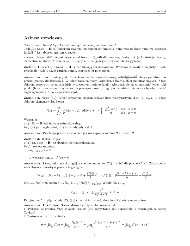 Zadanie 1. Niech f : (a, b) → R bȩdzie funkcja̧ różniczkowalna̧. Wówczas w każdym niepustym podprzedziale (c, d) ⊆ (a, b) istnieja̧ punkty cia̧głości jej pochodnej.