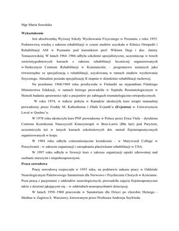 Mgr Maria Suwalska Wykształcenie Jest absolwentką Wyższej Szkoły Wychowania Fizycznego w Poznaniu z roku 1955. Podstawową wiedzę z zakresu rehabilitacji w czasie studiów uzyskała w Klinice Ortopedii i Rehabilitacji AM w Poznaniu pod kierunkiem prof. Wiktora Degi i doc. Janiny Tomaszewskiej. W latach 1964–1966 odbyła szkolenie specjalistyczne, uczestnicząc w trzech sześciotygodniowych kursach z zakresu rehabilitacji leczniczej organizowanych w Stołecznym Centrum Rehabilitacji w Konstancinie – programowo uznanych jako równorzędne ze specjalizacją z rehabilitacji, uzyskiwaną w ramach studiów wychowania fizycznego. Aktualnie posiada specjalizację II stopnia w dziedzinie rehabilitacji ruchowej. Na przełomie 1968/1969 roku przebywała w Finlandii na stypendium Fińskiego Ministerstwa Edukacji, w ramach którego prowadziła w Szpitalu Reumatologicznym w Heinoli badania sprawności ręki u pacjentów po zabiegach reumatologiczno-ortopedycznych. W roku 1974, w trakcie pobytu w Kanadzie ukończyła kurs terapii manualnej prowadzony przez Freddy M. Kaltenborna i Olafa Evjenth’a (Evjentsa) w Uniwersytecie Laval w Quebec’u. W 1978 roku ukończyła kurs PNF prowadzony w Polsce przez Erica Viela – dyrektora Centrum Kształcenia Nauczycieli Kinezyterapii w Bois-Larris (Bła lari) pod Paryżem, uczestniczyła też w innych kursach szkoleniowych dot. metod fizjoterapeutycznych organizowanych w kraju. W 1984 roku odbyła czteromiesięczne kształcenie - w Marywood College w Pensylwanii - w zakresie organizacji i zarządzania placówkami rehabilitacji w USA. W 1997 roku odbyła w Szwecji kurs z zakresu organizacji opieki zdrowotnej nad osobami starszymi i niepełnosprawnymi. Praca zawodowa Pracę zawodową rozpoczęła w 1955 roku, na podstawie nakazu pracy w Oddziale Neurologicznym Państwowego Sanatorium dla Nerwowo i Psychicznie Chorych w Kościanie. Poza pracą z pacjentami z oddziałów neurologicznych, prowadziła zajęcia fizjoterapeutyczne także z dziećmi jąkającymi się – w oddziałach neuropsychiatrii dziecięcej. W latach 1958–1960 pracowała w Sanatorium dla Dzieci po chorobie Heinego Medina w Zagórzu k. Warszawy, kierowanym przez Profesora Andrzeja Seyfrieda. Kolejną pracę w latach 1960-1974, podjęła w Centralnym Szpitalu Klinicznym MSW w Warszawie, w którym na podstawie wieloletniej praktyki i własnych badań opracowała skuteczną metodę 3-etapowego leczenia zachowawczego wrodzonego mięśniowego kręczu szyi u dzieci. W latach 1962–1979 pracowała także w Instytucie Reumatologicznym w Warszawie. W Klinice Reumatologii w Oddziale Rehabilitacji kierowanym przez prof. Marię Sadowską Wróblewską, poza pracą fizjoterapeuty, uczestniczyła w pracach naukowych, dotyczących m.in. wydolności wysiłkowej pacjentów z zzsk i rzs, wpływu fizjoterapii na aktywność procesu chorobowego, zachowawczej korekcji przykurczu stawów kolanowych, profilaktyki zniekształceń ręki, itp. Od 1975 roku kierowała działem kinezyterapii w Zakładzie Rehabilitacji Instytutu Reumatologicznego, prowadzonym przez prof. Andrzeja Seyfrieda i prowadziła rehabilitację pacjentów w Klinice Kardiologiczno - Kardiochirurgicznej Instytutu Reumatologicznego. W 1979 roku przyjęła propozycję pracy w Departamencie Profilaktyki, Lecznictwa i Rehabilitacji w Ministerstwie Zdrowia i Opieki Społecznej, pracując początkowo na stanowiskach starszego specjalisty, głównego specjalisty, a następnie naczelnika Wydziału Rehabilitacji Medycznej. Pracę na etacie w Ministerstwie zakończyła w marcu 2002 roku. W następnych latach podejmowała zadaniową współpracę w Departamencie Zdrowia Publicznego oraz w Departamencie Nauki i Szkolnictwa Wyższego Ministerstwa Zdrowia. Praca dydaktyczna Mgr Maria Suwalska zajmowała się również pracą dydaktyczną. W Instytucie Reumatologicznym prowadziła wykłady na kursach organizowanych dla lekarzy i fizjoterapeutów, programowała indywidualne szkolenia z zakresu rehabilitacji reumatologicznej, prowadziła wykłady dla studentów fizjoterapii z Finlandii i Szwecji. Pracując w Akademii Wychowania Fizycznego w Warszawie, w latach 1979–2000 prowadziła wykłady oraz zajęcia na bazie klinicznej - dla studentów wydziału rehabilitacji z zakresu patomechaniki, kinezyterapii i rehabilitacji. Jest autorką lub współautorką ponad 30 opracowań z zakresu rehabilitacji osób niepełnosprawnych, fizjoterapii klinicznej i kształcenia fizjoterapeutów. Prace zostały opublikowane w medycznych czasopismach naukowych i wydawnictwach kongresowych. Do najważniejszych należą dwa rozdziały w podręczniku pt. Fizjoterapia opracowanym pod redakcją Mariana Weissa i Andrzeja Zembatego, wydanym w 1983 i 1987 r. oraz w 1986 r. w języku rosyjskim. Do ważniejszych publikacji można zaliczyć także udział Pani Marii Suwalskiej przy opracowywaniu dokumentów programowych np. weryfikacja polskiej wersji 2 dokumentu Rady Europy pn. „Rekomendacja Komitetu Ministrów w Sprawie Spójnej Polityki na Rzecz Osób Niepełnosprawnych”, współdziałanie w realizowaniu „Narodowego Programu Profilaktyki i Leczenia Udaru Mózgu”, współuczestnictwo w opracowaniu Raportu Ekspertów pn. „Postępowanie Rehabilitacyjne po udarze mózgu” (2003), udział w przygotowaniu rekomendacji ekspertów dotyczącej „Profilaktyki wad postawy u dzieci w środowisku nauczania i wychowania”(2008). Działalność społeczna Niezależnie od pracy zawodowej, bardzo intensywna była działalność społeczna Pani mgr Marii Suwalskiej, w krajowych i zagranicznych organizacjach, działających na rzecz ludzi niepełnosprawnych. Od 1961 roku Pani Maria Suwalska była członkiem Polskiego Towarzystwa Walki z Kalectwem. W latach 1963–1968 pełniła funkcję przewodniczącej Sekcji Magistrów Wychowania Fizycznego Pracujących w Rehabilitacji Oddziału Warszawskiego. Od 1968–1971 r. była sekretarzem, w latach 1971–1974 wiceprzewodniczącą, a w kadencji 1974–1