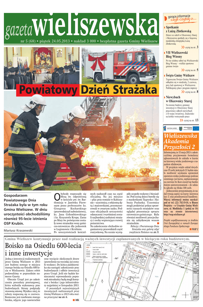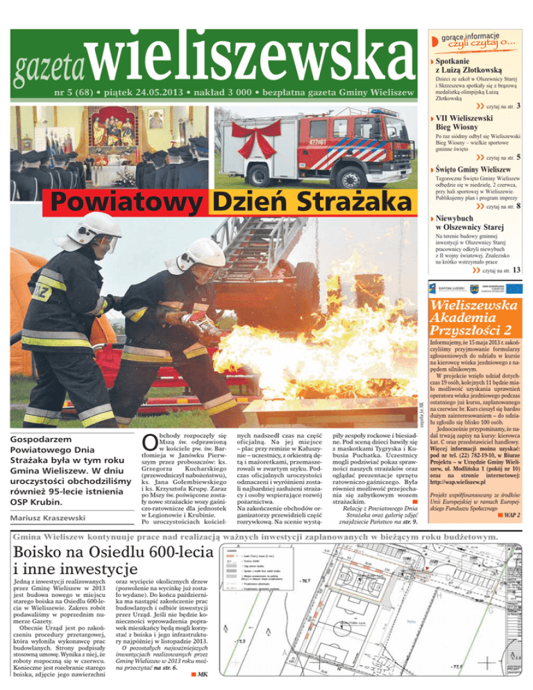 w Spotkanie z Luizà Z∏otkowskà Dzieci ze szkó∏ w Olszewnicy Starej i Skrzeszewa spotka∏y si´ z bràzowà medalistkà olimpijskà Luizà Z∏otkowskà áá czytaj na str. 3 nr 5 (68) • piàtek 24.05.2013 • nak∏ad 3 000 • bezp∏atna gazeta Gminy Wieliszew w VII Wieliszewski Bieg Wiosny Po raz siódmy odby∏ si´ Wieliszewski Bieg Wiosny – wielkie sportowe gminne Êwi´to áá czytaj na str. 5 w Âwi´to Gminy Wieliszew Tegoroczne Âwi´to Gminy Wieliszew odb´dzie si´ w niedziel´, 2 czerwca, przy hali sportowej w Wieliszewie. Publikujemy plan i program imprezy Powiatowy Dzieƒ Stra˝aka áá czytaj na str. 8 w Niewybuch w Olszewnicy Starej Na terenie budowy gminnej inwestycji w Olszewnicy Starej pracownicy odkryli niewybuch z II wojny Êwiatowej. Znalezisko na krótko wstrzyma∏o prace áá czytaj na str. 13 wszystkie fot. MK Wieliszewska Akademia Przysz∏oÊci 2 Gospodarzem Powiatowego Dnia Stra˝aka była w tym roku Gmina Wieliszew. W dniu uroczystoÊci obchodziliÊmy równie˝ 95-lecie istnienia OSP Krubin. Mariusz Kraszewski bchody rozpocz´∏y si´ Mszà Êw. odprawionà w koÊciele pw. Êw. Bart∏omieja w Janówku Pierwszym przez proboszczów: ks. Grzegorza Kucharskiego (przewodniczy∏ nabo˝eƒstwu), ks. Jana Go∏embiewskiego i ks. Krzysztofa Krup´. Zaraz po Mszy Êw. poÊwi´cone zosta∏y nowe stra˝ackie wozy gaÊniczo-ratownicze dla jednostek w Legionowie i Krubinie. Po uroczystoÊciach koÊciel- O nych nadszed∏ czas na cz´Êç oficjalnà. Na jej miejsce – plac przy remizie w Ka∏uszynie – uczestnicy, z orkiestrà d´tà i ma˝oretkami, przemaszerowali w zwartym szyku. Podczas oficjalnych uroczystoÊci odznaczeni i wyró˝nieni zostali najbardziej zas∏u˝eni stra˝acy i osoby wspierajàce rozwój po˝arnictwa. Na zakoƒczenie obchodów organizatorzy przewidzieli cz´Êç rozrywkowà. Na scenie wystà- pi∏y zespo∏y rockowe i biesiadne. Pod scenà dzieci bawi∏y si´ z maskotkami Tygryska i Kubusia Puchatka. Uczestnicy mogli podziwiaç pokaz sprawnoÊci naszych stra˝aków oraz oglàdaç prezentacje sprz´tu ratowniczo-gaÊniczego. By∏a równie˝ mo˝liwoÊç przejechania si´ zabytkowym wozem n stra˝ackim. Relacj´ z Powiatowego Dnia Stra˝aka oraz galeri´ zdj´ç znajdziecie Paƒstwo na str. 9. Informujemy, ˝e 15 maja 2013 r. zakoƒczyliÊmy przyjmowanie formularzy zg∏oszeniowych do udzia∏u w kursie na kierowc´ wózka jezdniowego z nap´dem silnikowym. W projekcie wzi´∏o udzia∏ dotychczas 19 osób, kolejnych 11 b´dzie mia∏o mo˝liwoÊç uzyskania uprawnieƒ operatora wózka jezdniowego podczas ostatniego ju˝ kursu, zaplanowanego na czerwiec br. Kurs cieszy∏ si´ bardzo du˝ym zainteresowaniem – do udzia∏u zg∏osi∏o si´ blisko 100 osób. JednoczeÊnie przypominamy, ˝e nadal trwajà zapisy na kursy: kierowca kat. C oraz przedstawiciel handlowy. Wi´cej informacji mo˝na uzyskaç: pod nr tel. (22) 782-19-10, w Biurze Projektu – w Urz´dzie Gminy Wieliszew, ul. Modliƒska 1 (pokój nr 10) oraz na stronie internetowej: http://wap.wieliszew.pl Projekt wspó∏finansowany ze Êrodków Unii Europejskiej w ramach Europejskiego Funduszu Spo∏ecznego n WAP 2 Gmina Wieliszew kontynuuje prace nad realizacjà wa˝nych inwestycji zaplanowanych w bie˝àcym roku bud˝etowym. Boisko na Osiedlu 600-lecia i inne inwestycje Jednà z inwestycji realizowanych przez Gmin´ Wieliszew w 2013 jest budowa nowego w miejscu starego boiska na Osiedlu 600-lecia w Wieliszewie. Zakres robót podawaliÊmy w poprzednim numerze Gazety. Obecnie Urzàd jest po zakoƒczeniu procedury przetargowej, która wy∏oni∏a wykonawc´ prac budowlanych. Strony podpisa∏y stosownà umow´.Wynika z niej, ˝e roboty rozpocznà si´ w czerwcu. Konieczne jest rozebranie starego boiska, zdj´cie jego nawierzchni oraz wyci´cie okolicznych drzew (pozwolenie na wycink´ ju˝ zosta∏o wydane). Do koƒca paêdziernika ma nastàpiç zakoƒczenie prac budowlanych i odbiór inwestycji przez Urzàd. JeÊli nie b´dzie koniecznoÊci wprowadzenia poprawek mieszkaƒcy b´dà mogli korzystaç z boiska i jego infrastruktury najpóêniej w listopadzie 2013. O pozosta∏ych najwa˝niejszych inwestycjach realizowanych przez Gmin´ Wieliszew w 2013 roku mo˝na przeczytaç na str. 6. n MK gazeta wieliszewska x 24 maja 2013 2 Rafał BryÊ Szanowny Panie Wójcie, w zwiàzku z ogłoszeniem na stronie BIP Wieliszew – http://www.bip.wieliszew.pl/public/?id=120719 dotyczàcym projektu studium uwarunkowaƒ i kierunków zagospodarowania przestrzennego gminy Wieliszew, mam pytanie, czy istnieje inna mo˝liwoÊç zapoznania si´ z planem poza osobistym stawieniem si´ w siedzibie Urz´du Gminy? Czy byłaby mo˝liwoÊç zamieszczenia projektu w formie dokumentu elektronicznego na stronie BIP Wieliszew? Pozdrawiam Paweł Kownacki Wójt Gminy Wieliszew Szanowny Panie Rafale uprzejmie informuj´, i˝ projekt studium uwarunkowaƒ i kierunków zagospodarowania przestrzennego Gminy Wieliszew b´dzie równie˝ dost´pny na stronie biuletynu informacji publicznej www.bip.wieliszew.pl w okresie jego wyło˝enia do publicznego wglàdu – t. j. w dniach od 16.05.2013 r. do 28.06.2013 r. DU˚E DZIECI, czyli wypowiedzi na powa˝ne tematy PAWE¸EK Pojecha∏bym kina na film „Mambo, Lula i piraci”, i ja lubi´ s∏ony popcorn to bym zjad∏ w tym kinie. EMILKA Chcia∏abym malowaç z rodzicami jakiÊ taki ∏adny obrazek i chcia∏abym pojechaç w góry z rodzicami i mojà starszà siostrà. rozmawia∏a Magda Pietrzak, wszystkie fot. MP W tym numerze zapytaliÊmy dzieci z Przedszkola Samorzàdowego nr 2 w Wieliszewie „MÓJ WYMARZONY DZIE¡ DZIECKA?” JULIA Ja to na kulki chc´ jechaç, a potem na lody, z mojà siostrà tatà i mamà. I do kina, a potem mo˝e do ZOO, tak wszyscy razem. JULIAN Ja bym chcia∏bym mieç bardzo fajny dzieƒ, troch´ lodów zjeÊç i pójÊç na spacer i bardzo bym chcia∏ pojeêdziç na rowerze z tatà. Poznaj pracownika Gminy Nie lubi nudy Przedstawiamy