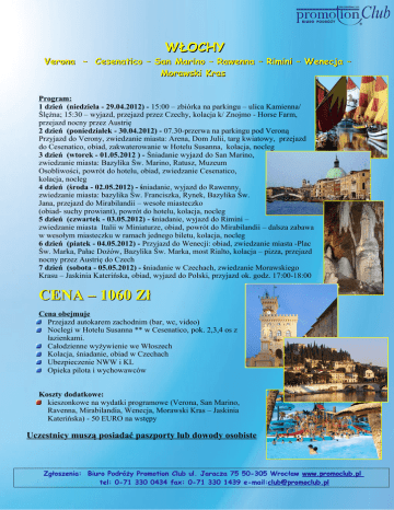 WŁOCHY Verona – Cesenatico – San Marino – Rawenna – Rimini – Wenecja – Morawski Kras Program: 1 dzień (niedziela - 29.04.2012) - 15:00 – zbiórka na parkingu – ulica Kamienna/ Ślężna; 15:30 – wyjazd, przejazd przez Czechy, kolacja k/ Znojmo - Horse Farm, przejazd nocny przez Austrię 2 dzień (poniedziałek - 30.04.2012) - 07.30-przerwa na parkingu pod Veroną Przyjazd do Verony, zwiedzanie miasta: Arena, Dom Julii, targ kwiatowy, przejazd do Cesenatico, obiad, zakwaterowanie w Hotelu Susanna, kolacja, nocleg 3 dzień (wtorek - 01.05.2012 ) - Śniadanie wyjazd do San Marino, zwiedzanie miasta: Bazylika Św. Marino, Ratusz, Muzeum Osobliwości, powrót do hotelu, obiad, zwiedzanie Cesenatico, kolacja, nocleg 4 dzień (środa - 02.05.2012) - śniadanie, wyjazd do Rawenny, zwiedzanie miasta: bazylika Św. Franciszka, Rynek, Bazylika Św. Jana, przejazd do Mirabilandii – wesołe miasteczko (obiad- suchy prowiant), powrót do hotelu, kolacja, nocleg 5 dzień (czwartek - 03.05.2012) - śniadanie, wyjazd do Rimini – zwiedzanie miasta Italii w Miniaturze, obiad, powrót do Mirabilandii – dalsza zabawa w wesołym miasteczku w ramach jednego biletu, kolacja, nocleg 6 dzień (piatek - 04.05.2012) - Przyjazd do Wenecji: obiad, zwiedzanie miasta -Plac Św. Marka, Pałac Dożów, Bazylika Św. Marka, most Rialto, kolacja – pizza, przejazd nocny przez Austrię do Czech 7 dzień (sobota - 05.05.2012) - śniadanie w Czechach, zwiedzanie Morawskiego Krasu – Jaskinia Katerińska, obiad, wyjazd do Polski, przyjazd ok. godz. 17:00-18:00 CENA – 1060 Zł Cena obejmuje Przejazd autokarem zachodnim (bar, wc, video) Noclegi w Hotelu Susanna ** w Cesenatico, pok. 2,3,4 os z łazienkami. Całodzienne wyżywienie we Włoszech Kolacja, śniadanie, obiad w Czechach Ubezpieczenie NWW i KL Opieka pilota i wychowawców Koszty dodatkowe: kieszonkowe na wydatki programowe (Verona, San Marino, Ravenna, Mirabilandia, Wenecja, Morawski Kras – Jaskinia Katerińska) - 50 EURO na wstępy Uczestnicy muszą posiadać paszporty lub dowody osobiste Zgłoszenia: Biuro Podróży Promotion Club ul. Jaracza 75 50-305 Wrocław www.promoclub.pl tel: 0-71 330 0434 fax: 0-71 330 1439 e-mail:[email protected]